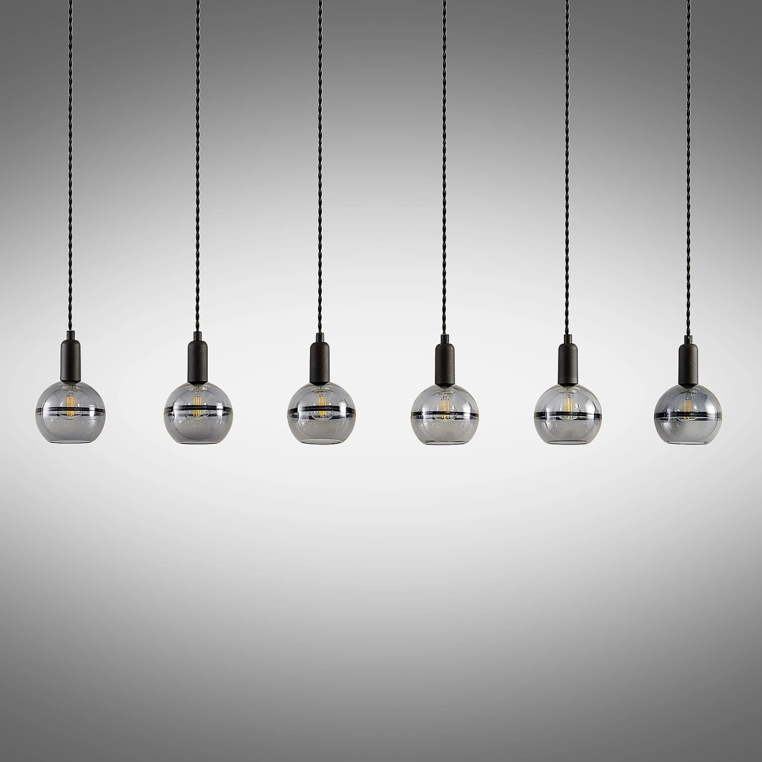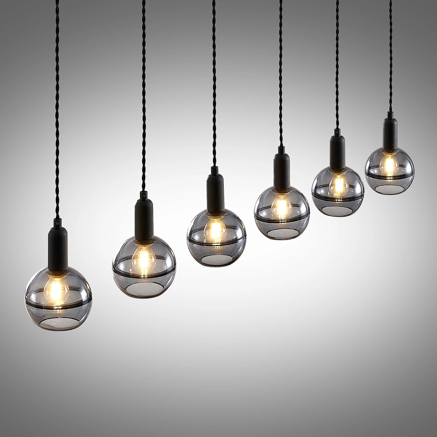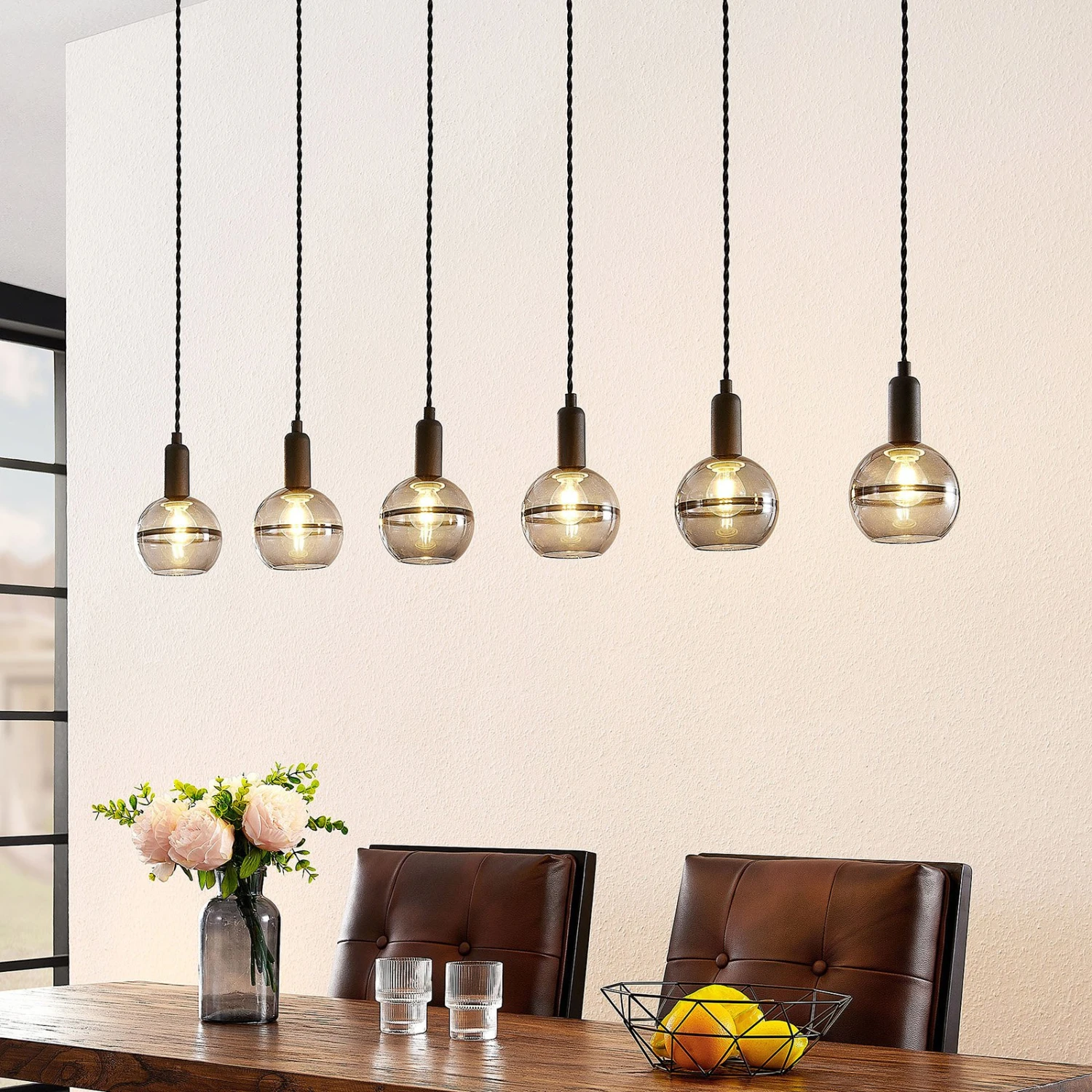 Auch für größere Tische: die längliche Essplatz-Pendelleuchte Ably mit sechs Rauchglasschirmen