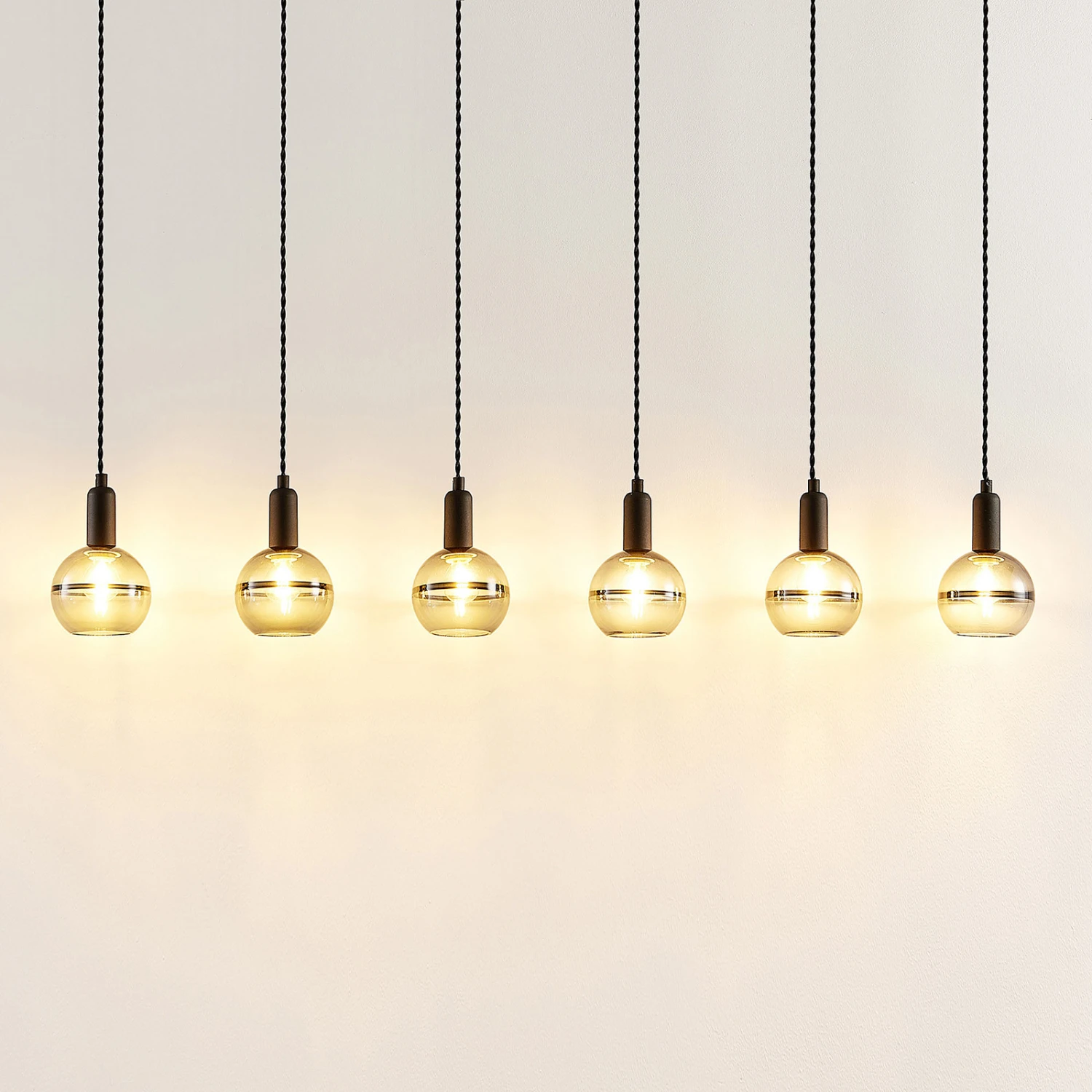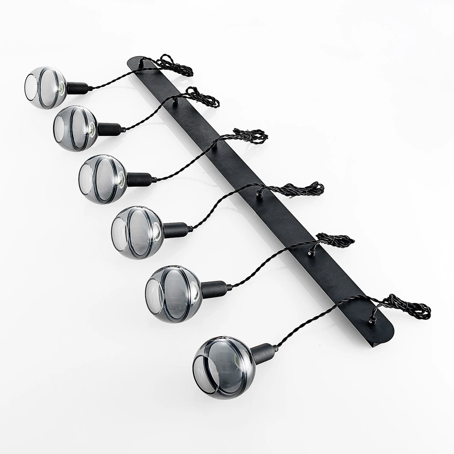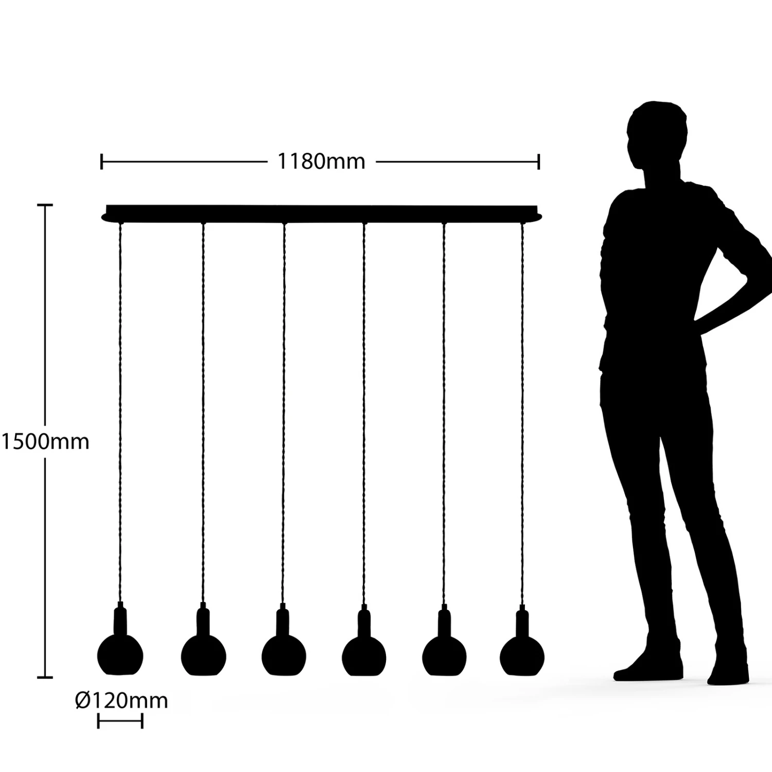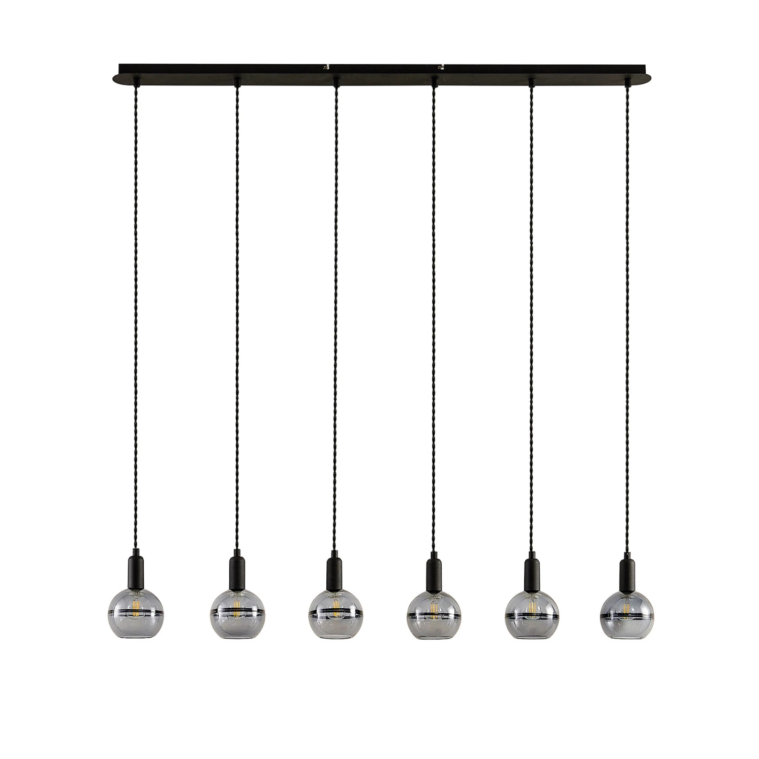 Auch für größere Tische: die längliche Essplatz-Pendelleuchte Ably mit sechs Rauchglasschirmen