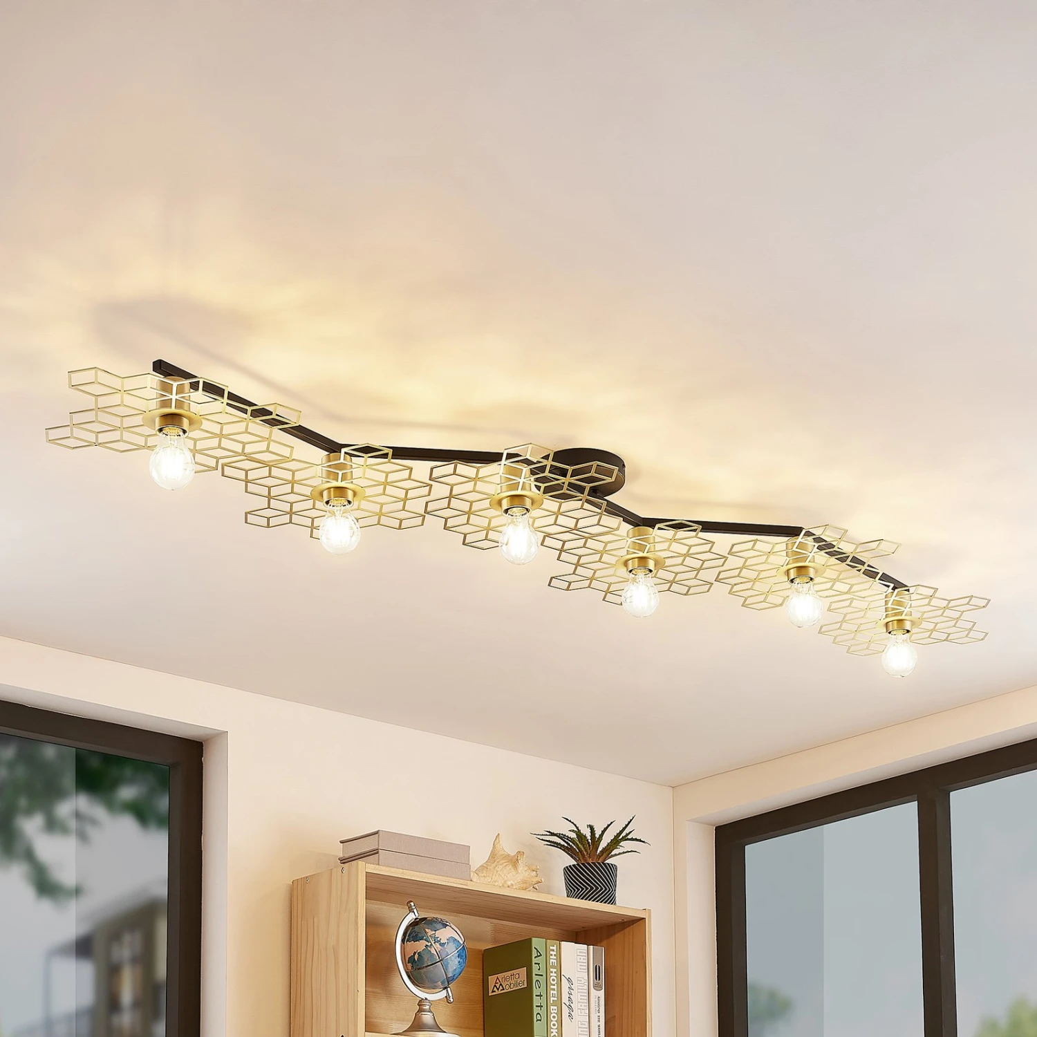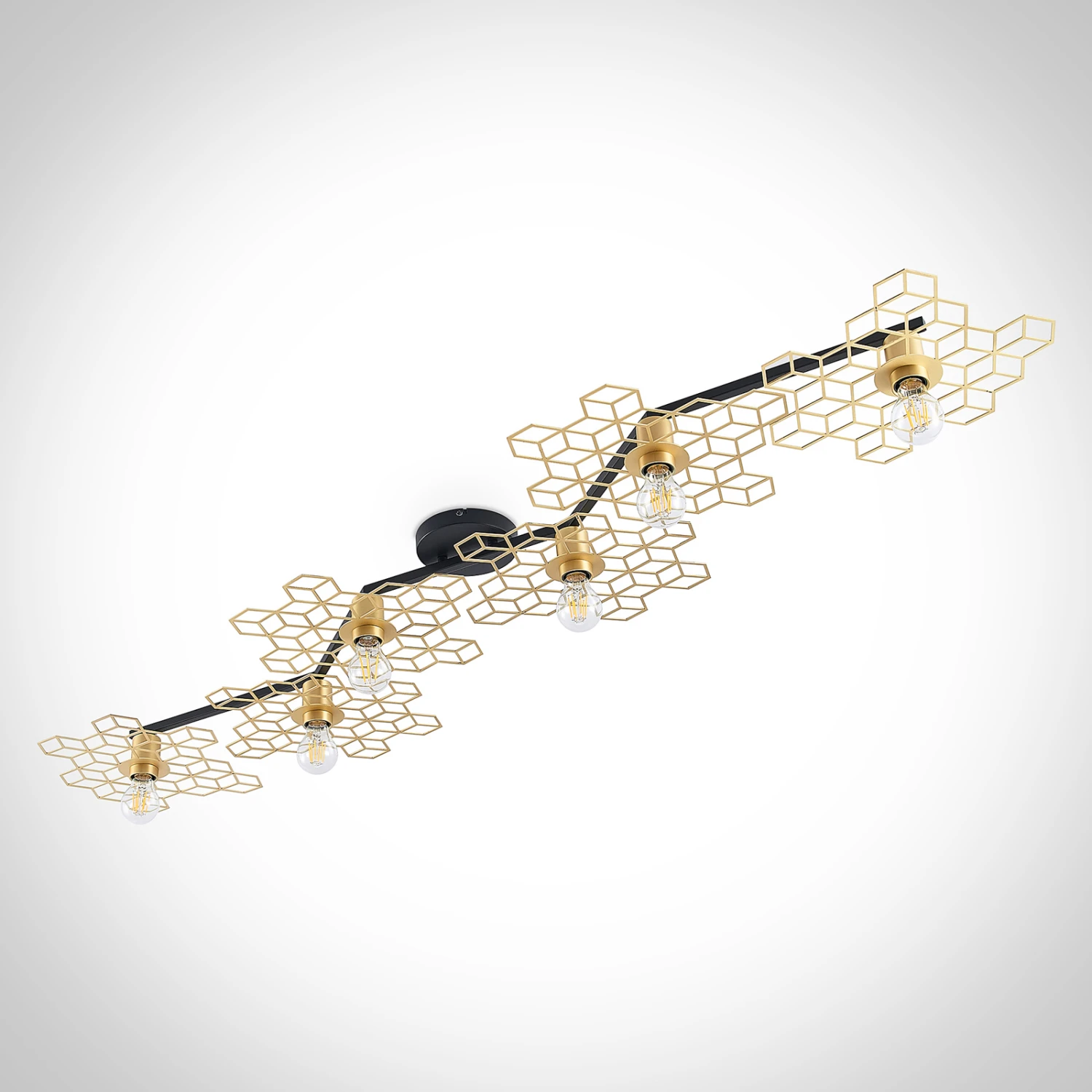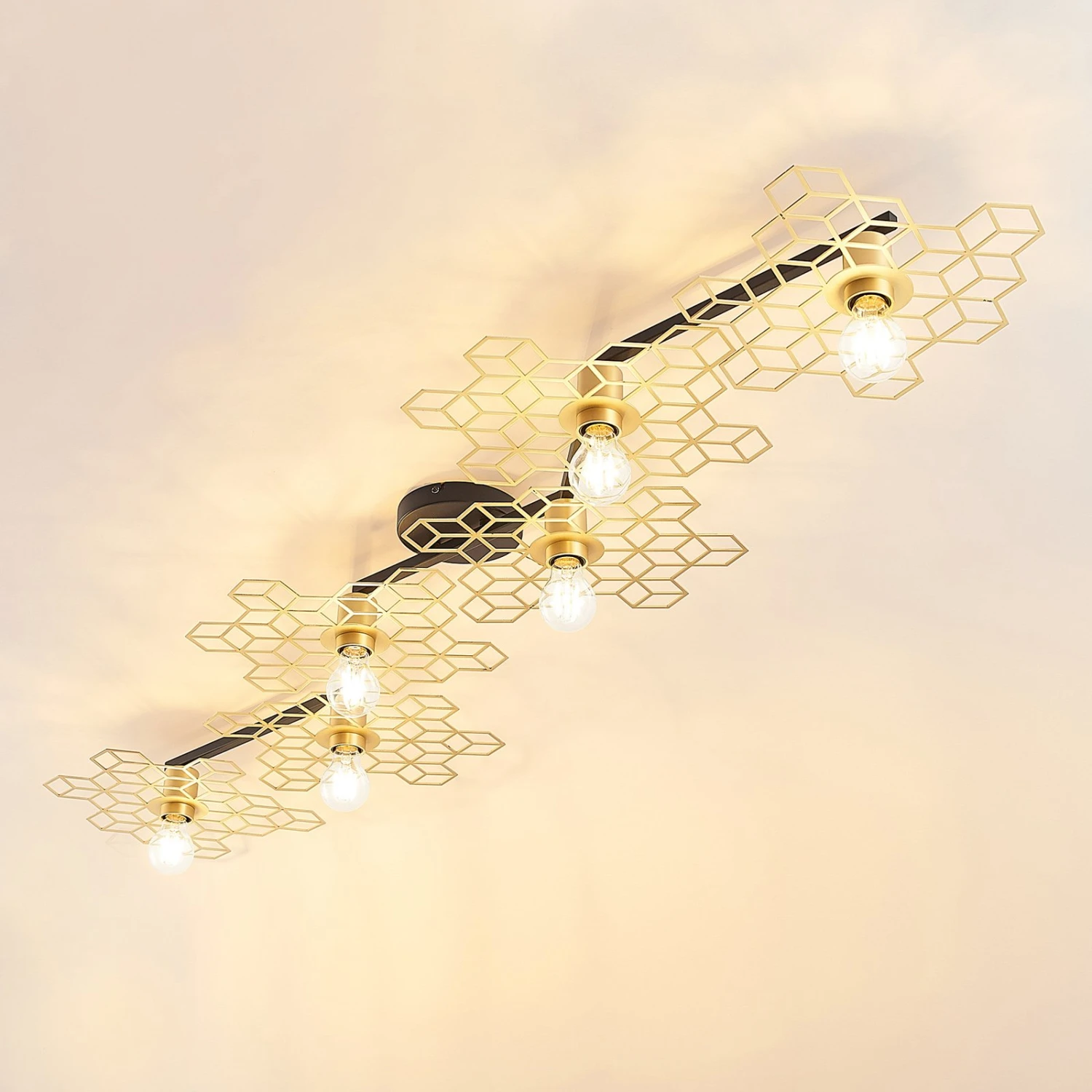 Hochwertige Design-Deckenleuchte Alexaru in länglicher Form mit goldenem Finish, sechsflammig