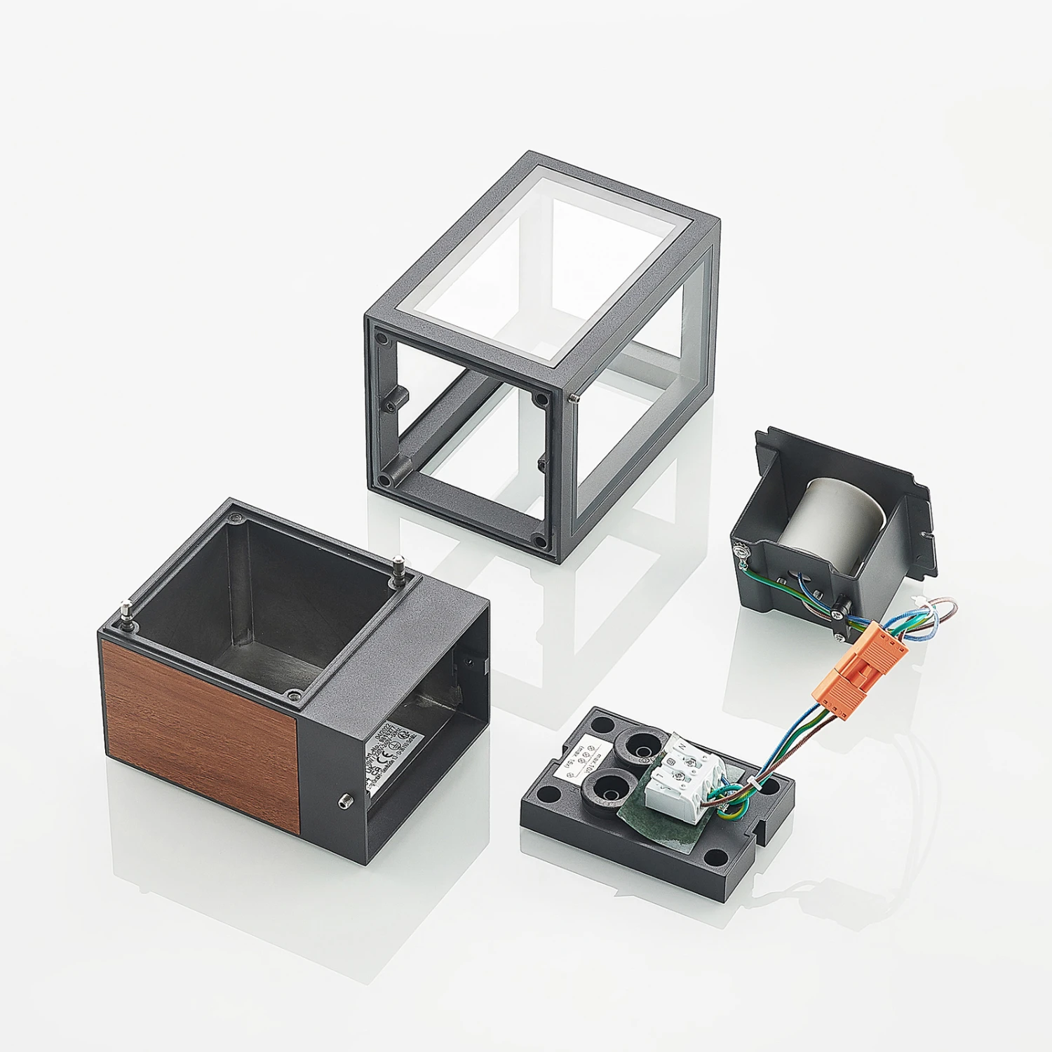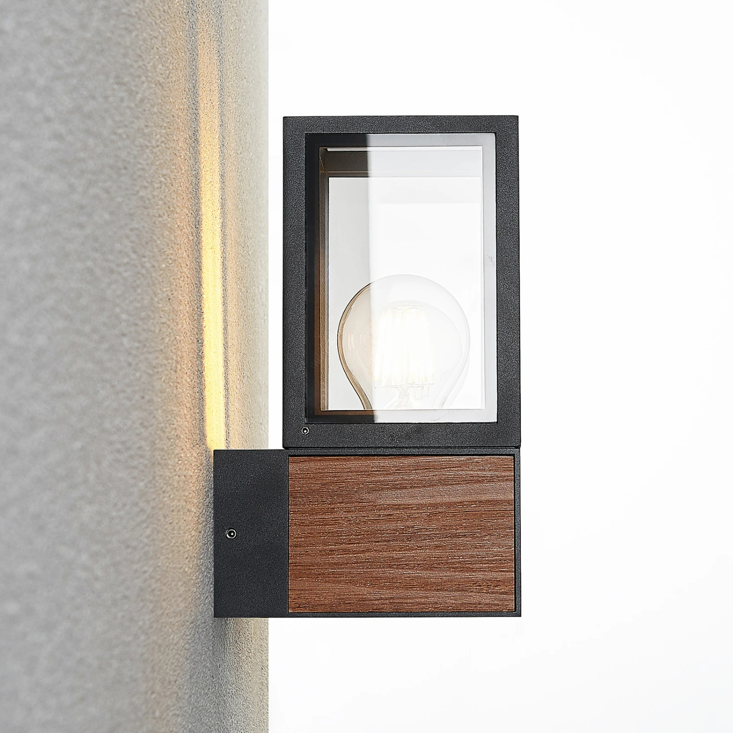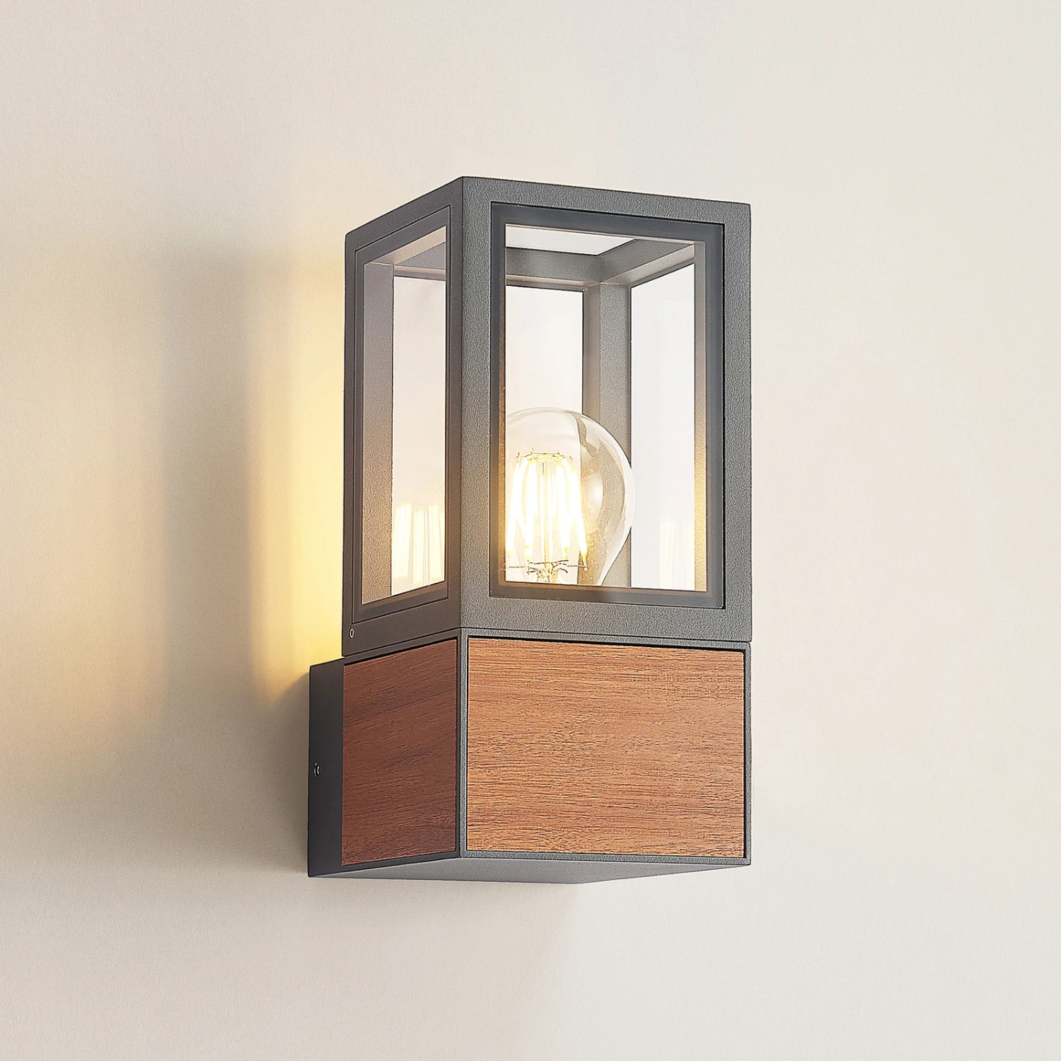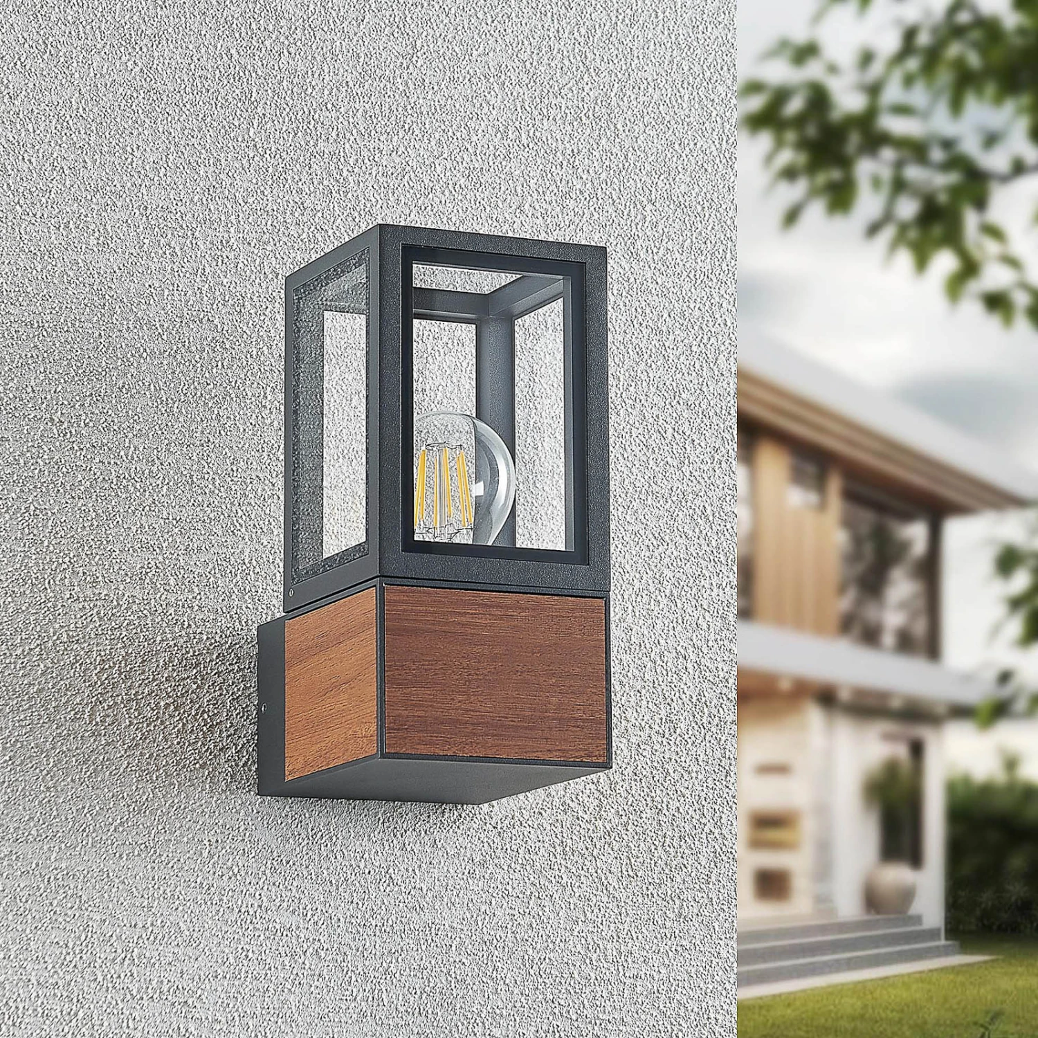 Alleria passt gut zu vielen modernen Umgebungen, ist aber auch eine Außenwandleuchte, die mit dem Element in Holzoptik etwas Natürliches verströmt. Der Leuchtenkorpus ist eckig und geradlinig und gleicht einem Rahmen, der mit Klarglasscheiben ausgestattet ist. Die Leuchte ist gut abgedichtet und erreicht so eine hohe Schutzart, wodurch der Einsatz im Außenbereich bedenkenlos möglich ist. Die einzusetzende Lampe kann frei gewählt werden und für eine passende und stilechte Optik hinter dem Klarglas passen energiesparende LED-Filamentlampen besonders gut, da diese den Stil klassischer Glühlampen imitieren, dabei aber viel energiesparender sind.