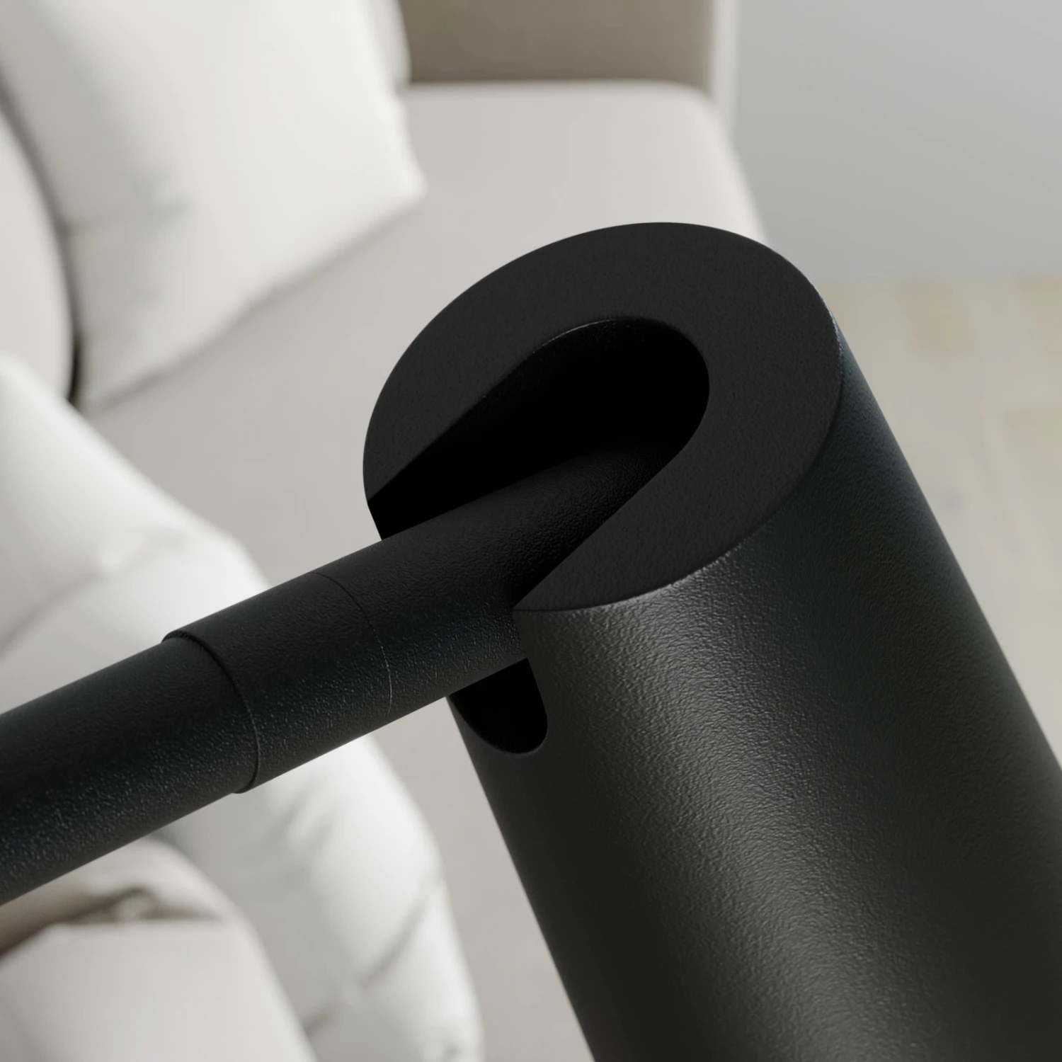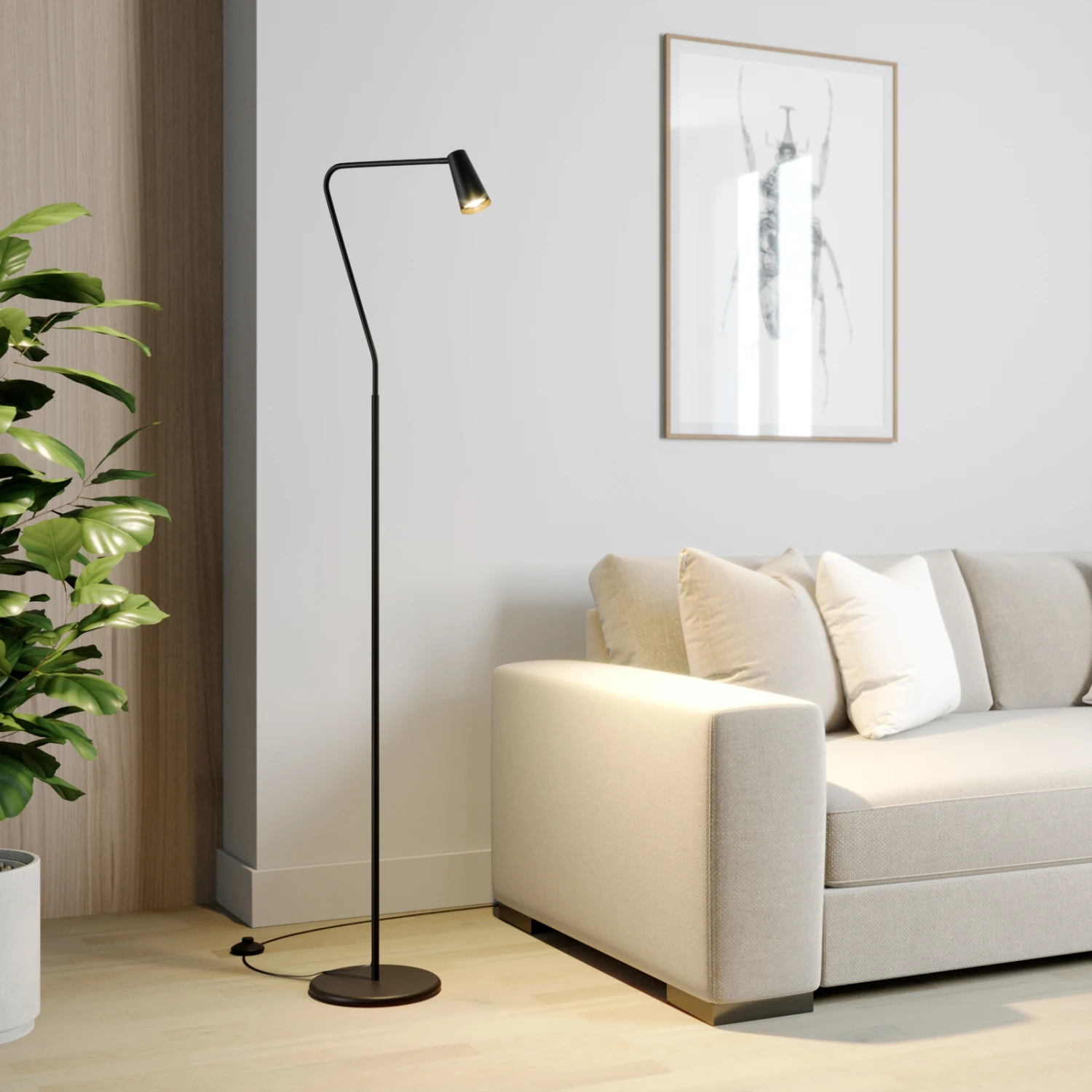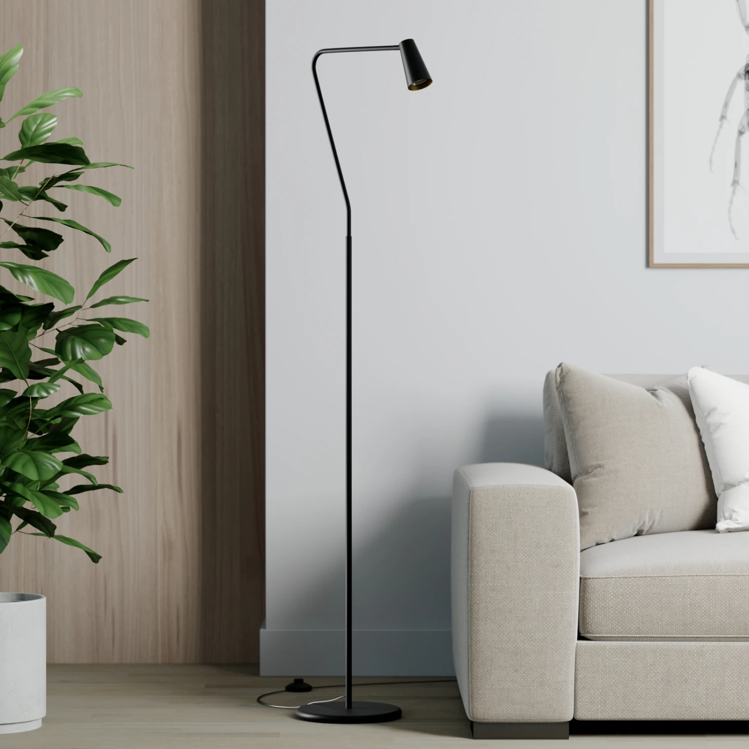Angelina ist ein moderner Lichtspender mit klarem Ausdruck, bei dem bewusst auf unnötige Details verzichtet worden ist. Die Stehleuchte eignet sich perfekt als Leseleuchte und kann zum Beispiel in Reichweite des Sofas platziert werden, wenn man es sich dort gemütlich macht und ein Buch liest oder in einer Zeitschrift blättert. Dabei kann der schmale Leuchtkopf aus Metall etwas ausgerichtet werden. Er ähnelt einem Becher und ist außen schwarz, innen jedoch goldfarben, was angenehme Lichtreflexionen bewirkt, die sehr gemütlich und warmtönig erscheinen. Geschaltet wird die Stehlampe über einen Fußschalter in der Zuleitung und zum Einsatz kommen sollten LED-Lampen mit GU10-Sockel.