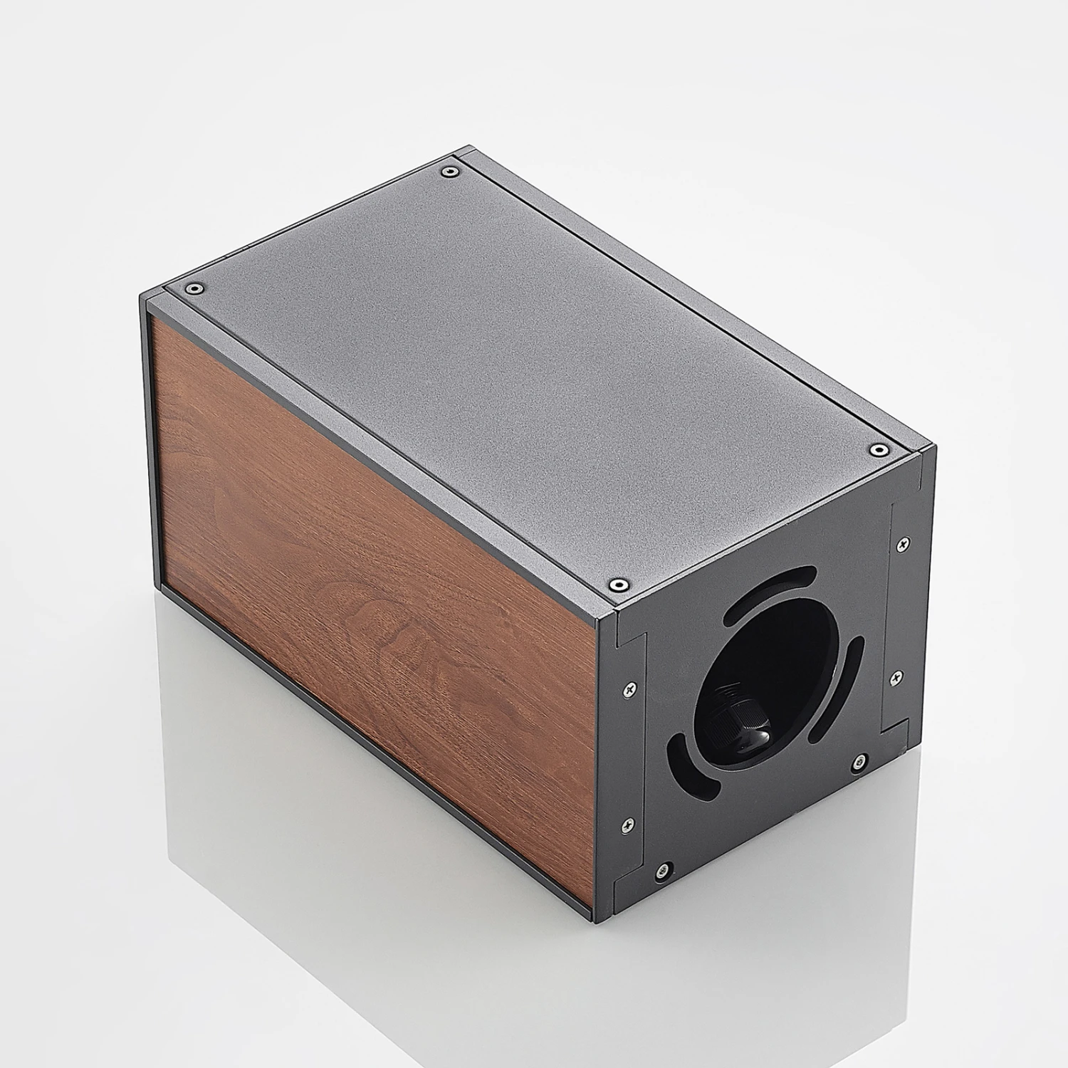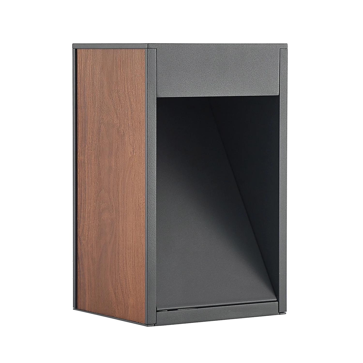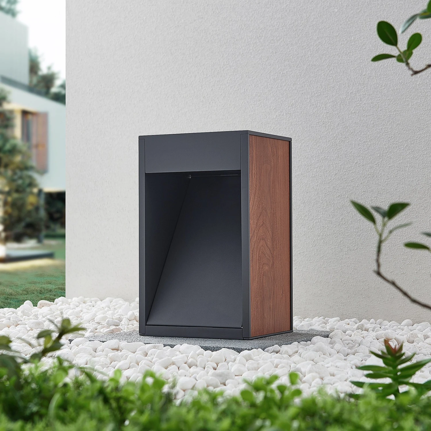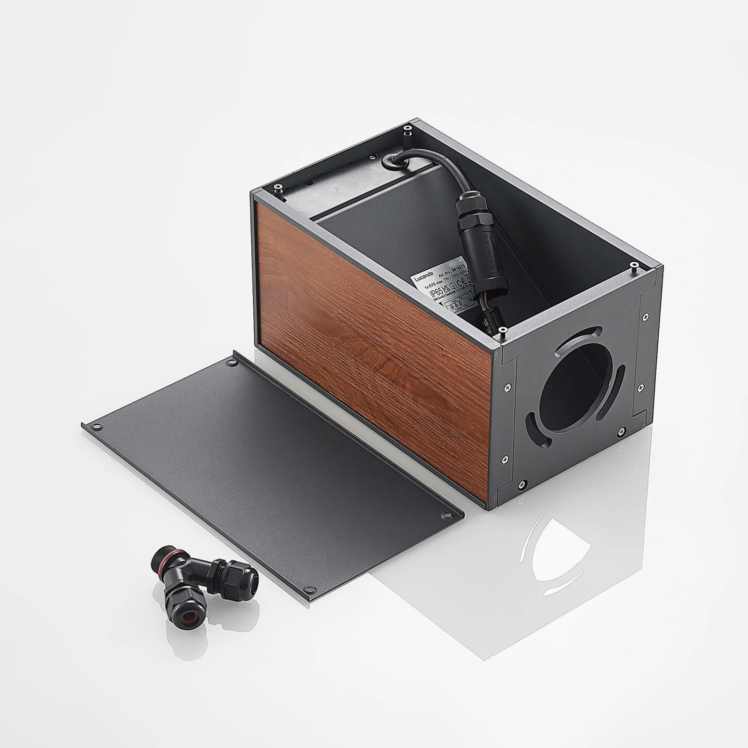 Der Korpus der Sockelleuchte Ansala wurde aus Aluminiumdruckguss mit dunkelgrauem Finish gearbeitet und an den Seiten mit Holzapplikationen in warmem Holzton dekoriert. Die Lichtquelle sitzt oben in der Leuchte und strahlt ihr Licht durch die schräge Platte in der Leuchte gelenkt nach vorne in Richtung des Bodens. Das macht diese Sockelleuchte zur idealen Leuchte für den Gartenbereich. Das schöne Design passt hervorragend zu einer modernen Umgebung – ob als einzelne Leuchte oder in Kombination zu mehreren Exemplaren.