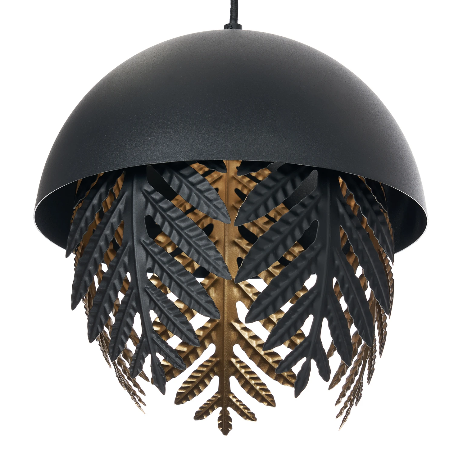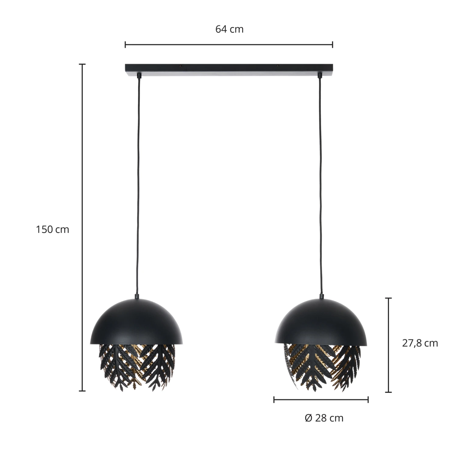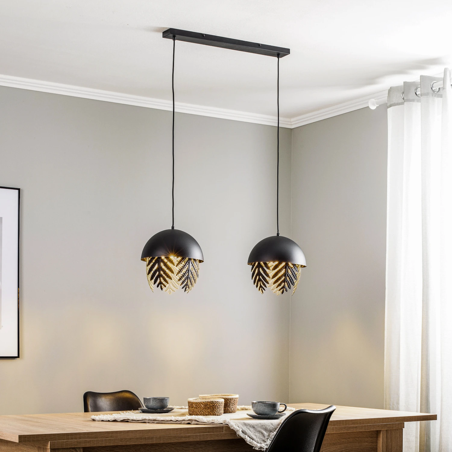 Aparas ist eine Pendelleuchte, die sich sehr gut für den Einsatz über einem Estisch eignet. Sie ist zweiflammig und die beiden Schirme gleichen oben einer Halbkugel, während unten farnartige Blätter aus Metall den Abschluss bilden und für eine tolle Optik sorgen und ebenso ein sehr schönes Lichtbild kreieren. Die Leuchte zeichnet sich durch ein besonderes und einzigartiges Design aus und an der Innenseite sind die Schirme golden, was sehenswert ist und auch die Lichtwirkung beeinflusst und mit einer warmen Note ausstattet. Die Textilkabel runden das Erscheinungsbild in markantem Schwarz sehr passend ab.
