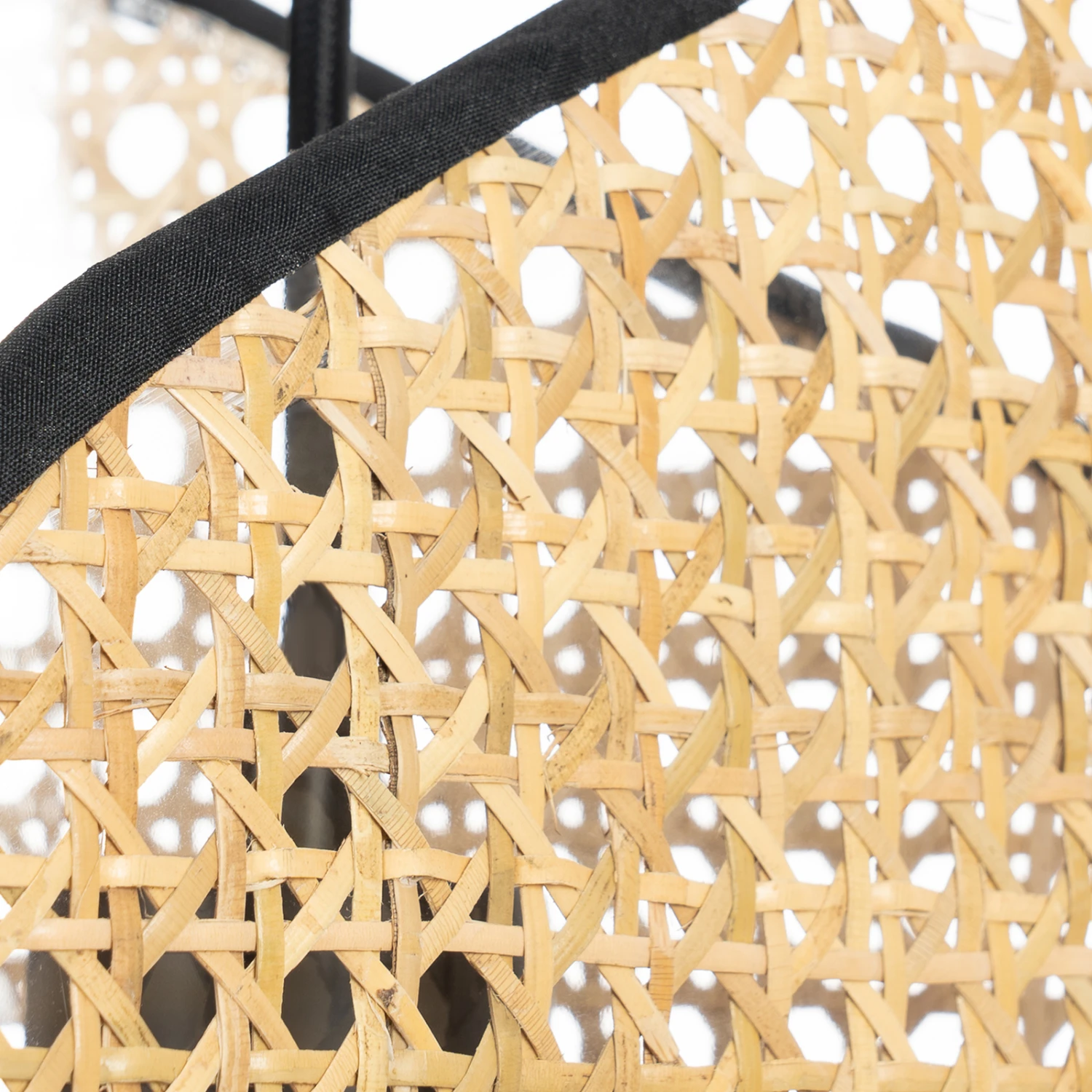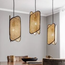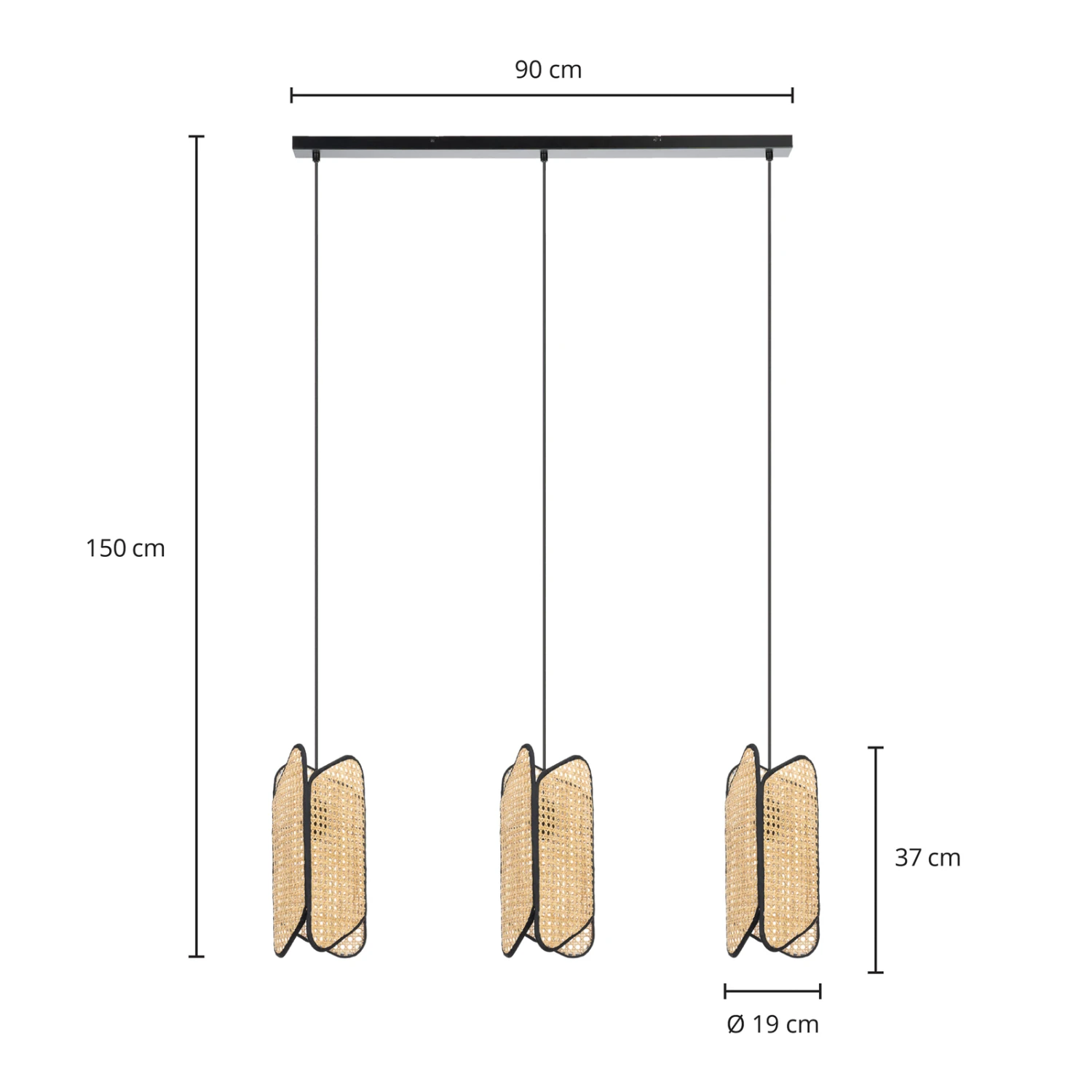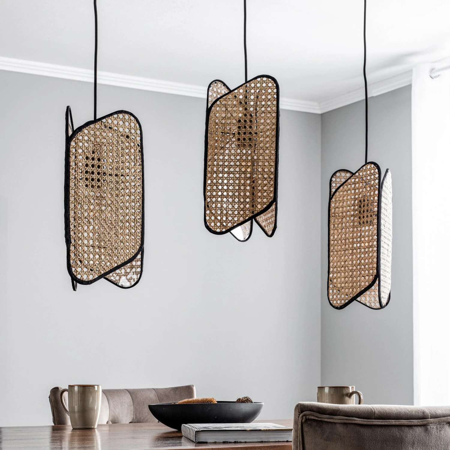 Dreiflammige Design-Pendelleuchte Bassiola mit dreiseitigen Lampenschirmen aus Bambus im Wiener Geflecht