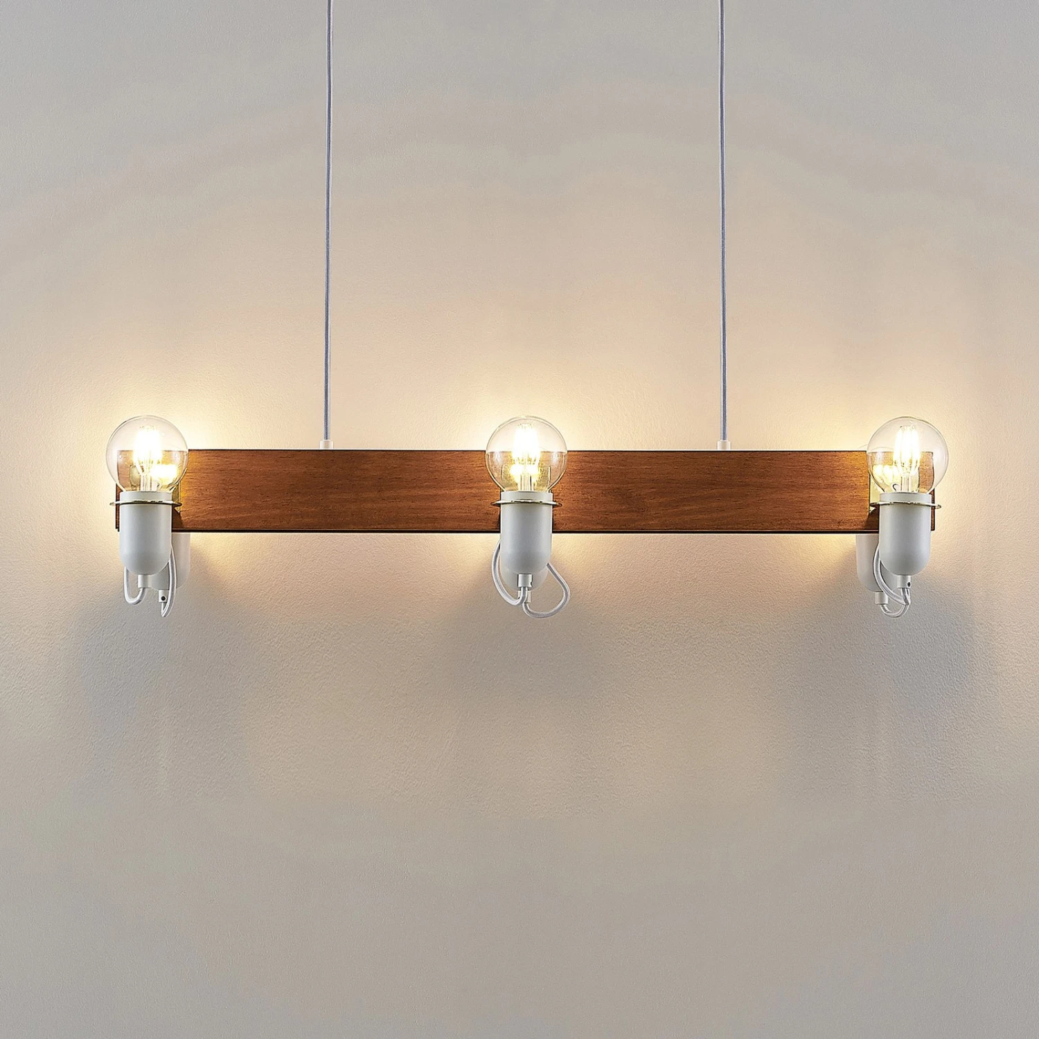 Becky ist ein sehenswerter Lichtspender, der in erster Linie für die Anbringung über einem Tisch oder einem Tresen gedacht ist. Der Holzbalken hat ein leichtes Antikfinish mit etwas dunklerem Anstrich, während die metallenen Lampenfassungen alle weiß lackiert worden sind. Ihre Ausrichtung is nach oben, so dass jede einzusetzende Lampe ihr Licht nach oben abgibt. Für eine formvollendete Optik und gemütlichen Lichtschein kann auch der Einsatz von Kopfspiegellampen durchaus in Betracht gezogen werden, die dann ein indirekteres Licht aussenden. Dank der Sechsflammigkeit ist je nach Leuchtmittelwahl eine grundsätzlich gute und helle Tischbeleuchtung gewährleistet. Das Design der Pendellampe ist modern und detailreduziert und passt auch zu skandinavischen Einrichtungsstilen gut, wo der Fokus oft auf einer Mischung von warmer Ausstrahlung und natürlichen Materialien sowie einer reduzierten, eher minimalistischen Formsprache liegt.