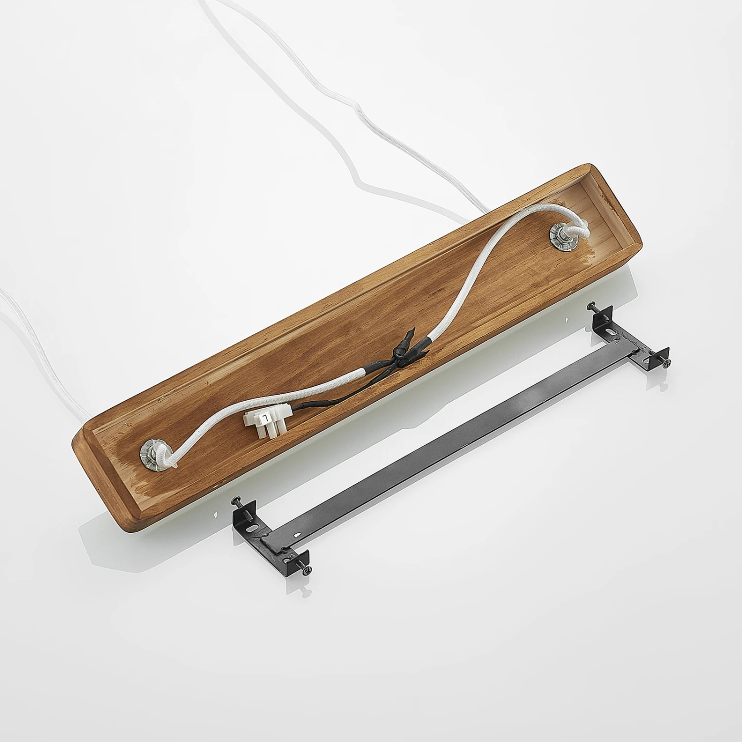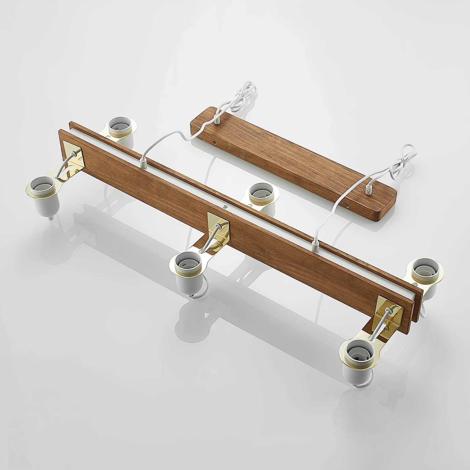 Sechsflammige Balkenpendelleuchte Becky mit nach oben strahlenden Lampen und Holzbalken in Antikoptik