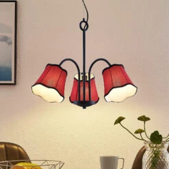 Dreiflammige Esszimmerleuchte Binta mit rostroten Lampenschirmen aus Stoff