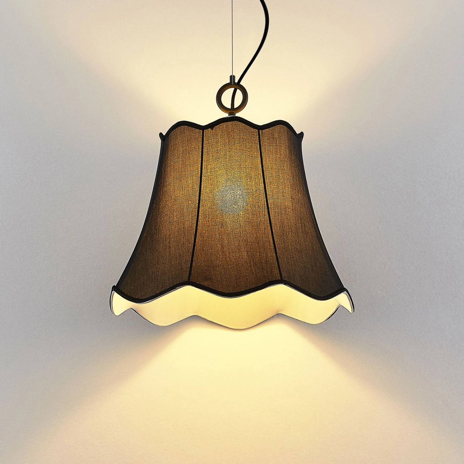 Das Design ist bei dieser Hängeleuchte exklusiv und die schwarze Tönung des Schirms bewirkt eine verstärkte Abblendung des Lichtscheins, so dass das Licht im Raum mit Binta besonders gemütlich erscheint. Der Textilschirm schließt oben und unten wellenförmig ab, so dass die Pendellampe eine optische Verbindung zu traditionellen Bezügen herstellt und einen angesagten Vintagelook verkörpert, der eine gewisse Nostalgie erkennen lässt. Schön für ein Schlafzimmer und andere Wohnbereiche!