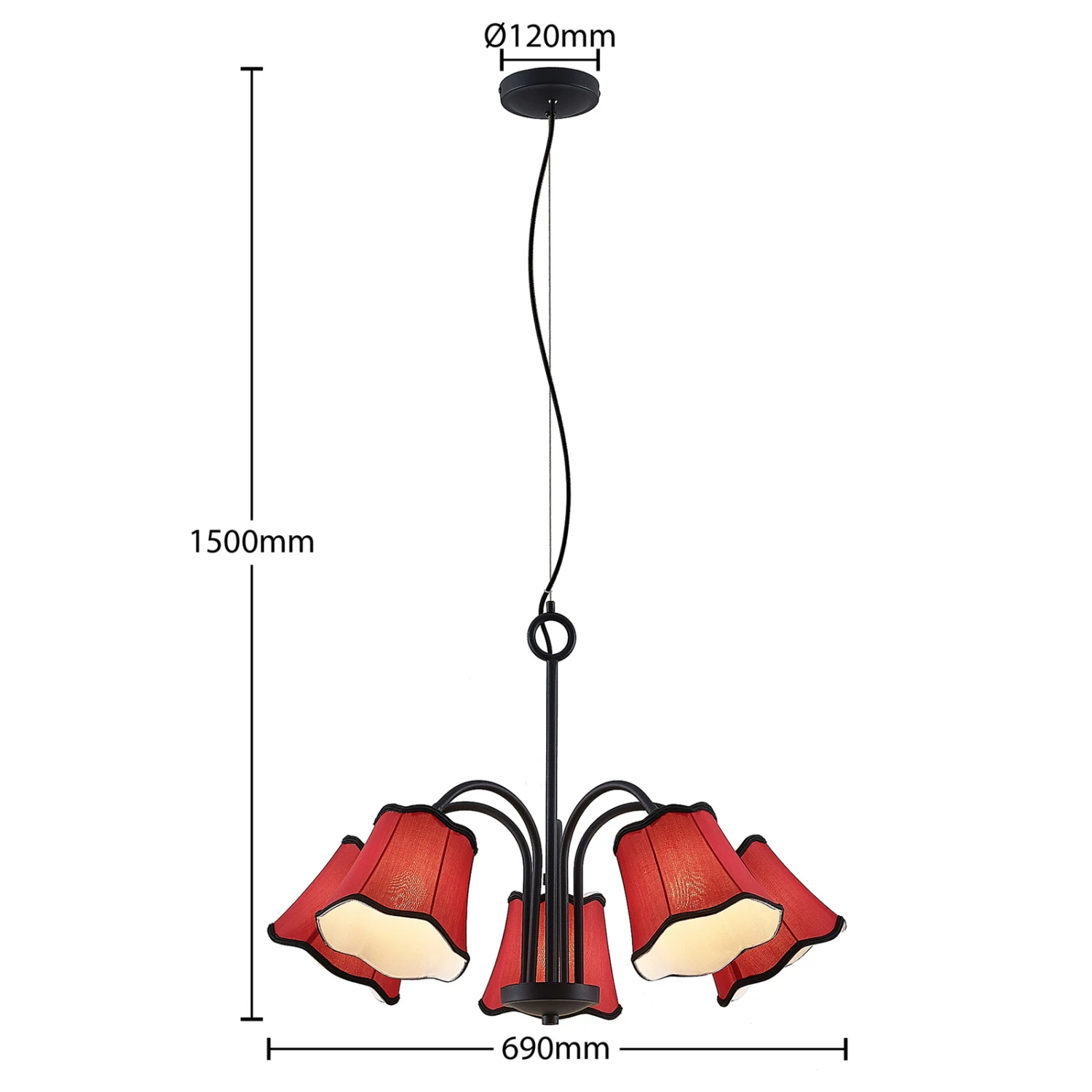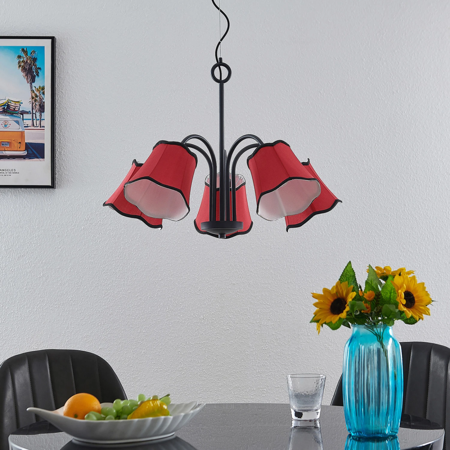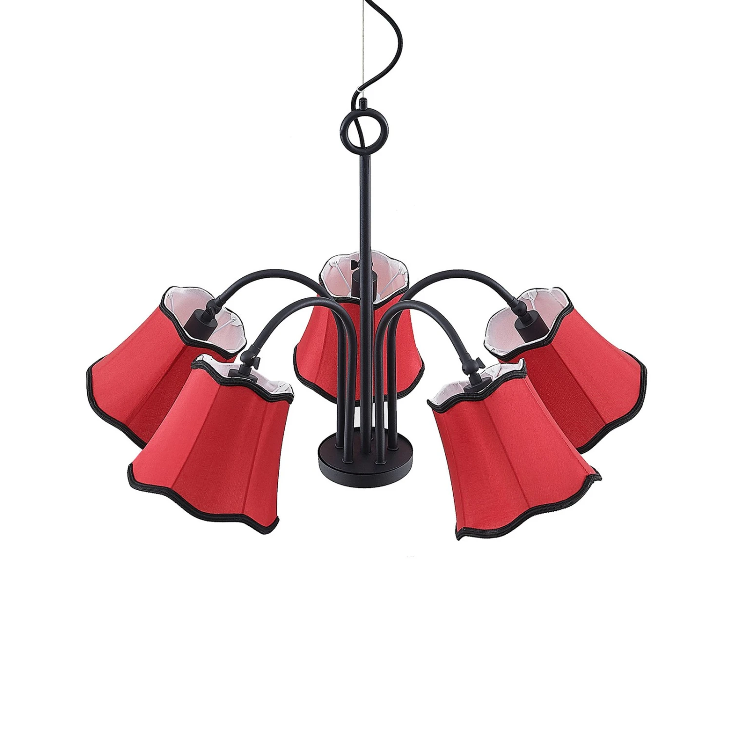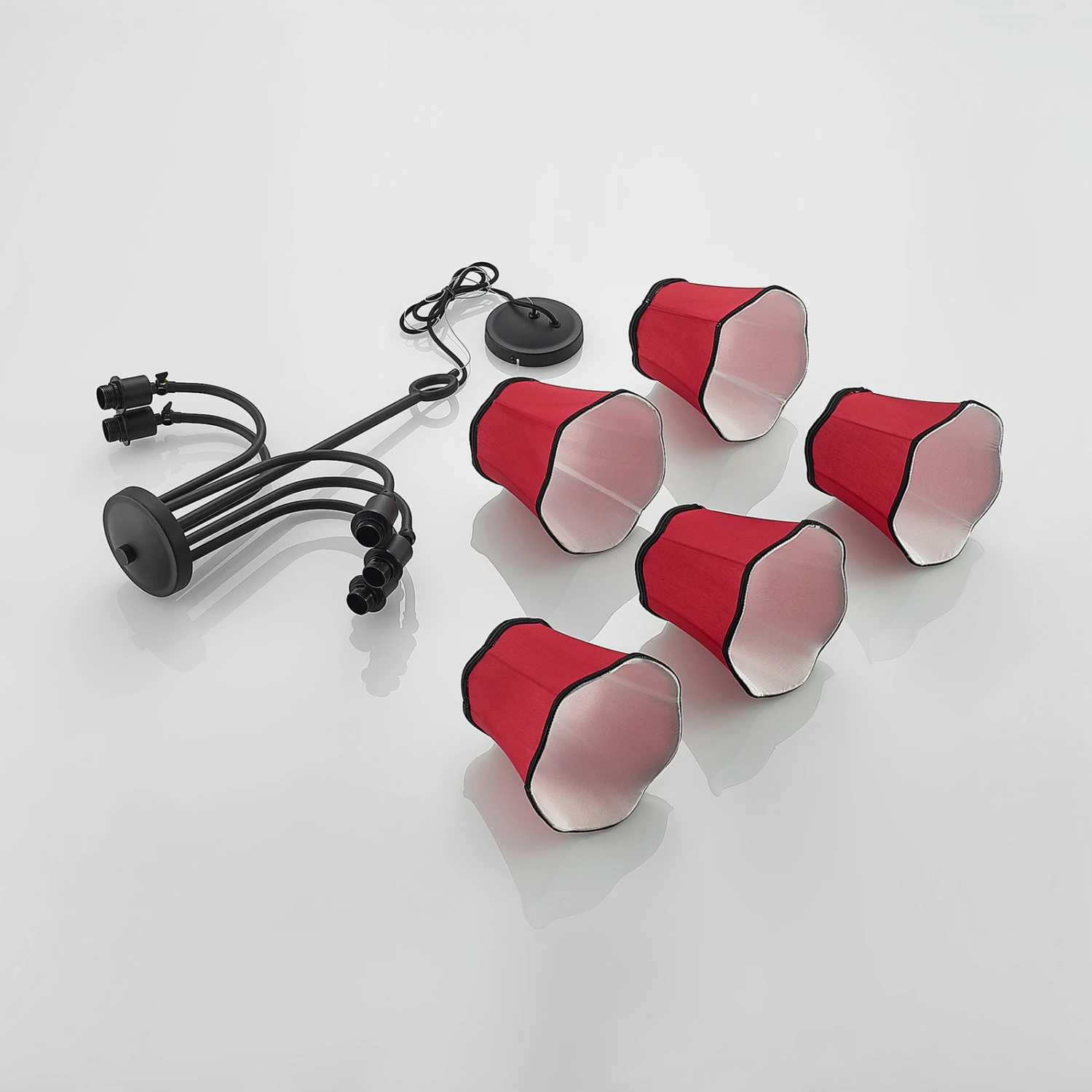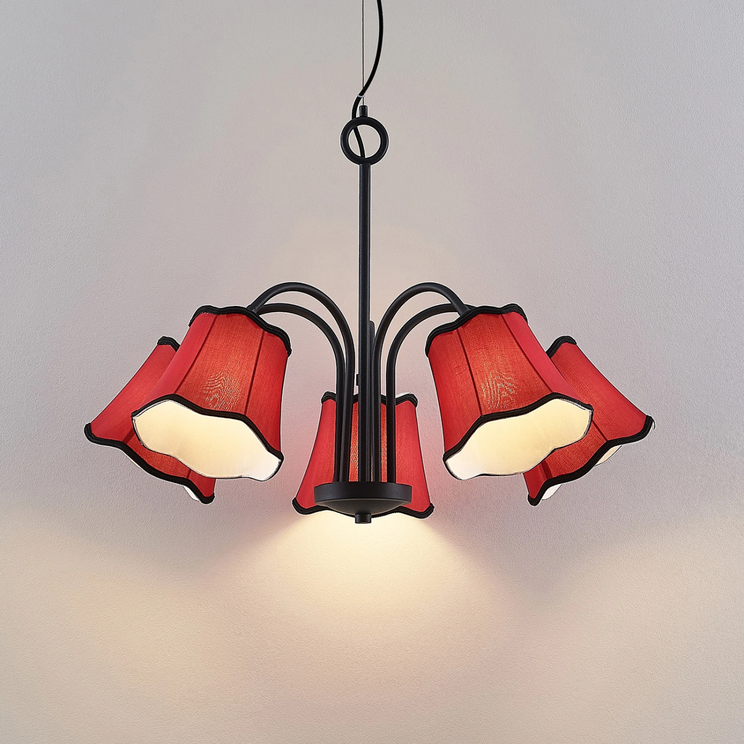 Esszimmer-Hängeleuchte Binta mit fünf rötlichen Lampenschirmen aus Stoff
