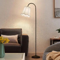 Diese Stehlampe hat einen schwarzen Eisenfuß, der in das Gestell übergeht und im oberen Teil gebogen ist, so dass der Schirm und der Lichtaustritt nach unten gerichtet sind. Damit kann diese Stehlampe auch gut neben einer Sitz- oder Liegegelegenheit positioniert werden, um dort als Leselicht zu dienen. Es handelt sich bei der Stoffstehleuchte um einen Lichtspender mit exklusivem Design, bei dem der silbergraue Lampenschirm der Blickfang ist. Dieser hat einen gewellten Rand und er erscheint damit besonders nostalgisch, weil er an die Lichtspender aus längst vergangenen Jahrzehnten erinnert und damit einen gewissen Vintage-Charakter in den Wohnraum bringt.