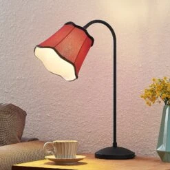 Nostalgische Design-Tischleuchte Binta mit rötlichem Lampenschirm im Vintagelook und schwarzem Gestell