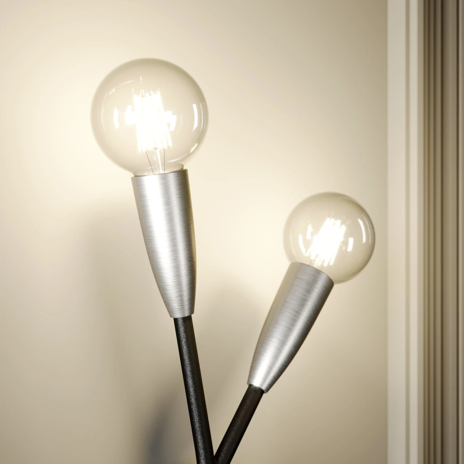 Carlea ist ein attraktives Beleuchtungselement für Flure und Wohnzimmer. Das schwarze Gestell besteht aus einem verzweigten Metallelement und hat zudem unterhalb der Lampenfassungen nickelfarbene Elemente, die einen harmonischen Kontrast bewirken. Das designorientierte Erscheinungsbild passt gut zu modernen Einrichtungen und bei der Wahl der E27-Lampen sollte auf eine passende Optik geachtet werden, die zum Beispiel Filamentlampen zu bieten haben, weil sie wie klassische Glühlampen zumeist aus einem klaren Glaskolben bestehen.