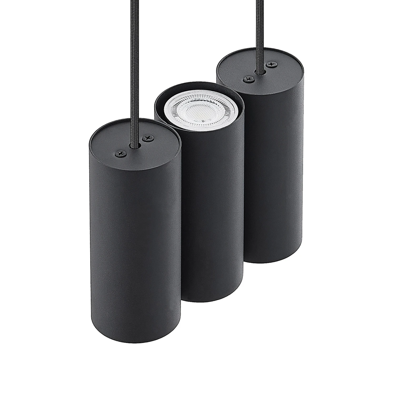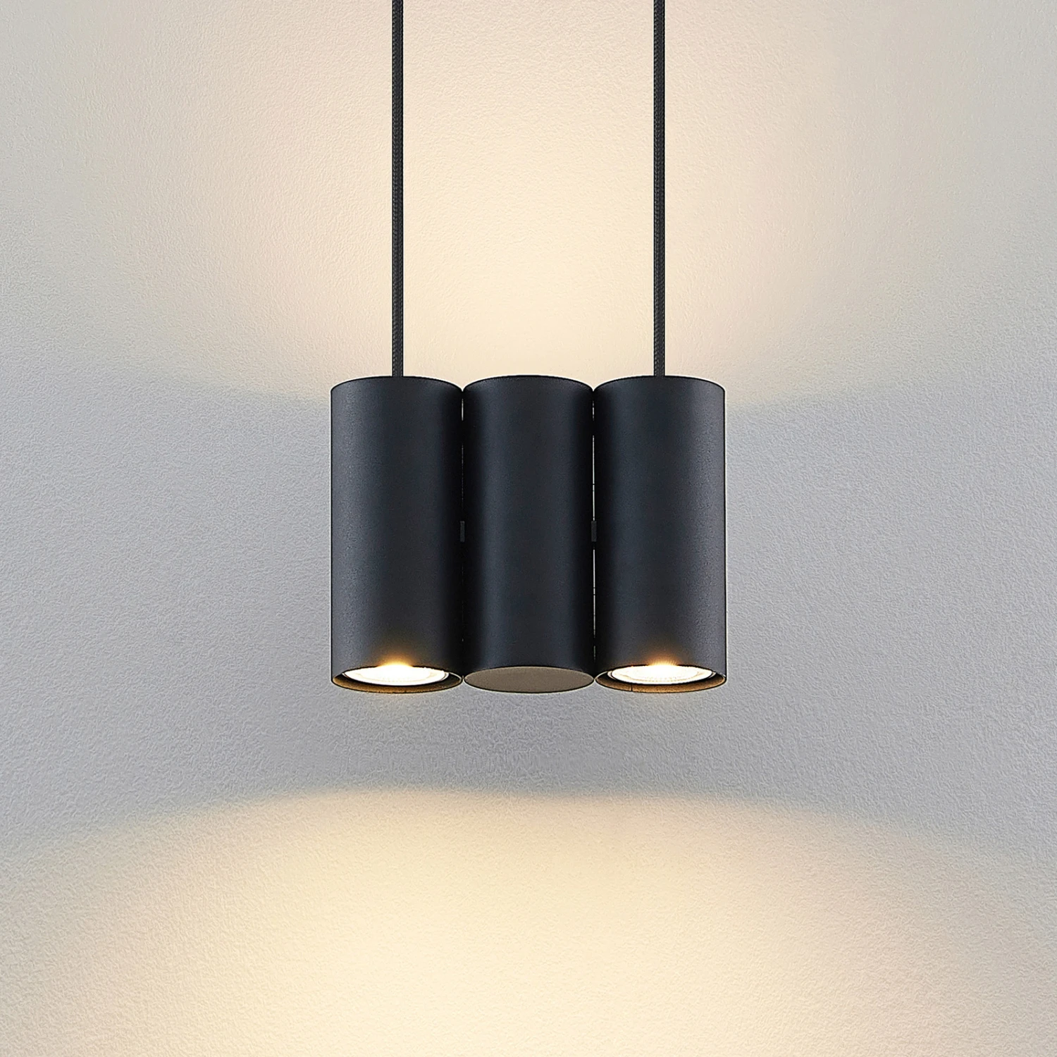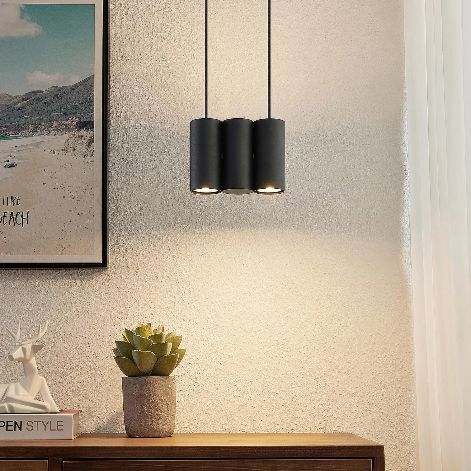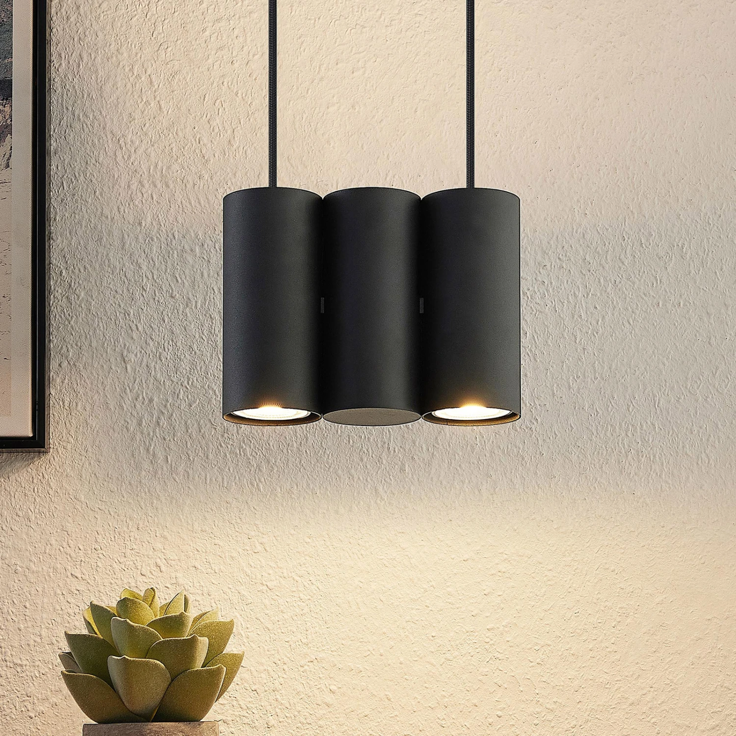 Die schlanke Hängelampe Cesur besitzt einen robusten Charakter und ein schlankes Design. Sie besteht aus einem gebündelten Leuchtenschirm, der aus drei röhrenförmigen Schirme besteht und mit drei Leuchtmitteln bestückt werden kann. Zwei der Schirme sind nach unten ausgerichtet, während der dritte nach oben zeigt, wodurch eine interessante Beleuchtung entsteht. Die sandschwarze Farbgebung rundet das markante Design der Leuchte ab und integriert sich gut in verschiedene Einrichtungsstile. Die Hängeleuchte Cesur eignet sich hervorragend für die Installation in einem Wohnzimmer oder über einem Esstisch.