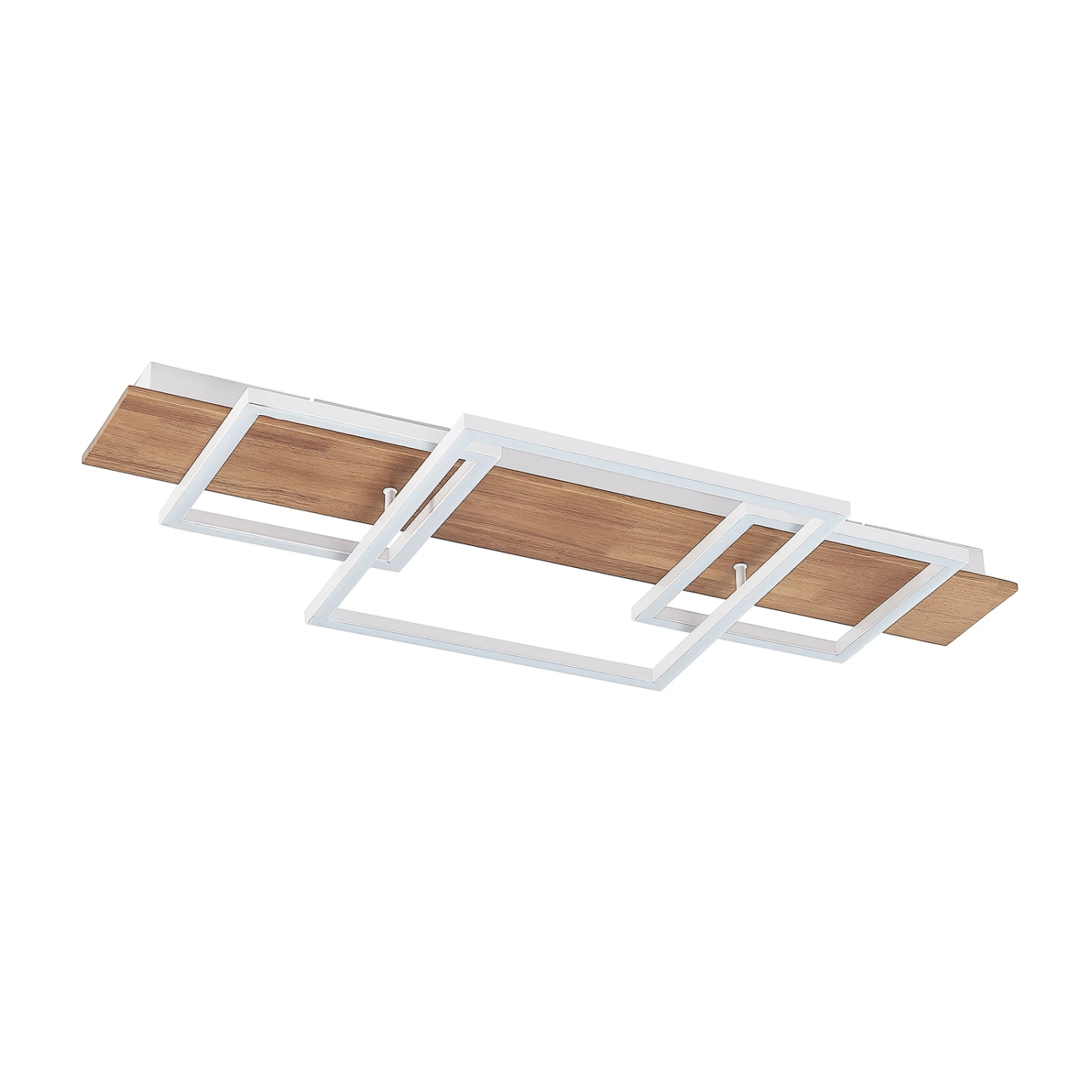 Chariska ist als LED-Deckenlampe hervorragend zur Wohnraumbeleuchtung geeignet und überzeugt nicht nur mit einem modernen Look, sondern auch mit einer natürlichen Note. Das liegt daran, dass unter den Leuchtelementen eine Echtholzplatte mit etwas dunklerem Finish sitzt, bei der die natürliche Holzmaserung noch gut zu erkennen ist. Die drei Leuchtelemente sind in Weiß gehalten und besitzen eine eckige Rahmenform. Die LEDs darin können in unterschiedlichen Lichtfarben leuchten, wobei diese sowohl mithilfe des Schalters (5 Modi) als auch über die Fernbedienung (8 Modi) angepasst werden kann und auch ein stufenloser Wechsel möglich ist. Zudem ist auch die Helligkeit variabel und stufenlos einstellbar, damit man vor Ort die optimalen Lichtverhältnisse erhält.