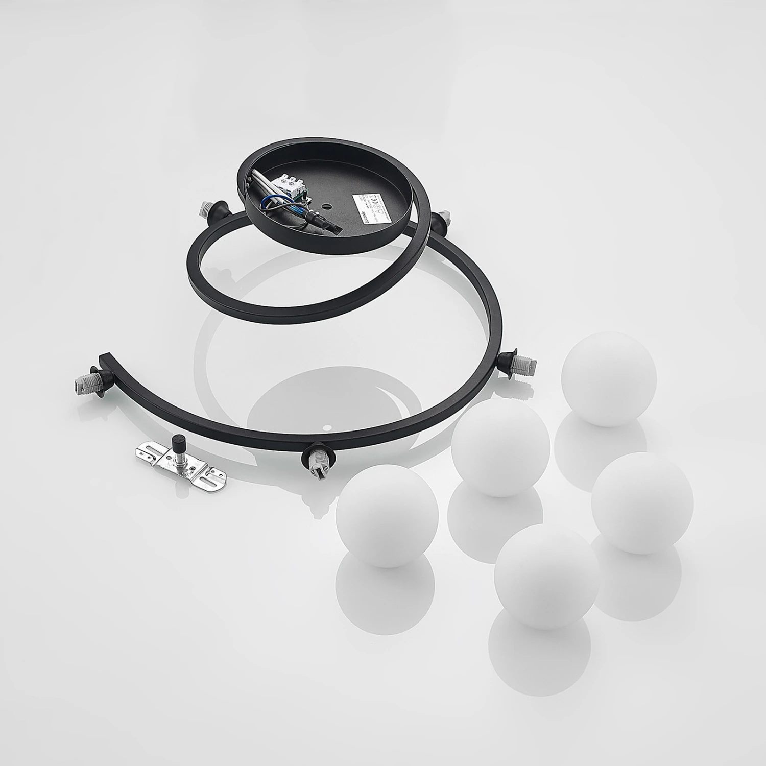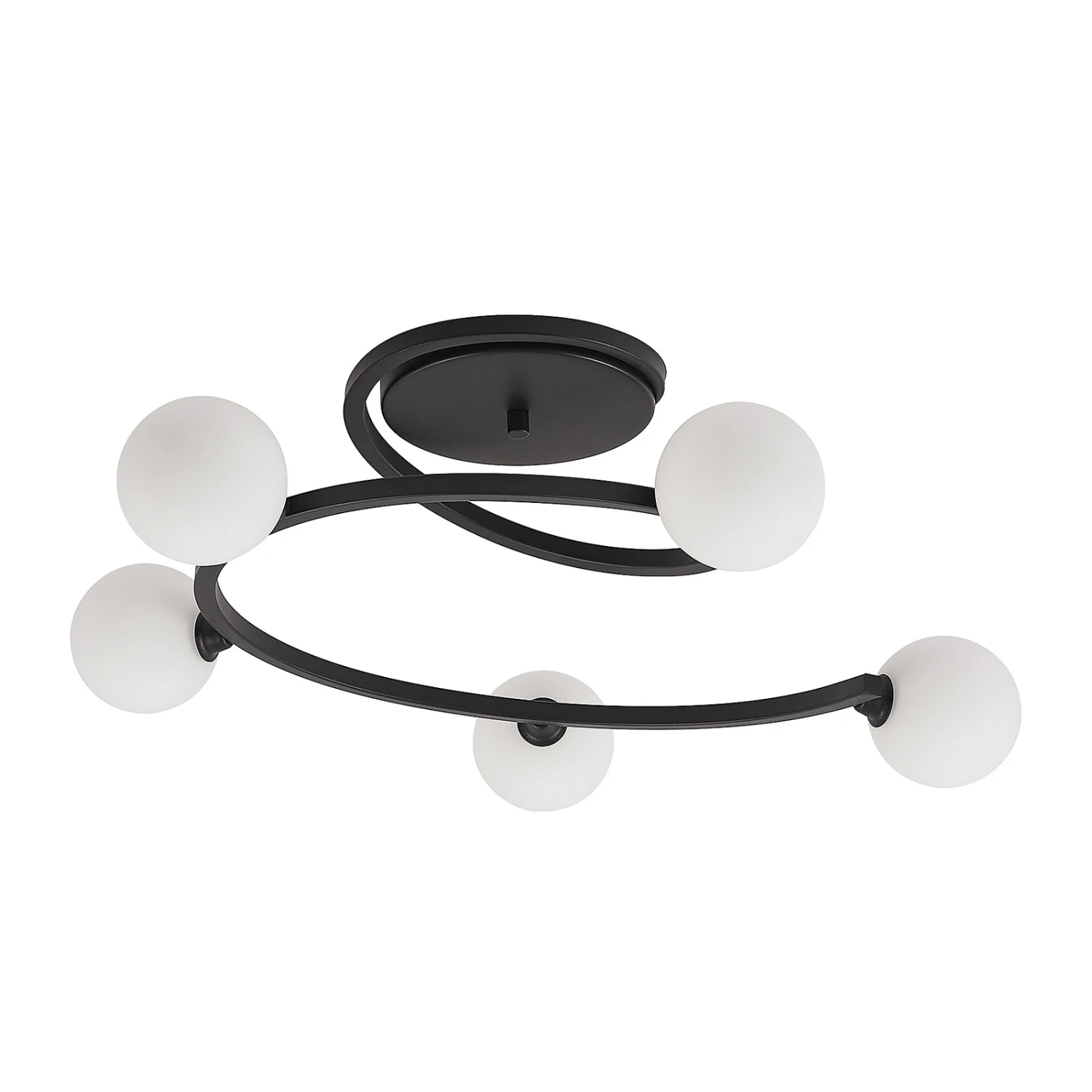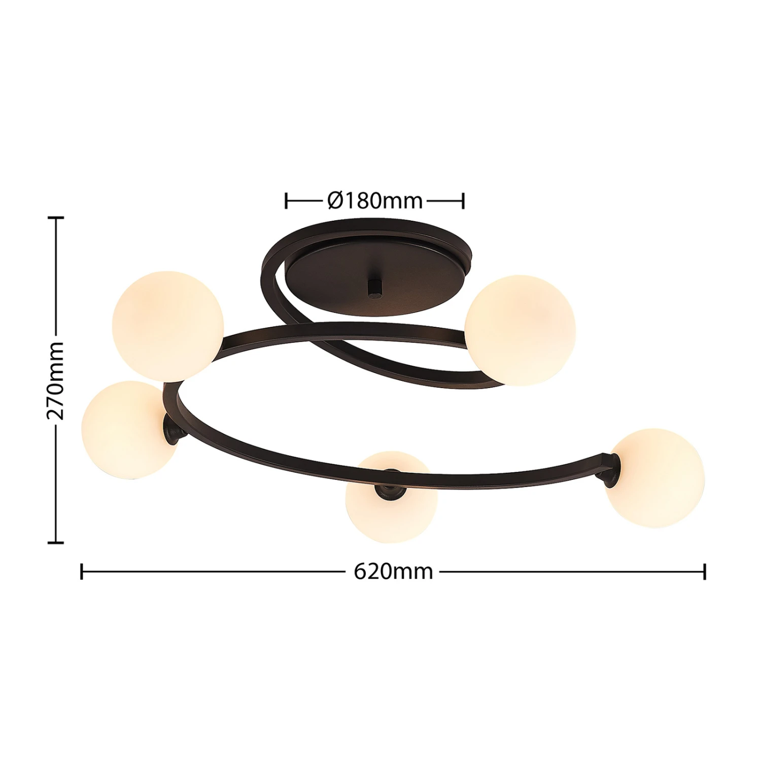 Chenoa ist eine besondere Deckenleuchte, die sich von der Deckenhalterung spiralförmig hinabwindet. Auf dem Leuchtenarm befinden sich insgesamt fünf Brennstellen, die von Leuchtenschirmen aus Glas überdeckt werden. Des Gestell besteht aus Eisen, das mit einem schwarzen Oberflächenfinish überzogen wurde.