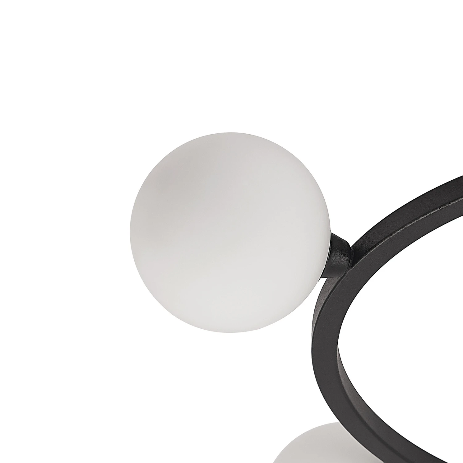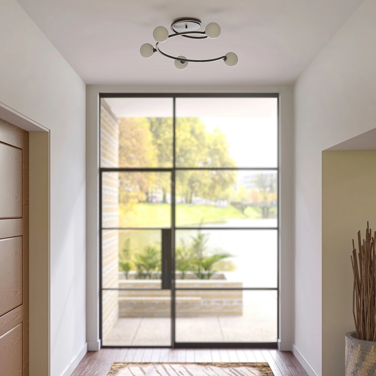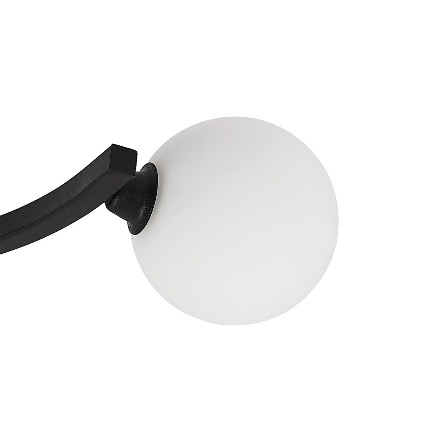 Chenoa ist eine besondere Deckenleuchte, die sich von der Deckenhalterung spiralförmig hinabwindet. Auf dem Leuchtenarm befinden sich insgesamt fünf Brennstellen, die von Leuchtenschirmen aus Glas überdeckt werden. Des Gestell besteht aus Eisen, das mit einem schwarzen Oberflächenfinish überzogen wurde.