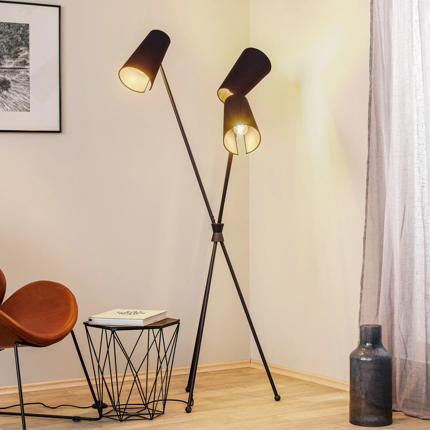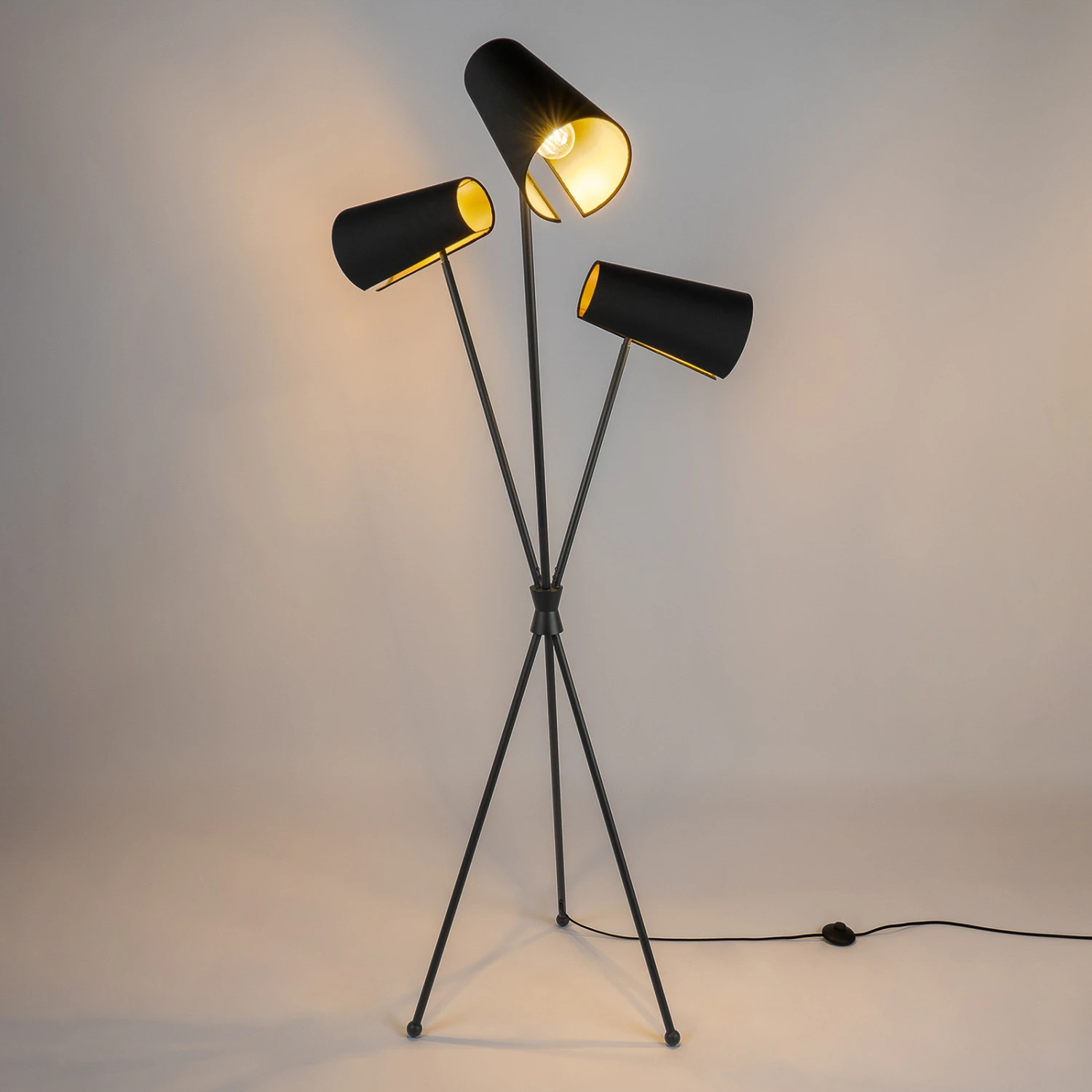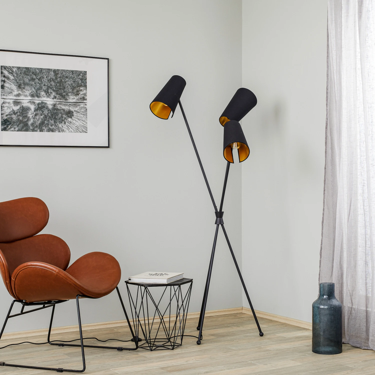 Coleris ist eine Stehleuchte mit dem gewissen Etwas, die in einem exklusiven Design gefertigt worden ist und über drei bewegliche Textilschirme verfügt, die außen schwarz sind und im Inneren golden glänzen. Somit ergibt sich nicht nur ein schönes Erscheinungsbild, sondern auch eine warme und gemütliche Lichtwirkung, die in jedem Wohn- und Schlafzimmer willkommen ist. Für eine optimale Ausrichtung des behaglichen Lichtscheins kann man die Lampenschirme der dreibeinigen Stehleuchte individuell schwenken. Der Schalter sitzt in der Zuleitung und kann mit dem Fuß bedient werden, das Gestell wirkt locker und filigran mit den drei schwarzen Streben aus Eisen.