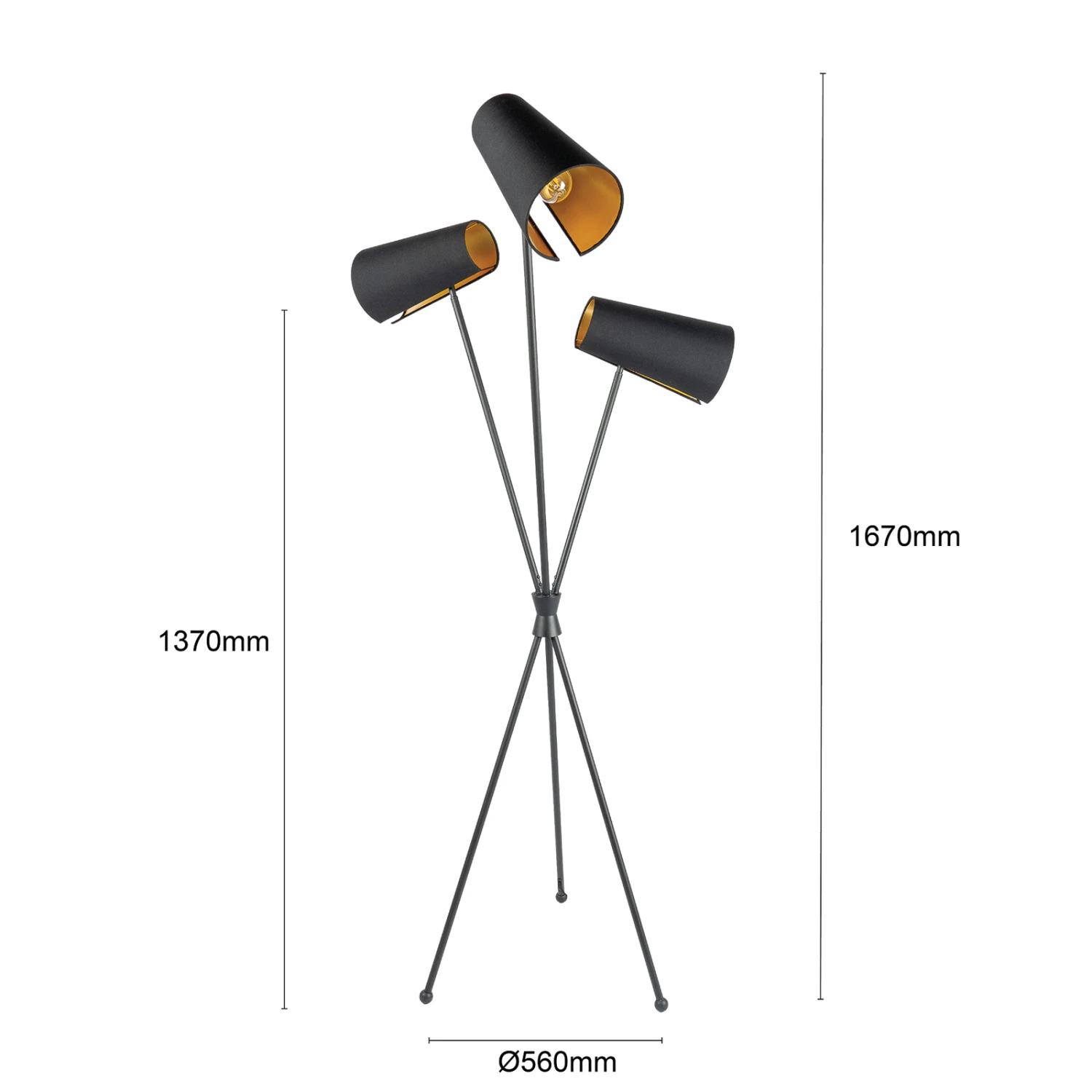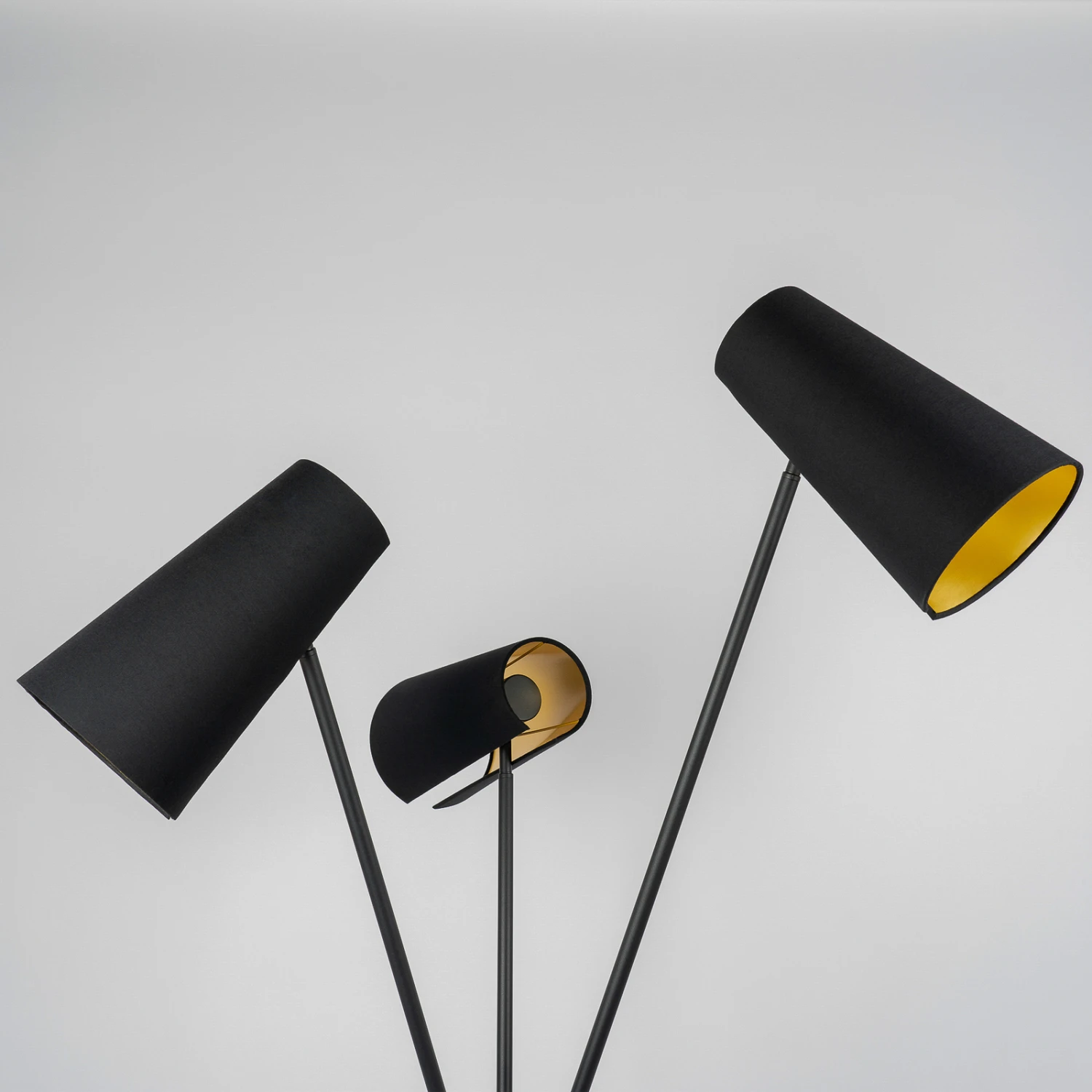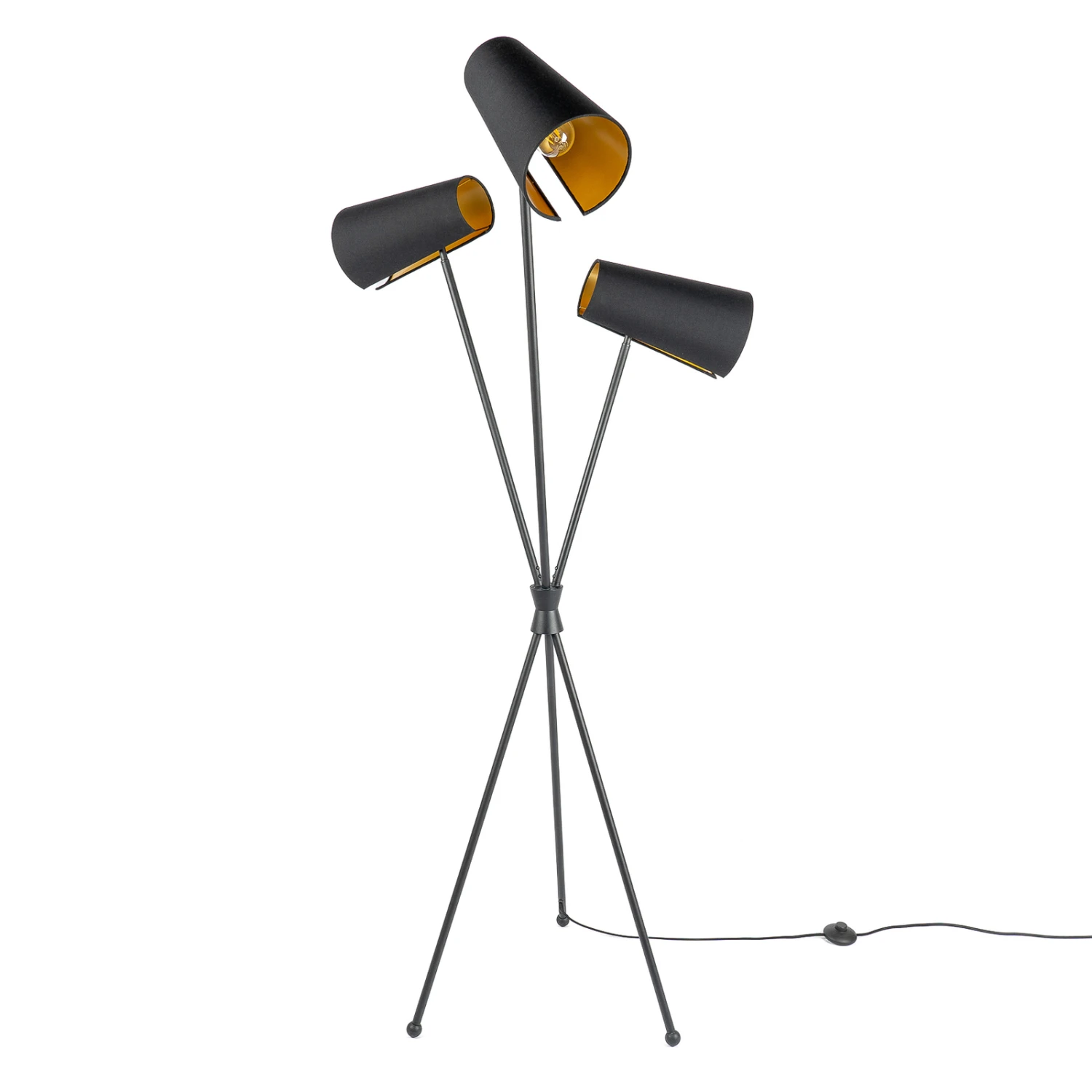 Schwarze Tripod-Stehleuchte Coleris mit drei schwarz-goldenen Stoffschirmen