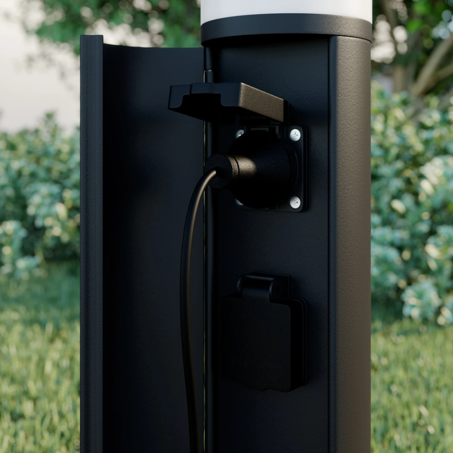 Die Sockelleuchte Corban spendet dank der fest verbauten LED ein warmweißes Licht. Die Leuchte hat einen Korpus aus Aluminium in einer klassischen Zylinderform. Doch hat Corban nicht nur die Funktion Außenbereiche zu erleuchten, sondern stellt auch mit zwei Steckdosen, die im Leuchtenkorpus eingelassen sind, die Stromversorgung bei der Gartenarbeit sicher. Die beiden Steckdosen verstecken sich hinter einer Tür und sind bis zu einer Gesamtleistung von 3.680 Watt belastbar.