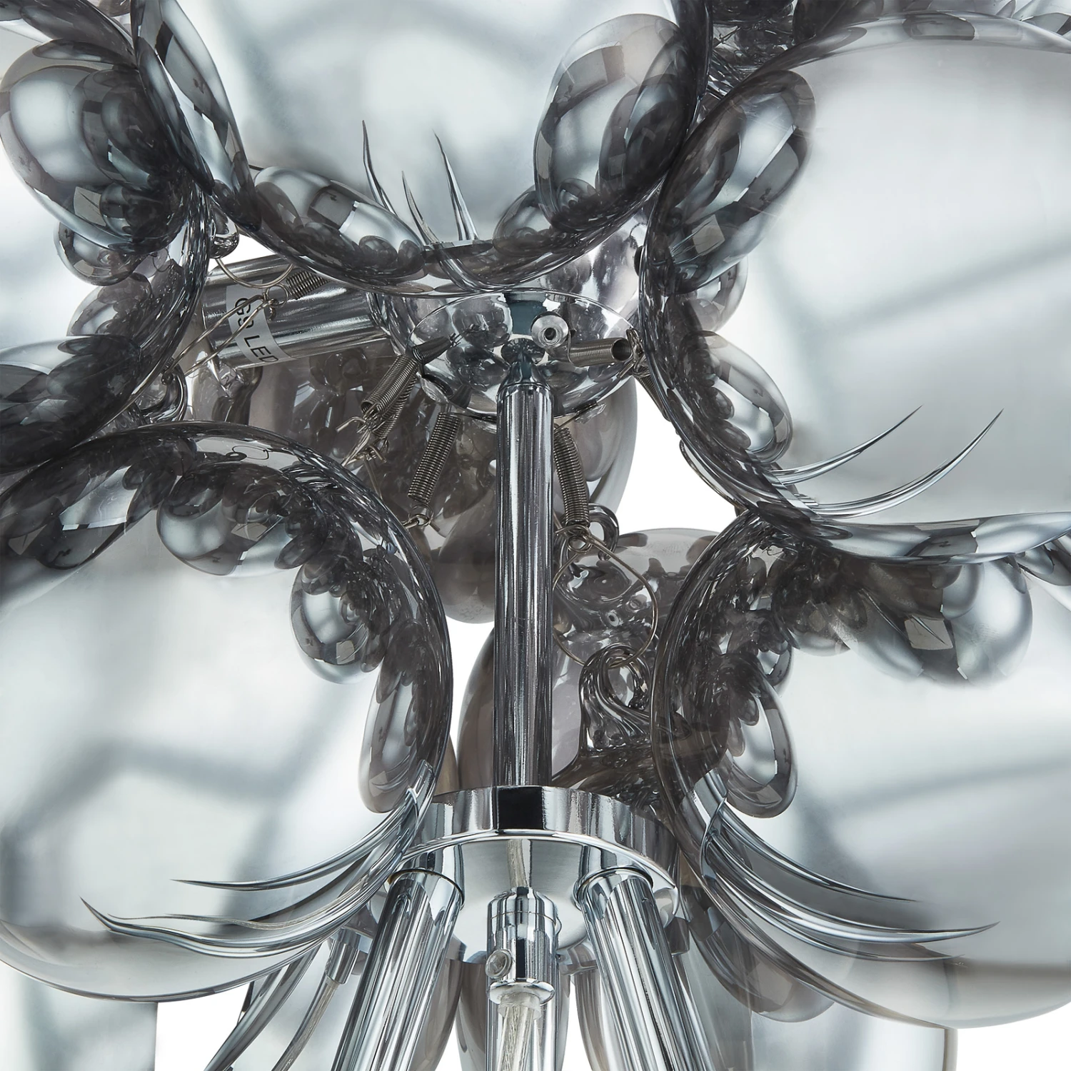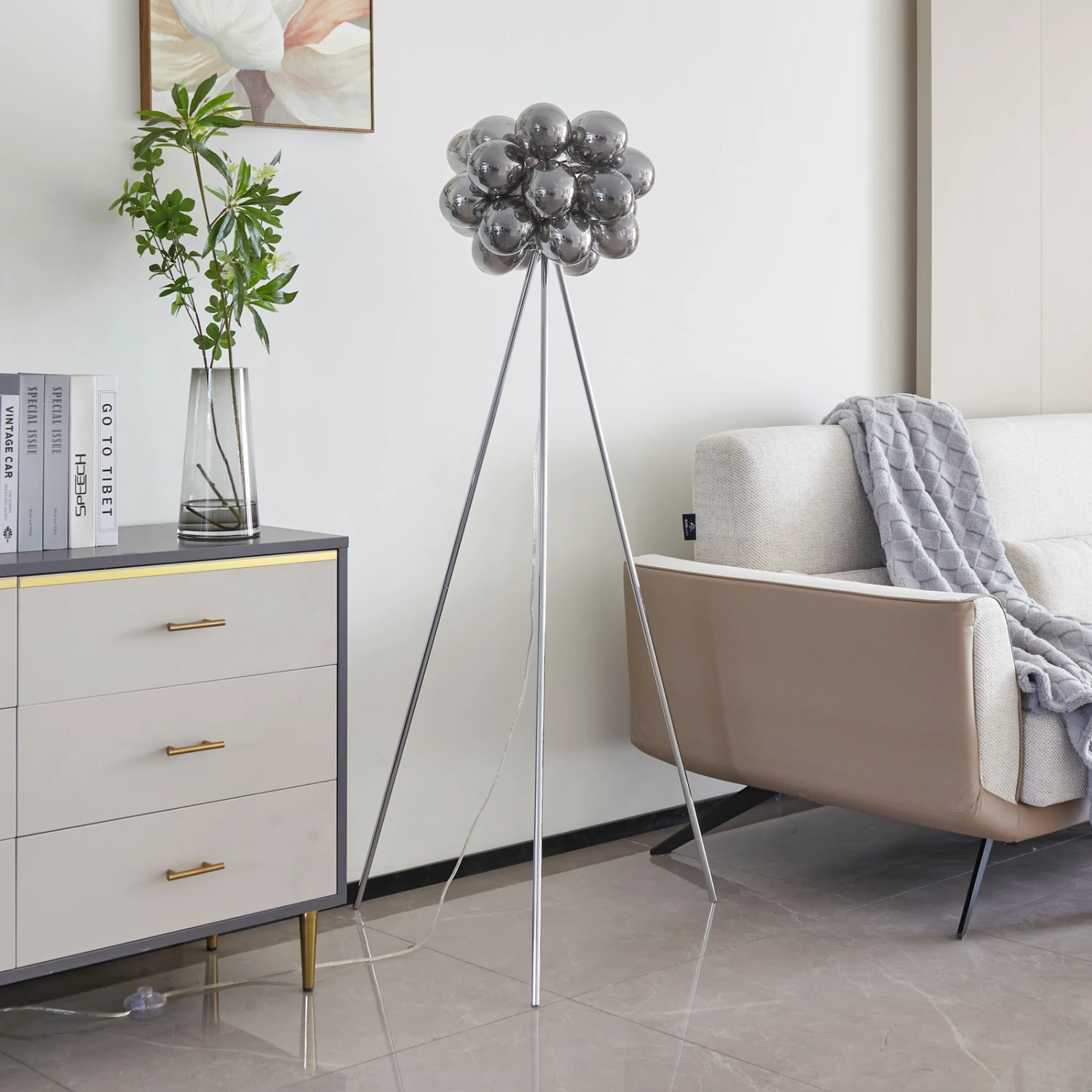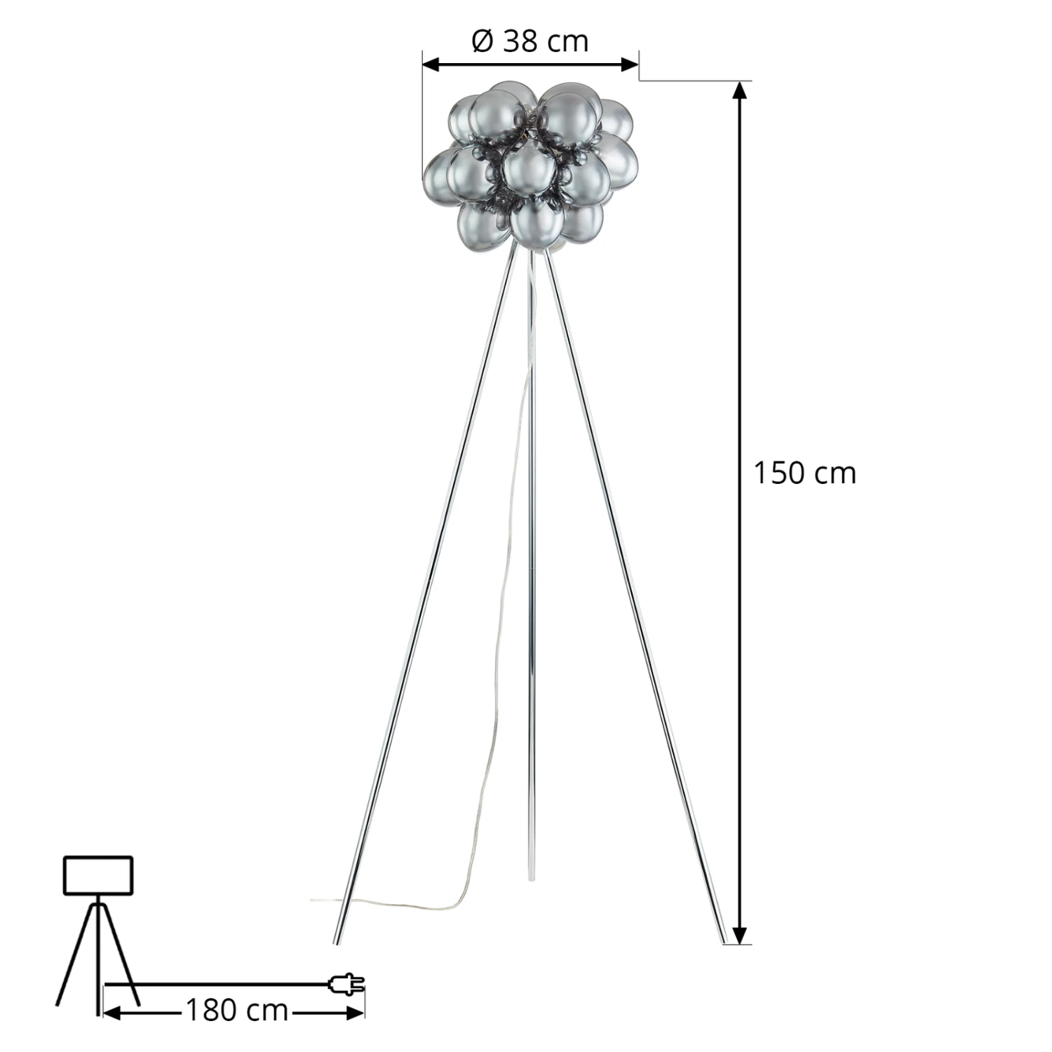 Markante Stehleuchte Diborah mit Glaskugeln in rauchgrauer Optik
