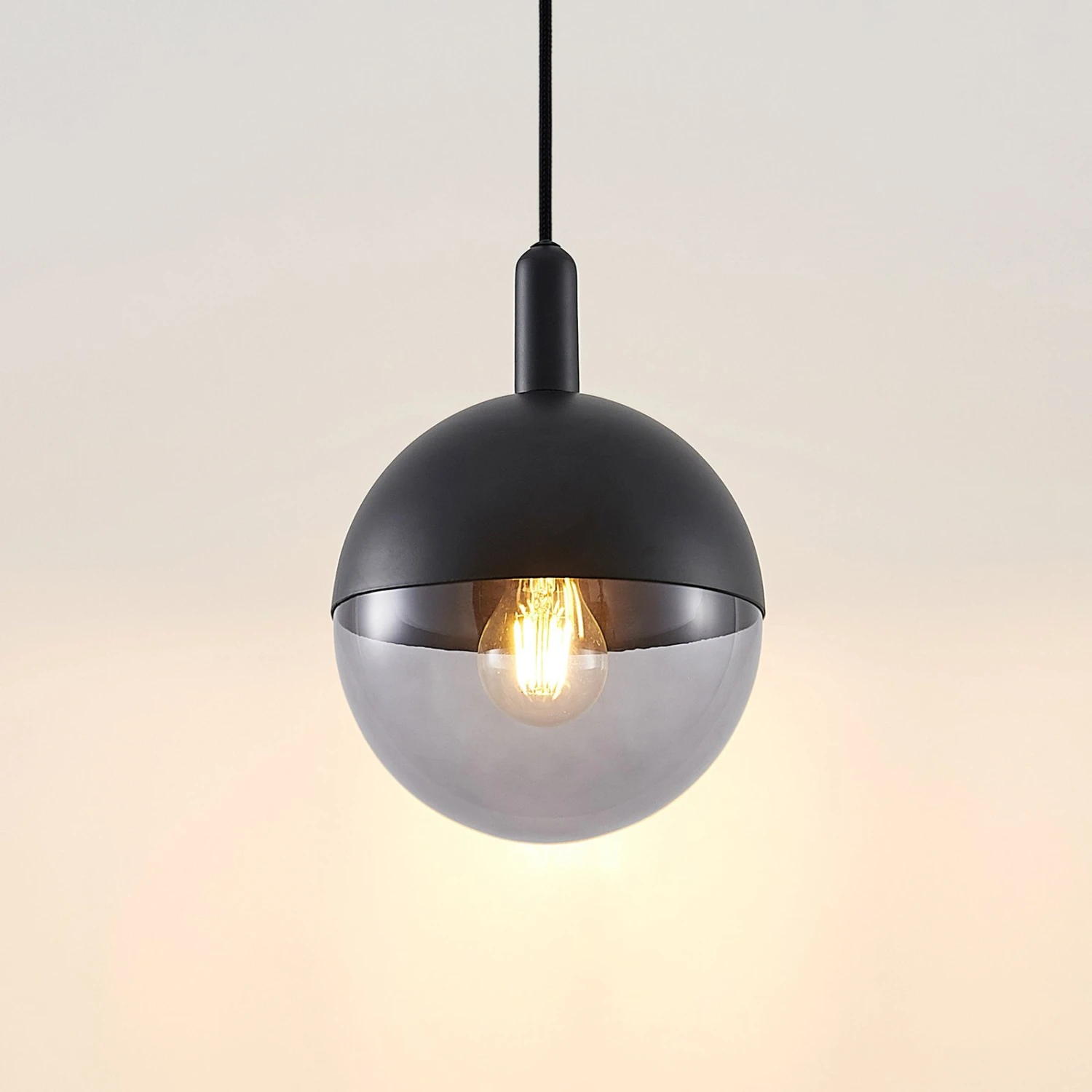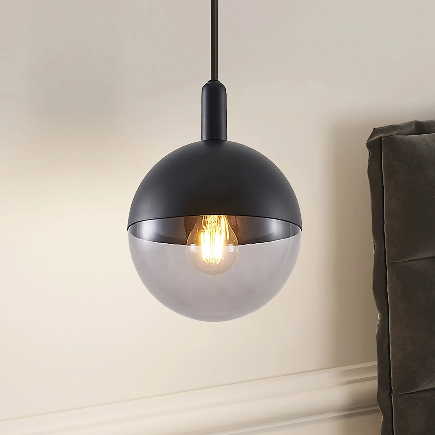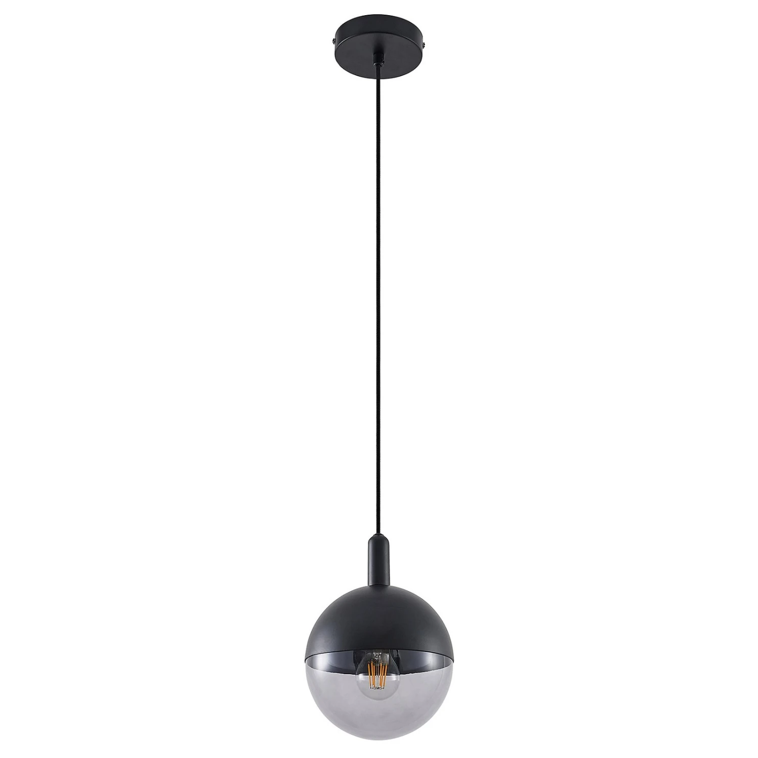 Das Design dieser runden Pendelleuchte wirkt edel und ein klein wenig verspielt und verkörpert einen eleganten Zwei-Komponenten-Look, weil der Lampenschirm in Kugelform ungefähr zu gleichen Teilen aus schwarzem Metall und klarem Glas gefertigt ist. Über einen Drehmechanismus lassen sich bei einem Leuchtmittelwechsel beide Bestandteile schnell voneinander entfernen und dann auch wieder ebenso schnell zusammenfügen. Die Öffnung ist so groß, dass auch Globelampen verwendet werden können, bis zum einem Durchmesser von 9,5 cm. Hinter dem Klarglas kommt eine solch große Lampe dann natürlich besonders schön zur Geltung. Eine Alternative liegt darin, für besonders behagliche Lichtverhältnisse eine Kopfspiegellampe einzusetzen oder solche Leuchtmittel, die eine ganz warme Lichtfarbe besitzen. Das passt dann auch recht gut zu dem trendigen Oberflächenfinish in Schwarz.
