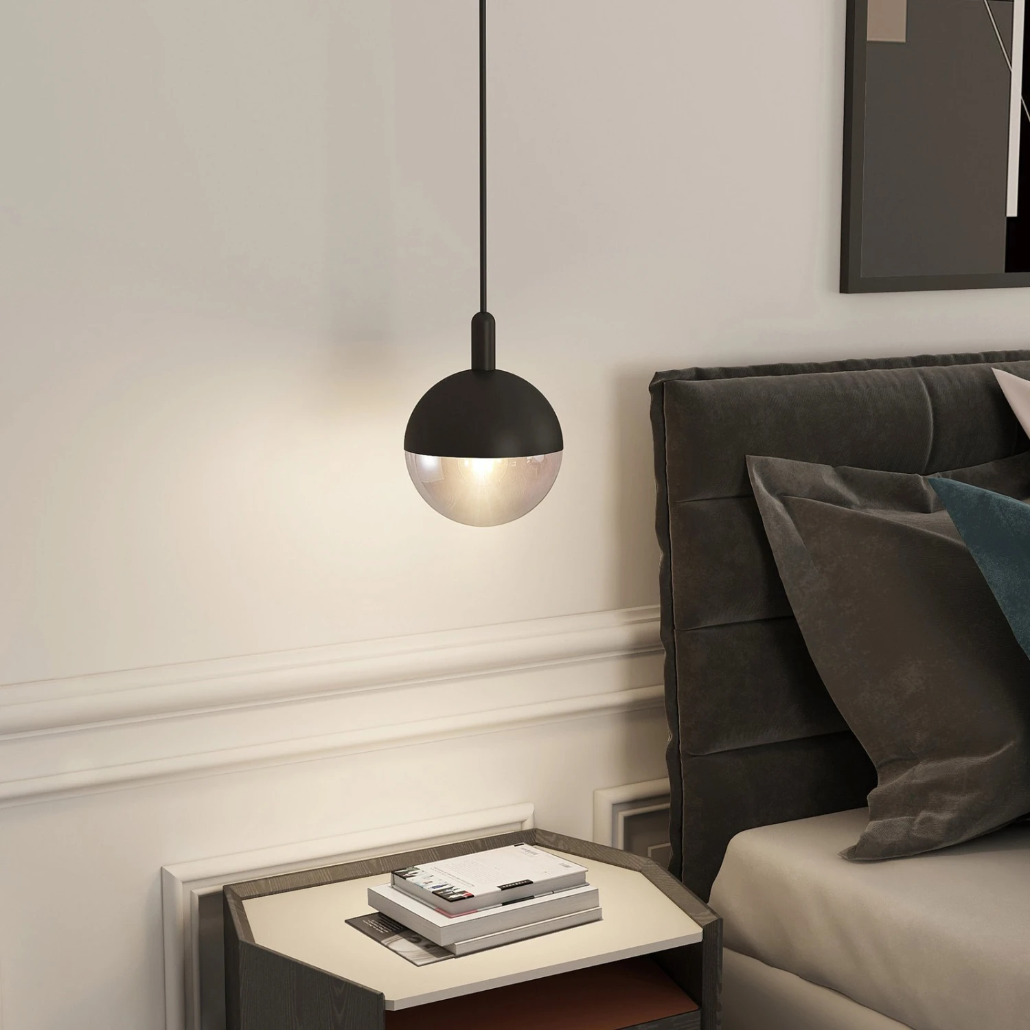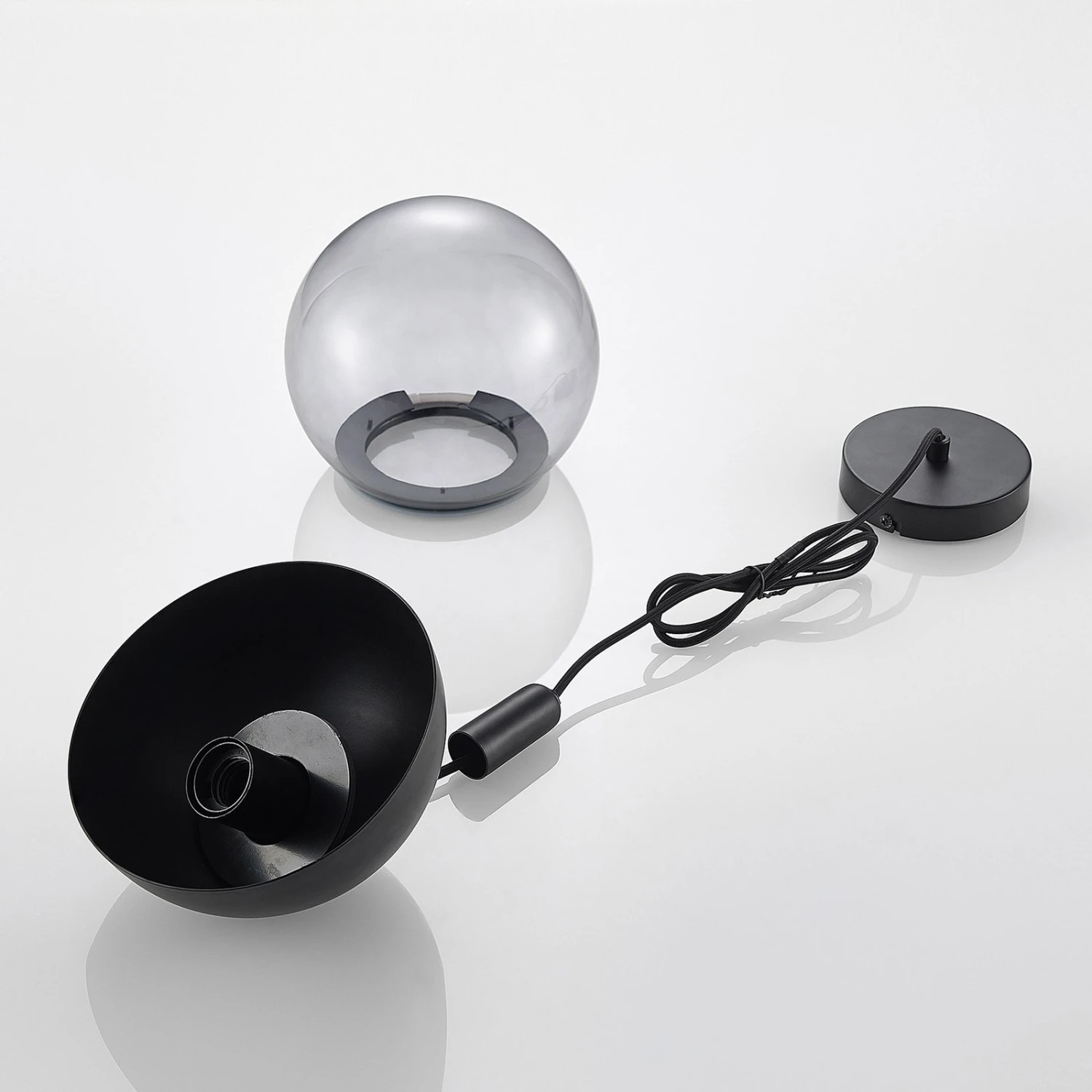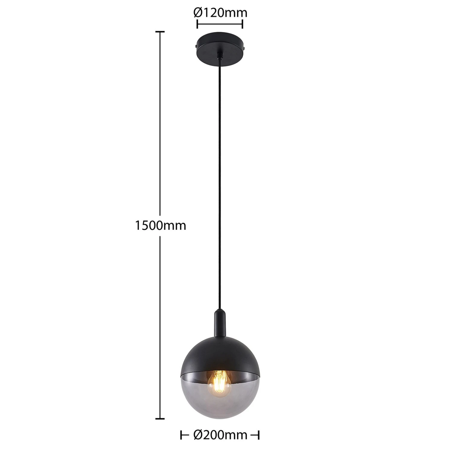 Das Design dieser runden Pendelleuchte wirkt edel und ein klein wenig verspielt und verkörpert einen eleganten Zwei-Komponenten-Look, weil der Lampenschirm in Kugelform ungefähr zu gleichen Teilen aus schwarzem Metall und klarem Glas gefertigt ist. Über einen Drehmechanismus lassen sich bei einem Leuchtmittelwechsel beide Bestandteile schnell voneinander entfernen und dann auch wieder ebenso schnell zusammenfügen. Die Öffnung ist so groß, dass auch Globelampen verwendet werden können, bis zum einem Durchmesser von 9,5 cm. Hinter dem Klarglas kommt eine solch große Lampe dann natürlich besonders schön zur Geltung. Eine Alternative liegt darin, für besonders behagliche Lichtverhältnisse eine Kopfspiegellampe einzusetzen oder solche Leuchtmittel, die eine ganz warme Lichtfarbe besitzen. Das passt dann auch recht gut zu dem trendigen Oberflächenfinish in Schwarz.