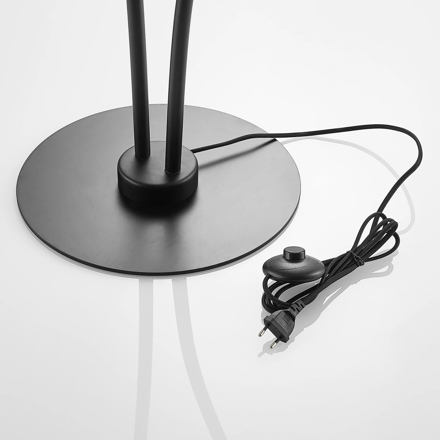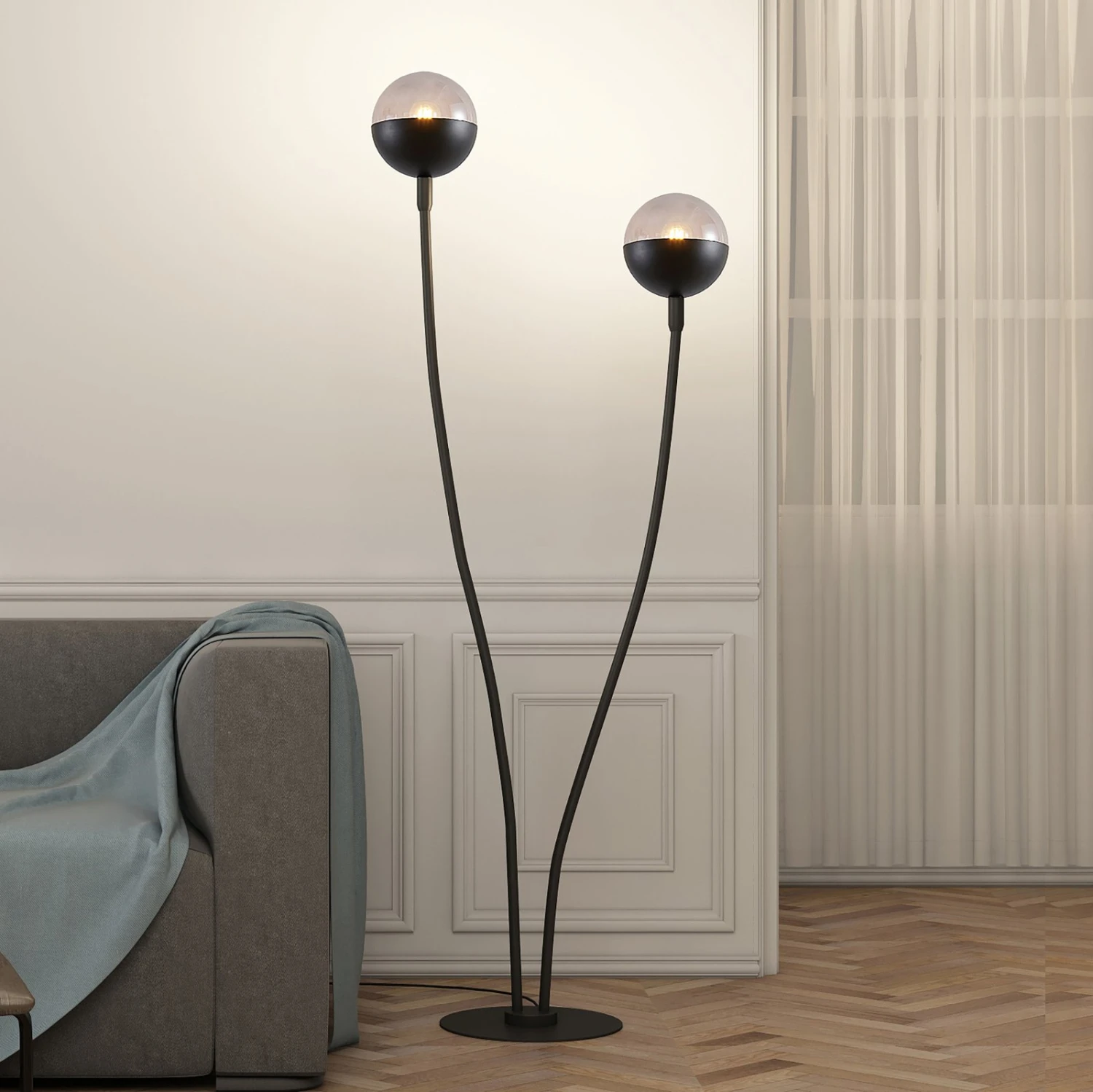 Dank zweier geschwungener Leuchtenarme kommt die Stehleuchte Dustian durchaus dynamisch und auch ein wenig verspielt daher. Trotzdem wirkt die Leuchte selbstbewusst und die Serie mit der ausgeprägten Designsprache bringt ausgesprochene Charaktertypen hervor. Gestell und Arme sind mit einem trendigen Finish in mattem Schwarz gehalten, das gerade im Kontrast mit einem warm leuchtenden Leuchtmittel eine wunderschöne Kombination ergibt. Die kugelförmigen Leuchtenschirme bestehen zur Hälfte aus Metall, ebenfalls schwarz, und zur Hälfte aus klarem Glas, so dass ein eindrucksvoller Zwei-Komponenten-Look entsteht. Ohne Zweifel besitzt die Stehleuchte mit ihrem hochwertigen Design einen edlen Objektcharakter und avanciert zum schönen Blickfang im Raum.