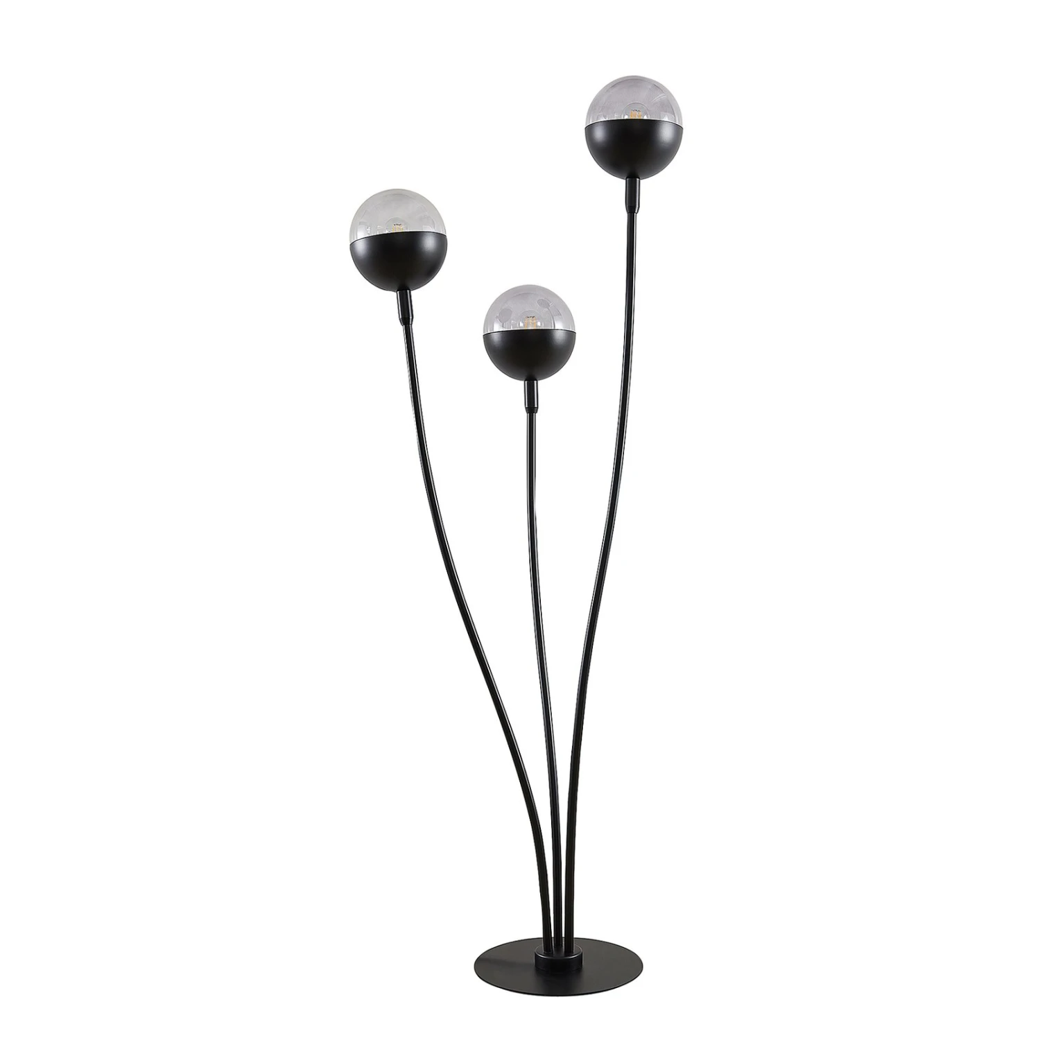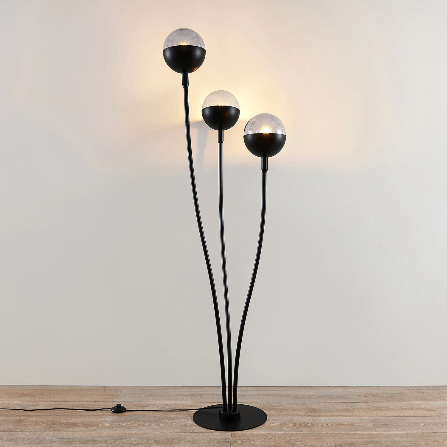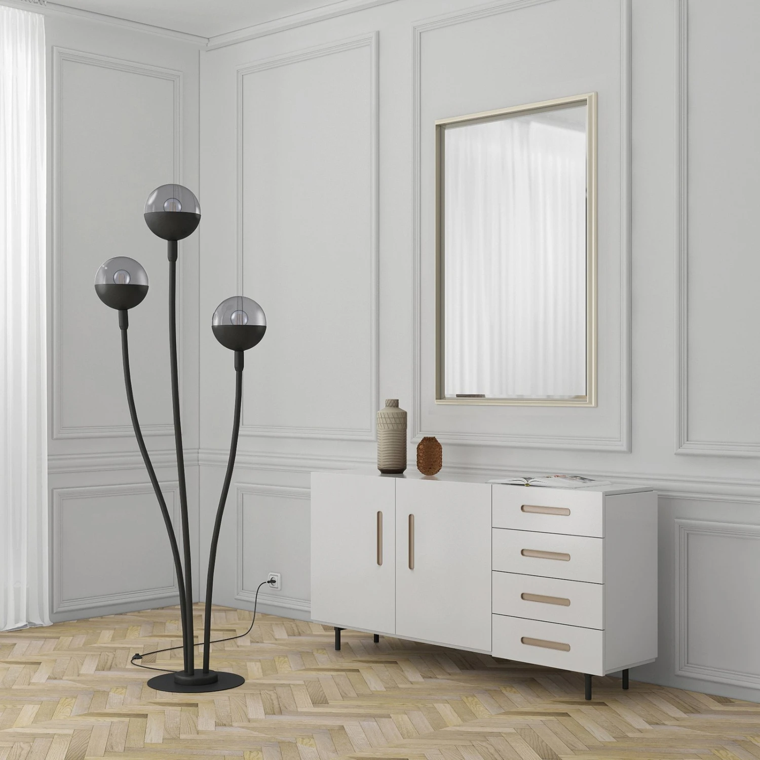 Dreiflammige Stehlampe Dustian mit ausgeprägtem Designcharakter und halb aus Glas bestehenden Leuchtkugeln