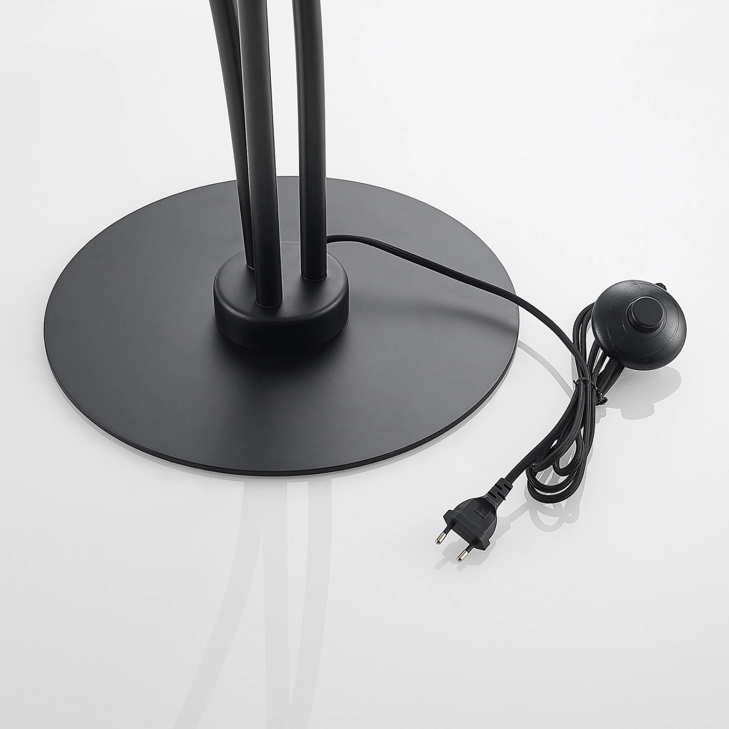 Dustian hat drei kugelförmige Lampenschirme, die sich auf unterschiedlicher Höhe befinden und oben mit einem schönen Klarglaslook punkten, während die untere Hälfte aus schwarz lackiertem Metall besteht, was auch für den Rest des Gestells, also den runden Fuß und die geschwungenen Arme gilt. Aufgrund dieser leicht dynamischen Erscheinung wirkt die Stehleuchte etwas verspielt und zählt doch zu den selbstbewussten Charaktertypen unter den Leuchten. Der Objektcharakter, den die Leuchtenserie Dustian hat, ist unverkennbar, so dass die Leuchten nie bloß Lichtspender, sondern immer auch dekorative Einrichtungsgegenstände mit ausgeprägtem Designcharakter sind. Das schwarze Oberflächenfinish erscheint sehr trendig und eine besonders schöne Kombination entsteht, wenn man LED-Leuchtmittel mit einer extrawarmen Lichtfarbe wählt.