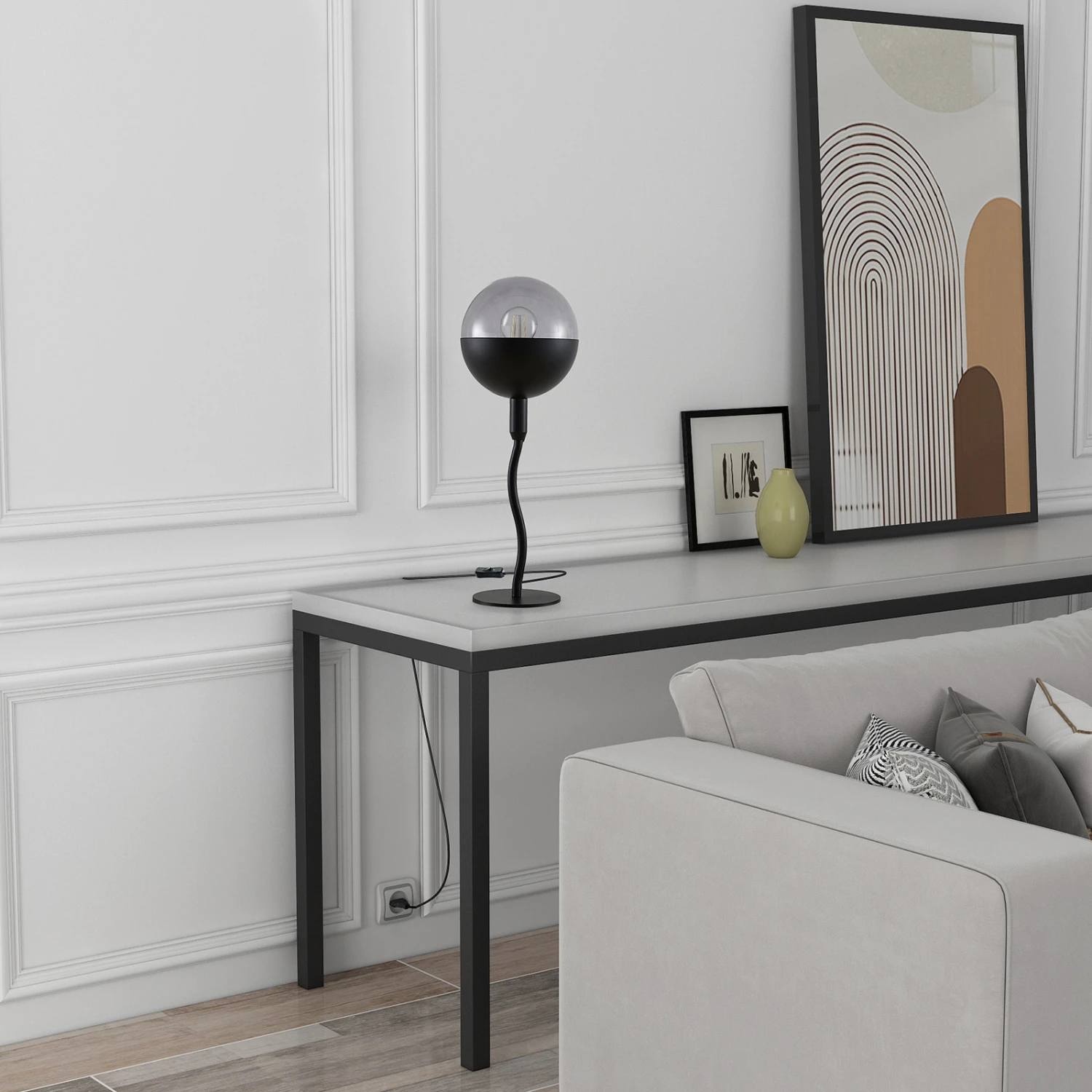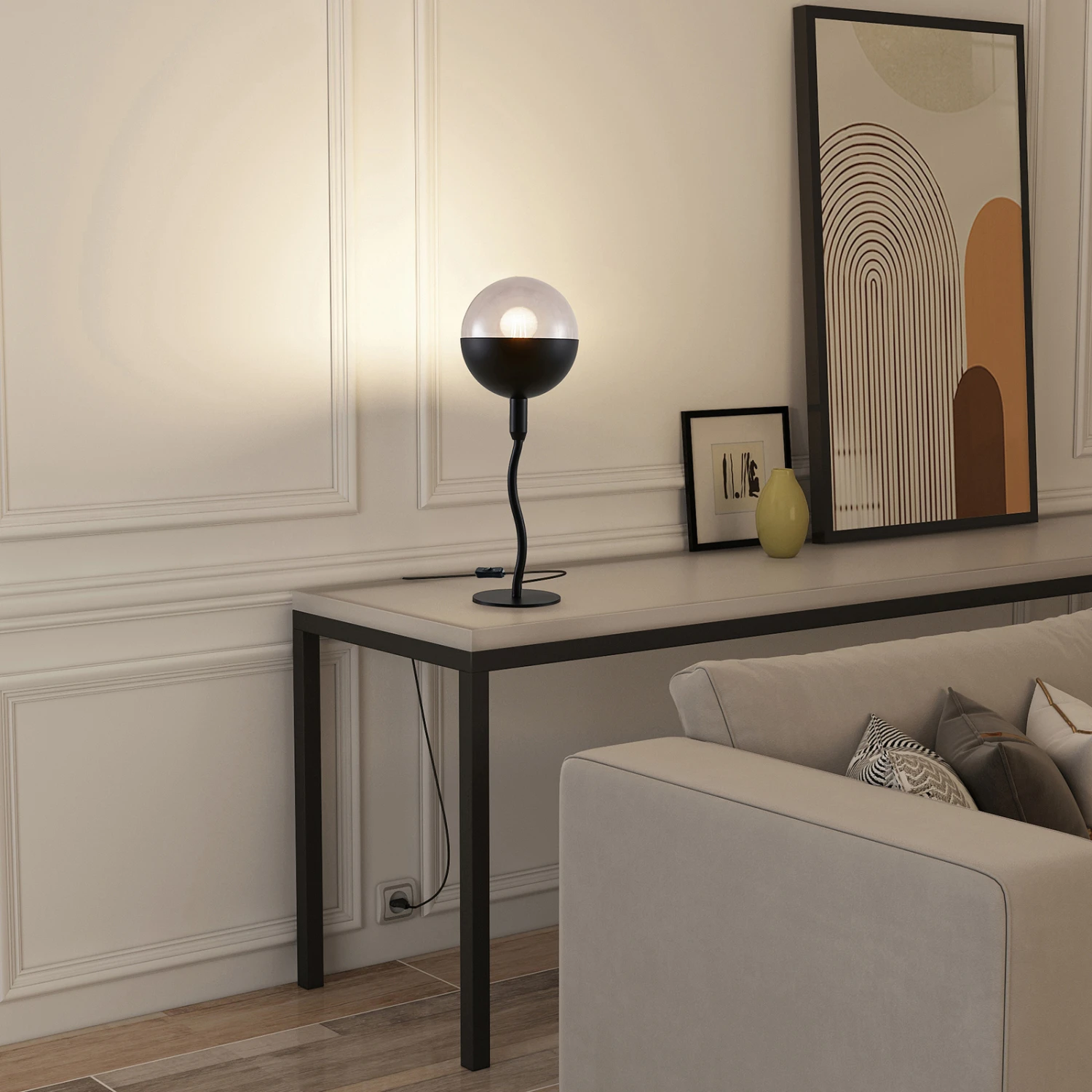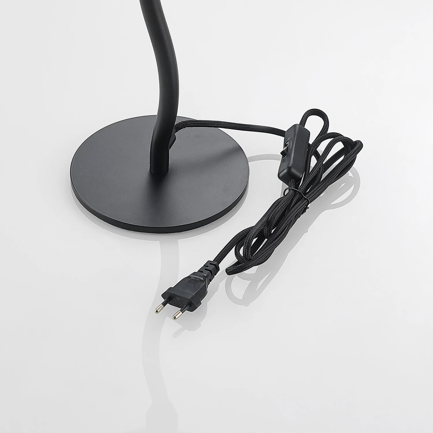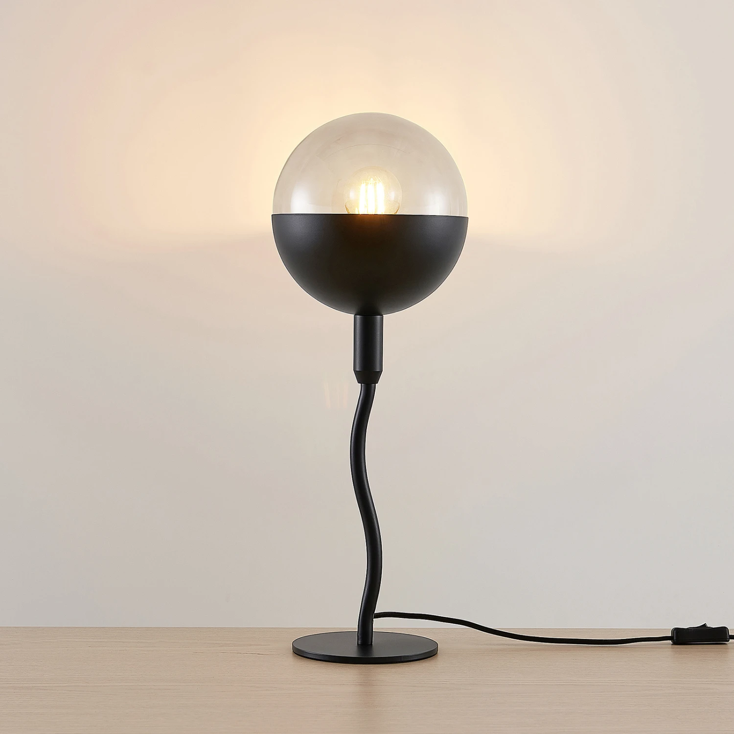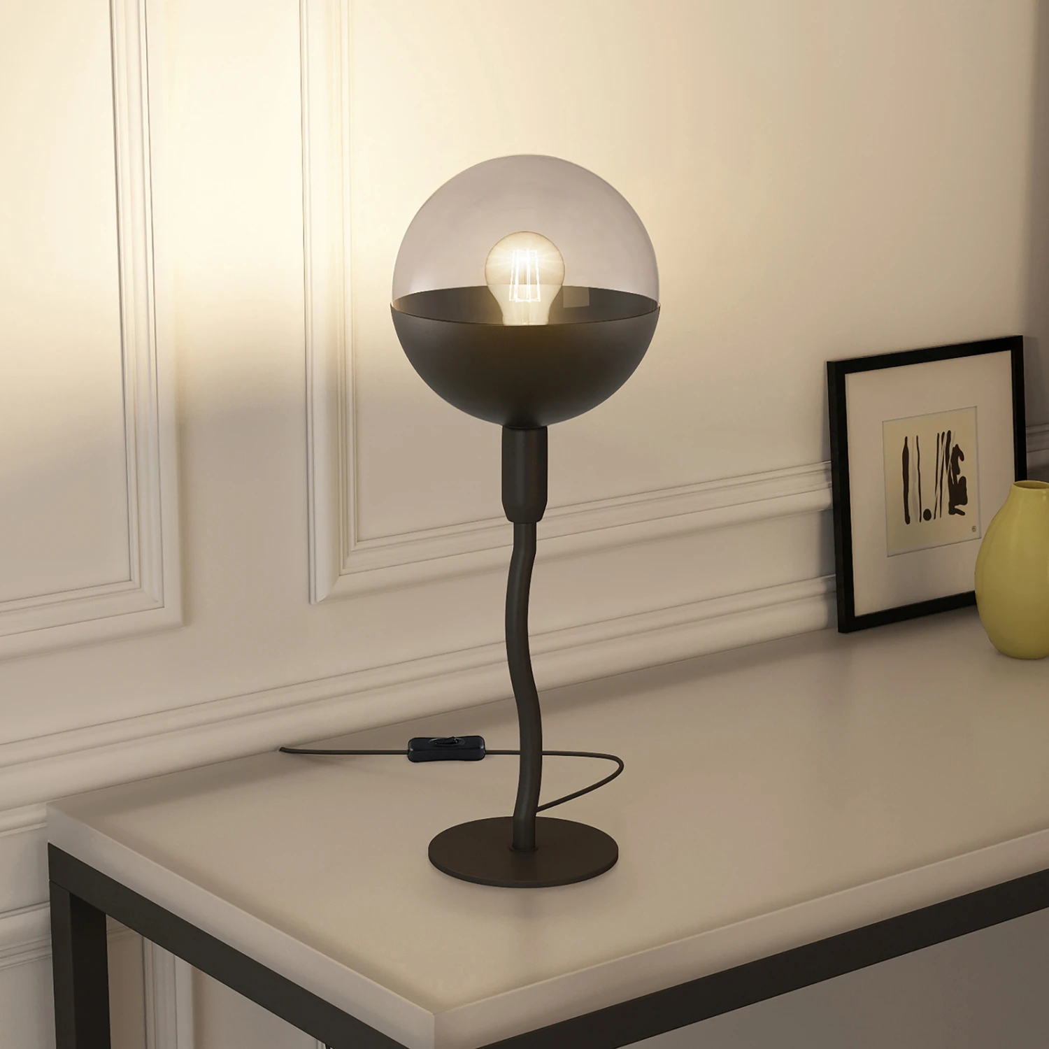 Dustian ist eine Tischleuchte, die selbstbewusst und auch ein bisschen verspielt daherkommt, weil der Leuchtenarm, der vom runden Fuß bis hin zum kugelförmigen Lampenschirm führt, sanft geschwungen ist und daher eine hübsche Dynamik verkörpert. Es handelt sich um ein designorientiertes Beleuchtungselement mit ausgeprägtem Objektcharakter, das einen schönen Blickfang darstellt und sich exzellent für eine gemütliche Akzentbeleuchtung von Wohnräumen eignet. Das trendige Oberflächenfinish in Schwarz ergibt gerade bei Nutzung einer LED-Lampe mit besonders warmer Lichtfarbe eine echt sehenswerte Kombination, die für eine herrliche Gemütlichkeit steht. Ein echter Charaktertyp, diese Tischleuchte!
