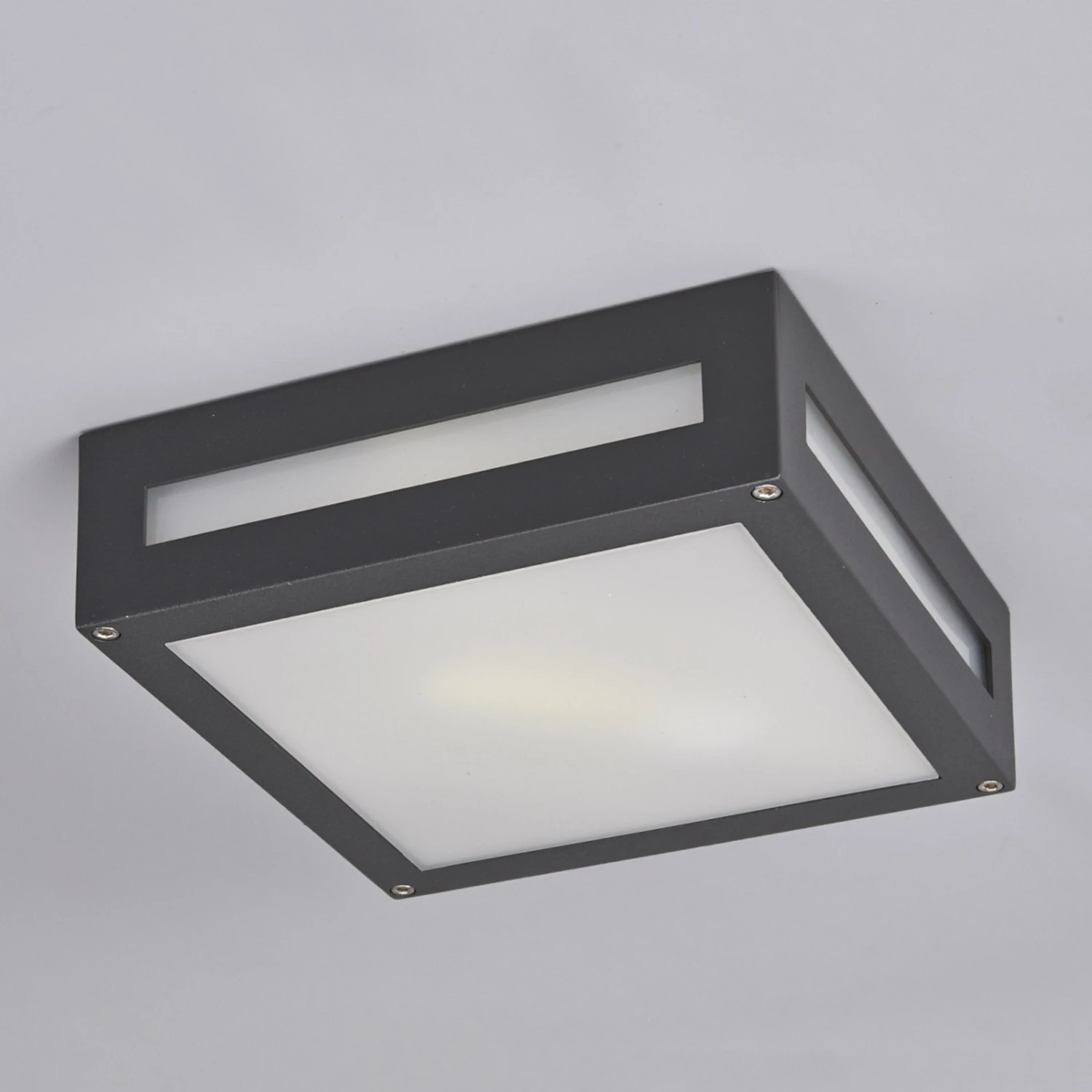 Auch im Außenbereich finden Deckenleuchten gelegentlich Verwendung, nämlich dann, wenn man kleinere Überdachungen beleuchten möchte, z.B. über der Haustür oder bei Terrassen und Balkonen. IP54 kennzeichnet, dass Schutz vor dem Eindringen von Staub und Wasser gewährleistet wird, so dass Nerea bedenkenlos draußen verwendet werden kann. Optisch präsentiert sich die Außendeckenleuchte als Kombination aus grafitgrauem Aluminium und opalweißem Polycarbonat, was angenehm dezent erscheint. Das Licht entweicht nicht nur nach unten, sondern durch schmale Auslässe auch seitlich. Eingesetzt werden können Energiesparlampen der Fassung E27 bis maximal 15 Watt.