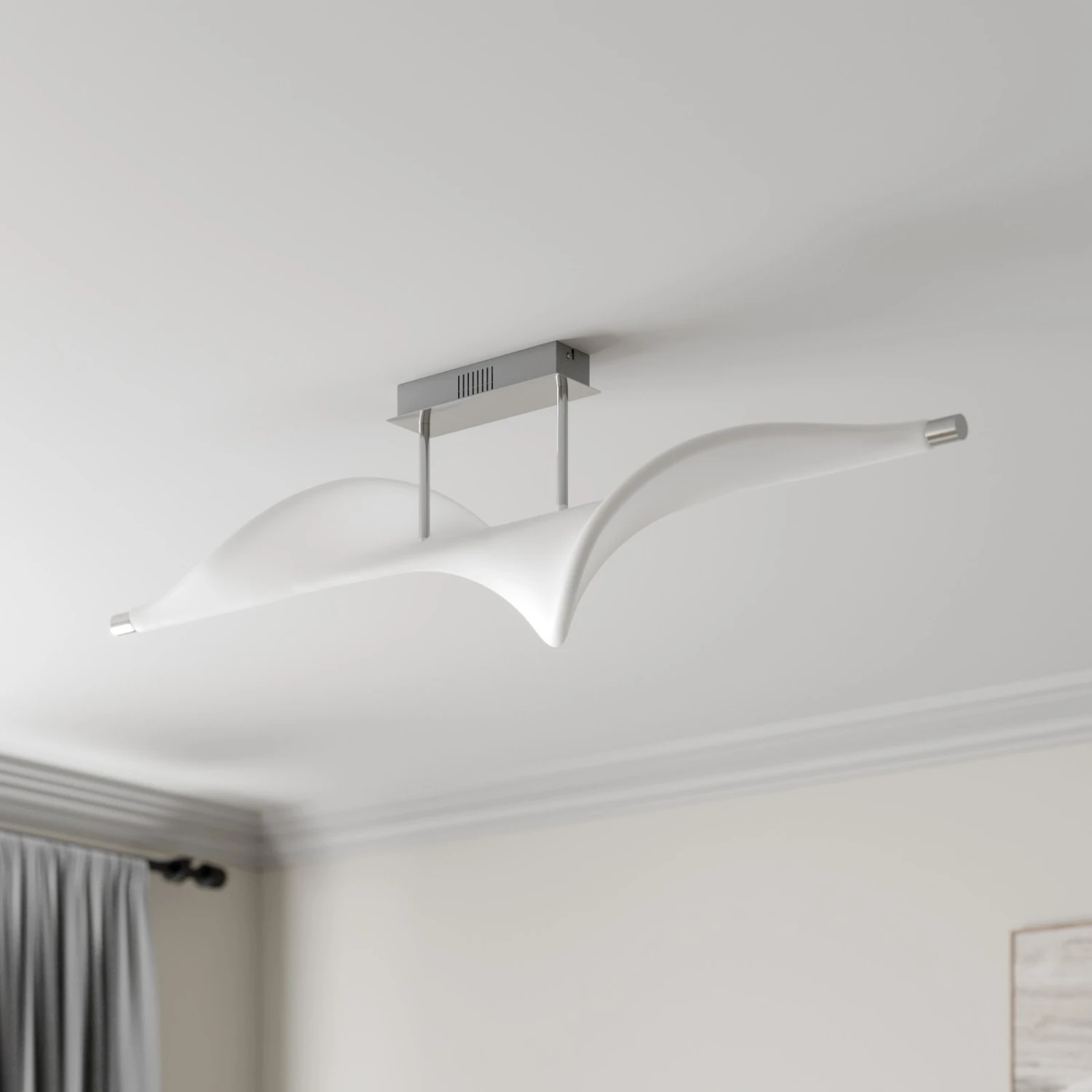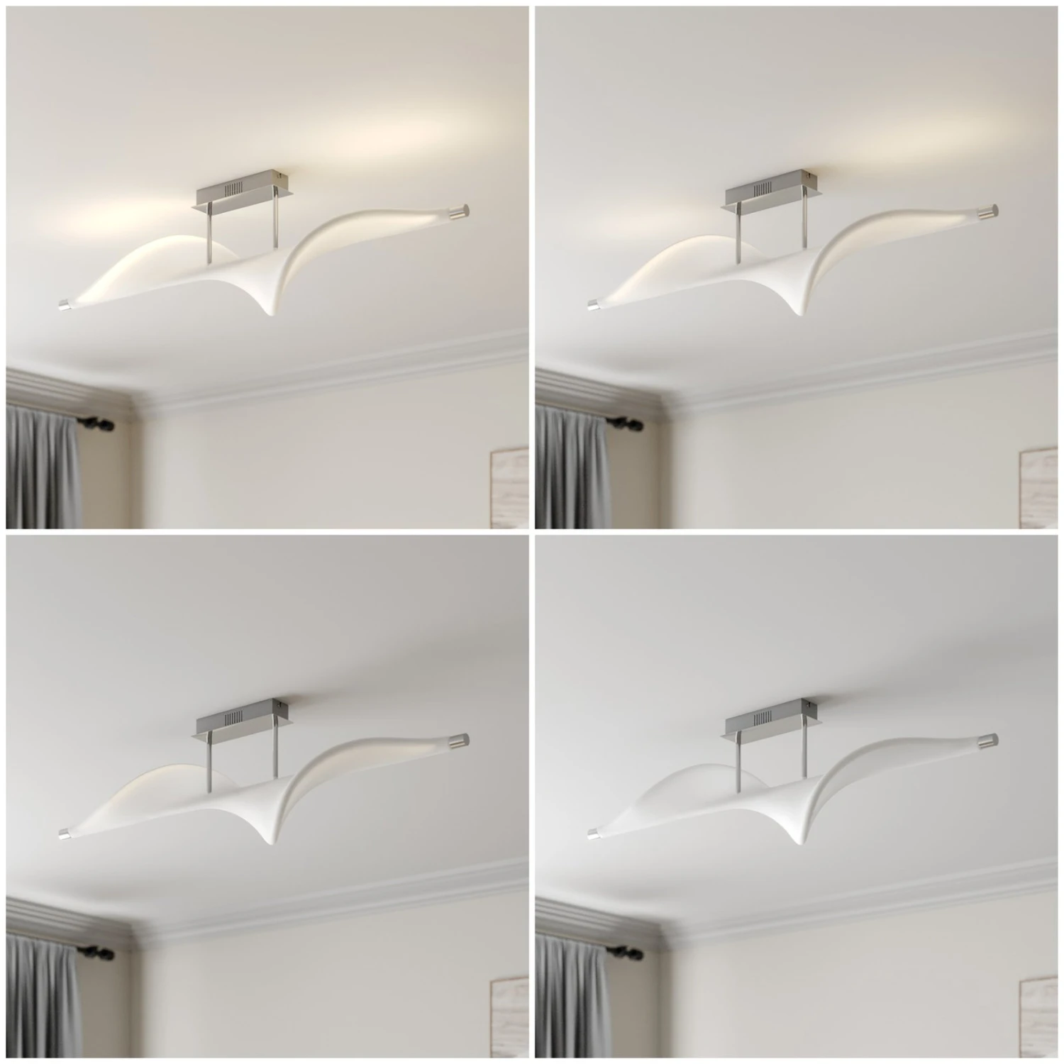 Wie ein Vogel, der im Wind mit weit ausgebreiteten Flügeln segelt, wirkt die Deckenleuchte Edano mit ihrem weißen Textilschirm, der in gewölbter Form gestaltet wurde und mit einem kleinen Abstand von der Deckenhalterung aus Aluminium abgehängt wurde. Die modern gestaltete LED-Deckenleuchte beeindruckt durch ein außergewöhnliches Design und durch ihre Größe und eignet sich deshalb hervorragend für ein großes Wohnzimmer oder Schlafzimmer.