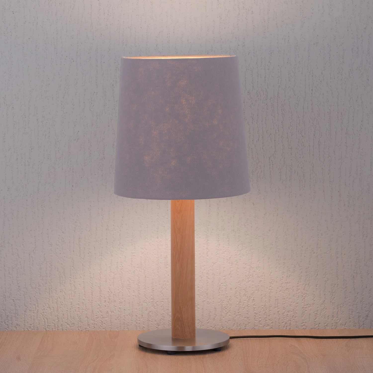 Das Holz ist aus naturbelassener Eiche und wurde per Hand zu einer formschönen Säule bearbeitet. Direkt oben befindet sich die E27-Fassung der Leuchte, die praktischerweise mit einem Kippschalter für das Ein- und Ausschalten der Tischlampe ausgestattet ist. Das Licht der einzusetzenden Lampe strahlt dann ganz sanft nach oben und unten sowie leicht durch den Schirm hindurch.