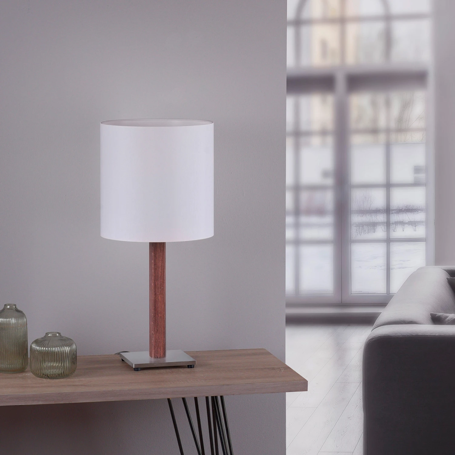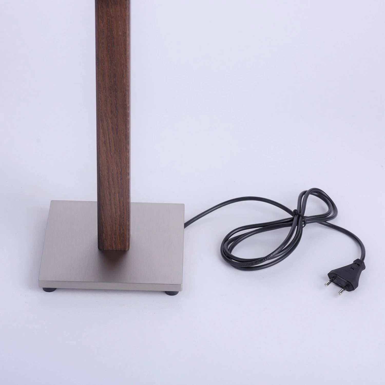 Für die nötige Stabilität sorgt ein in Nickel matt gehaltener und quadratischer Stahlsockel, für das bequeme Ein- und Ausschalten befindet sich ein praktischer Kippschalter direkt an der Fassung. Dieser ist spielend leicht zu finden und unter dem Lampenschirm zu ertasten.