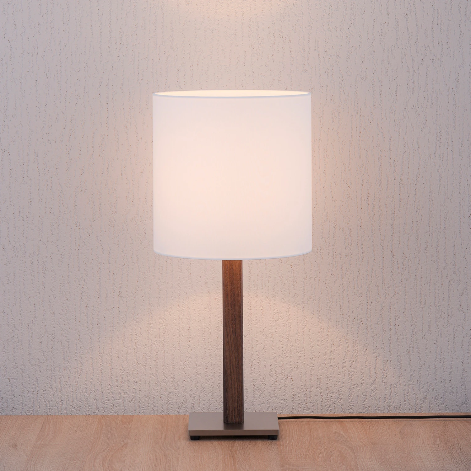 Ein wahrer Blickfang, und das schon im nicht beleuchteten Zustand, bist die stilvolle Tischleuchte Elif. Sie besteht aus einem durch Handarbeit bearbeiteten Holzstück in Eiche kolonial, welches als quadratische Säule das Gestell der zeitlosen Leuchte bildet. Oben sitzt ein zylindrischer Lampenschirm aus weißem Chintz, der die Tischleuchte kontrastreich ergänzt.
