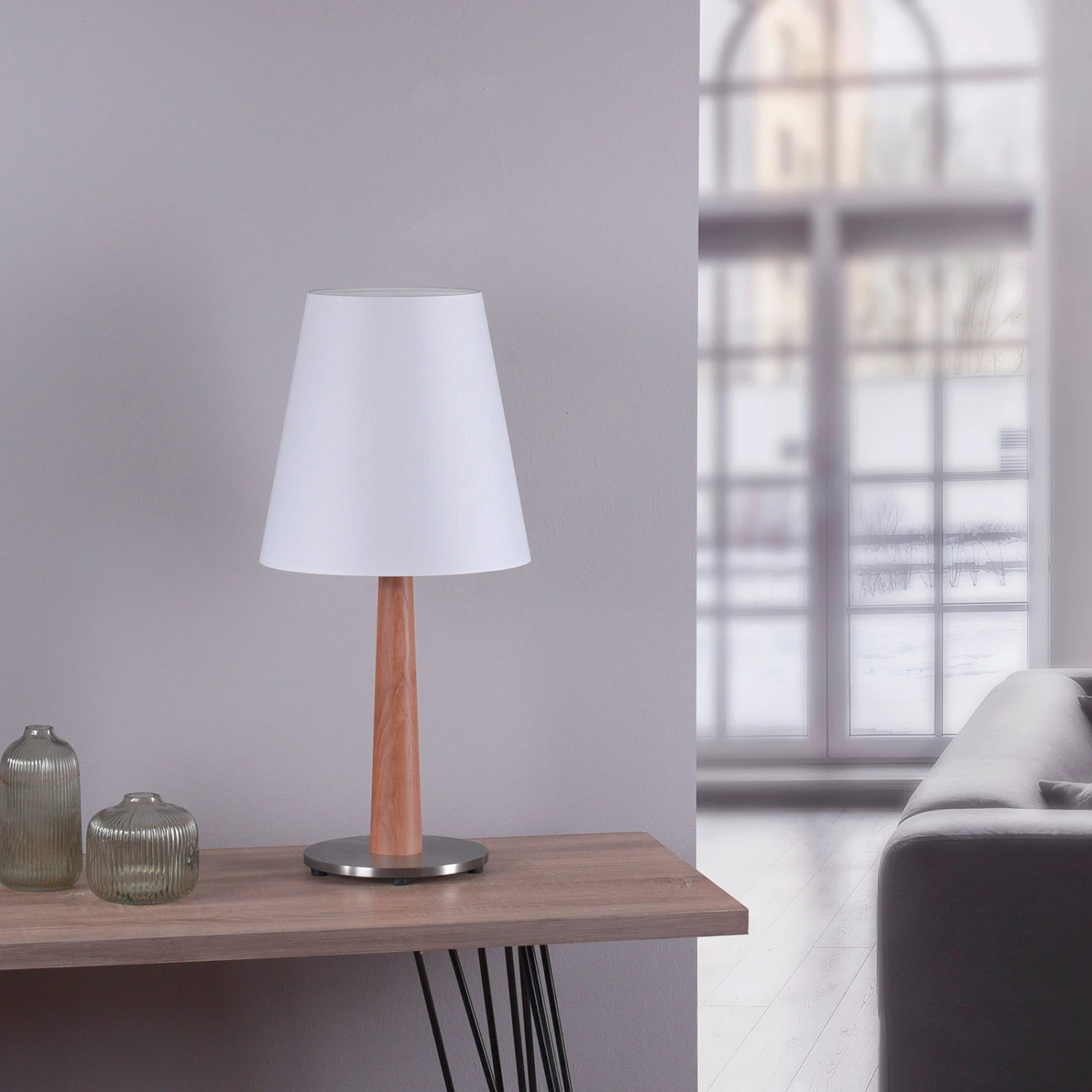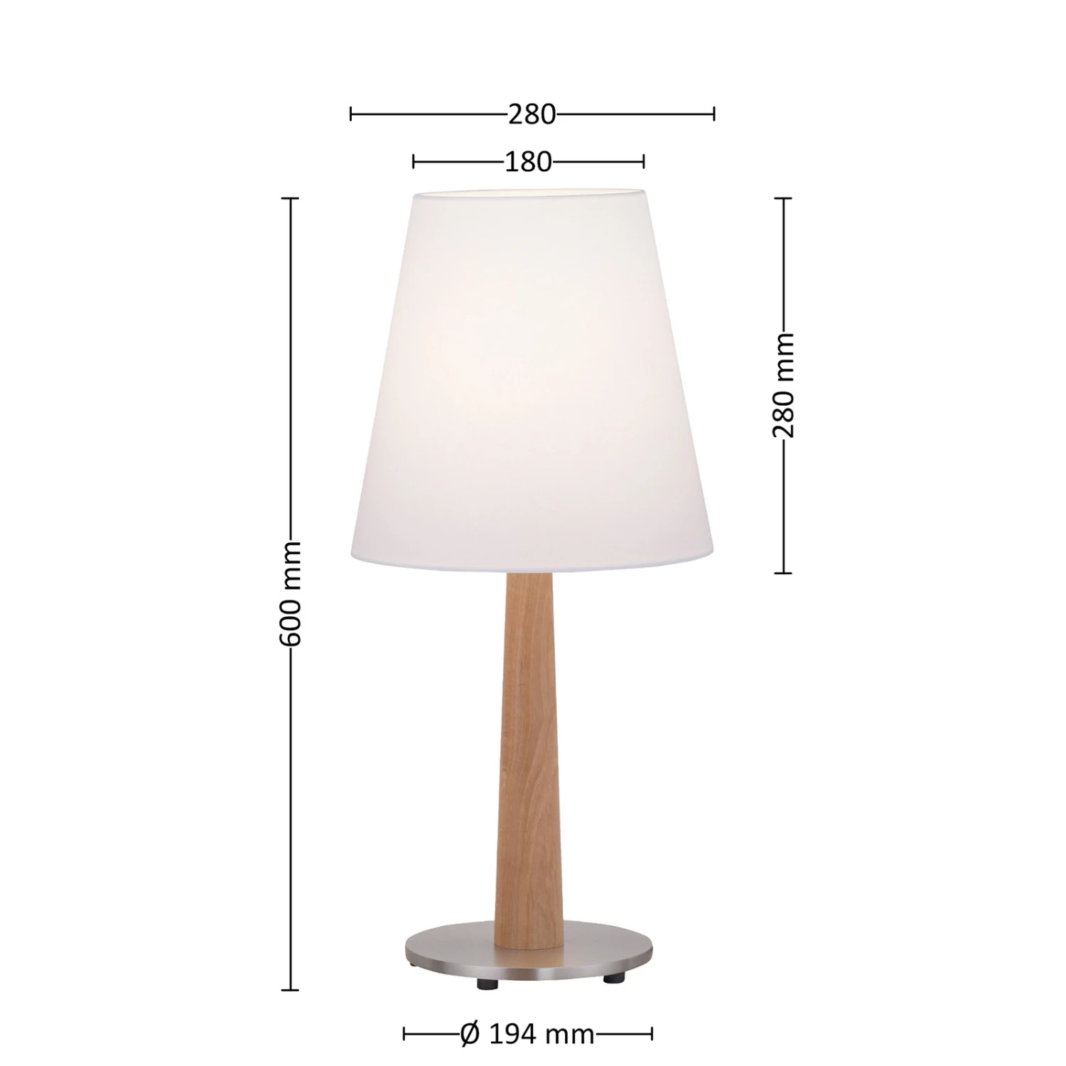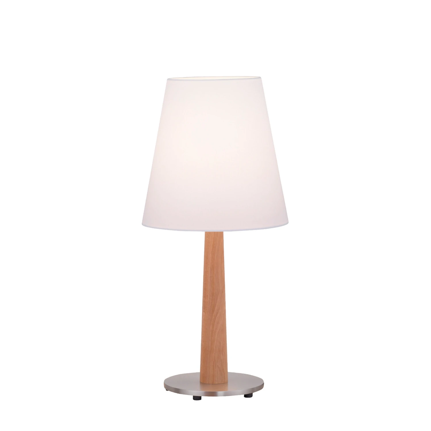 Die elegante Tischleuchte Elif ist mit einem konischen Lampenschirm und einer ebenso kegelförmig gestalteten Holzsäule versehen. Diese Säule besteht aus massivem Eichenholz und wurde aufwändig per Hand bearbeitet. Für die nötige Stabilität und als Abrundung des optischen Eindrucks sorgt ein runder Stahlsockel in Nickel matt.