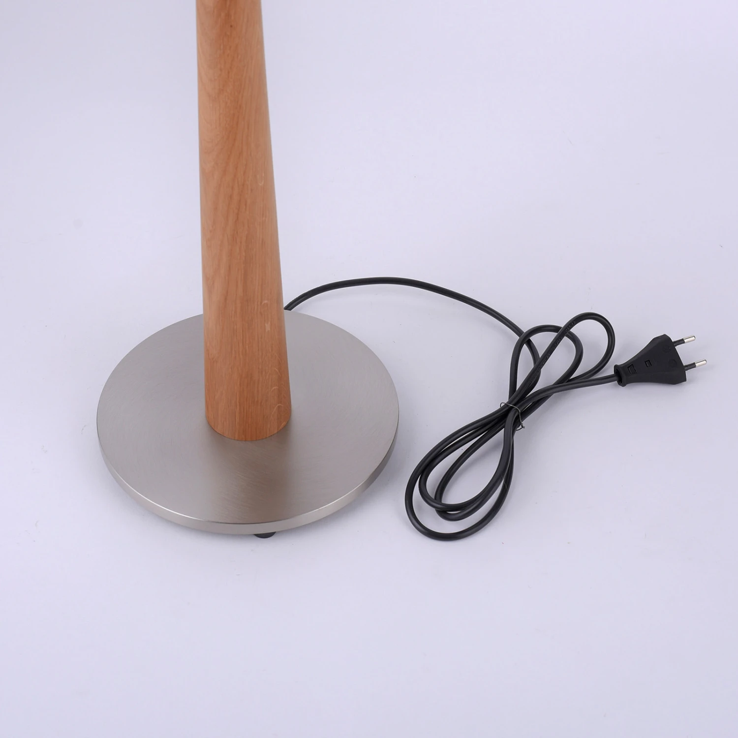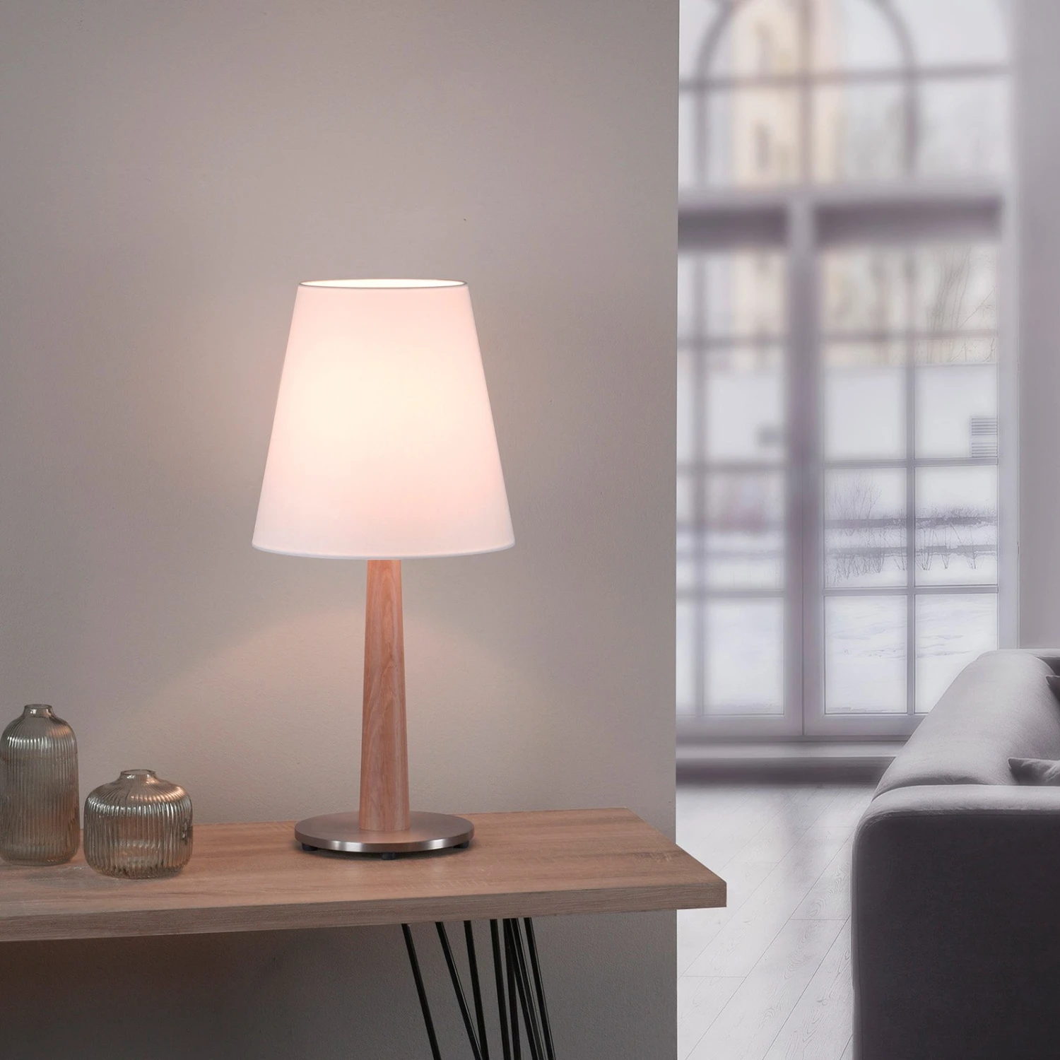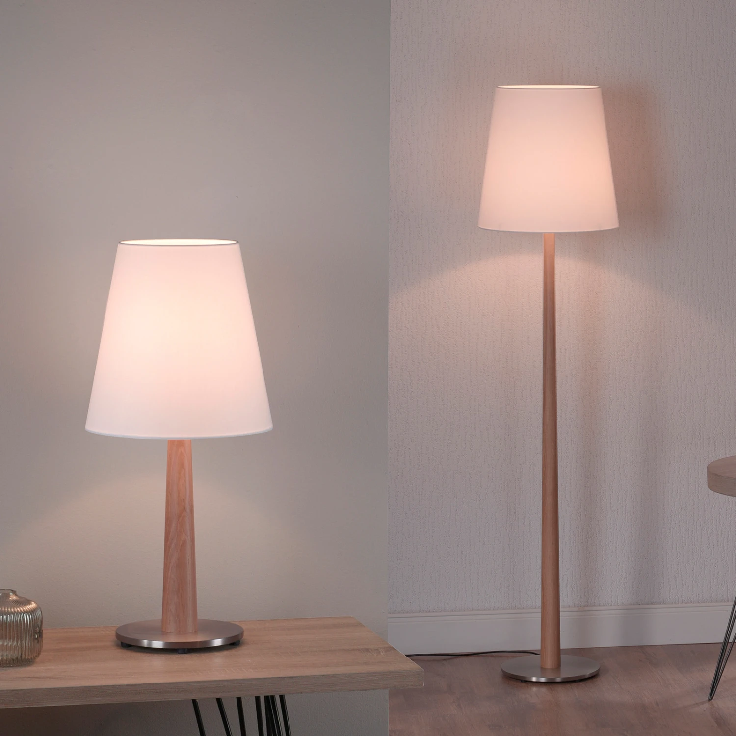 Die elegante Tischleuchte Elif ist mit einem konischen Lampenschirm und einer ebenso kegelförmig gestalteten Holzsäule versehen. Diese Säule besteht aus massivem Eichenholz und wurde aufwändig per Hand bearbeitet. Für die nötige Stabilität und als Abrundung des optischen Eindrucks sorgt ein runder Stahlsockel in Nickel matt.