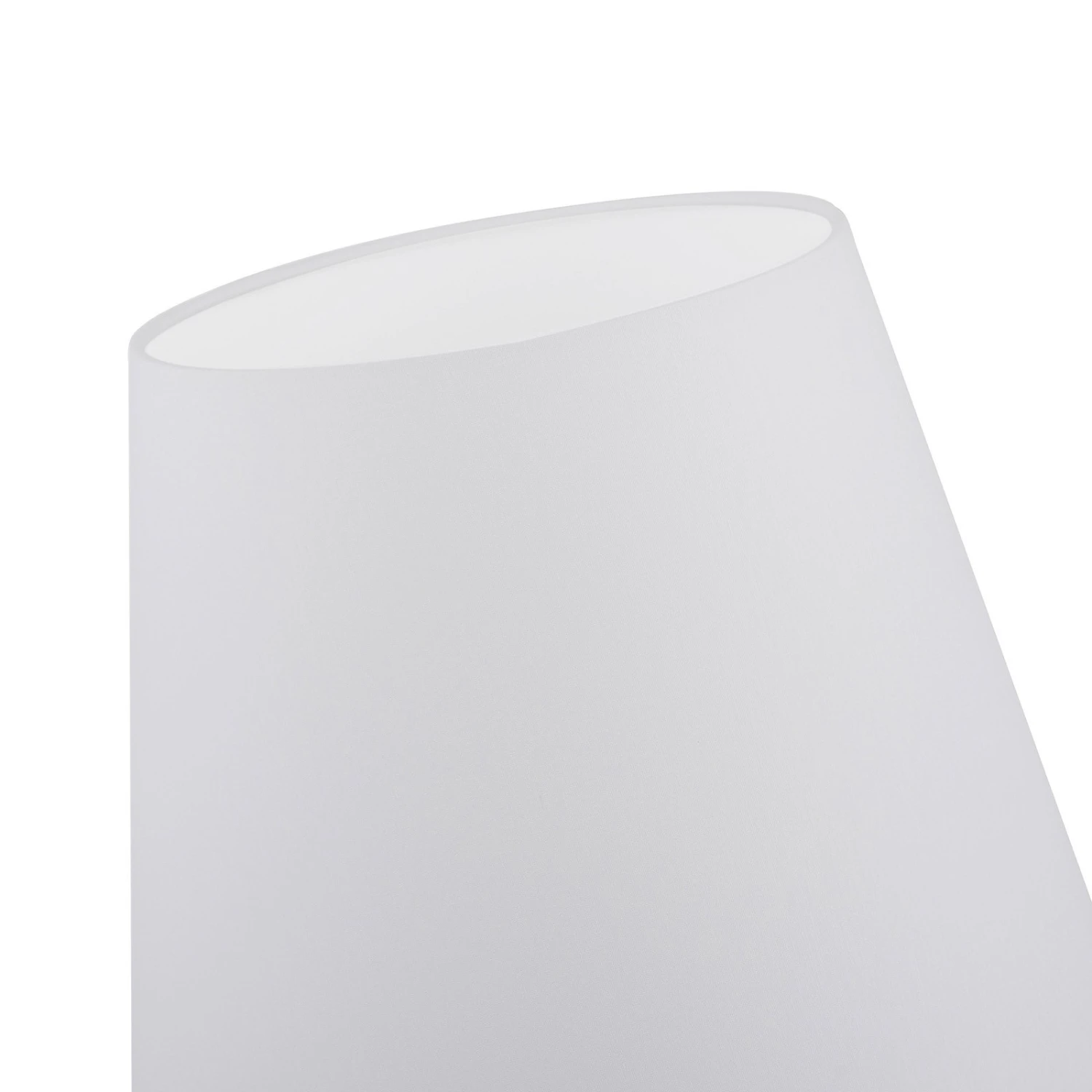 Der Lampenschirm ist aus weißem Chintz und mit einer speziellen Folie veredelt, was ihn schwer entflammbar macht. Die leicht glänzende Optik hebt sich eindrucksvoll vom matten Holz ab und sorgt für einen schönen Kontrast. Bei eingeschalteten Licht gibt der Schirm den Lichtstrahl sanft nach oben und unten hin ab und sorgt so für eine wohlige Atmosphäre und ein angenehmes Zusatzlicht. Ein Kippschalter zum bequemen Ein- und Ausschalten sitzt hierbei direkt unterhalb der Fassung.