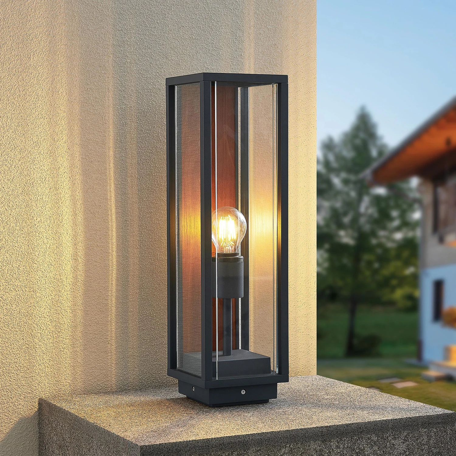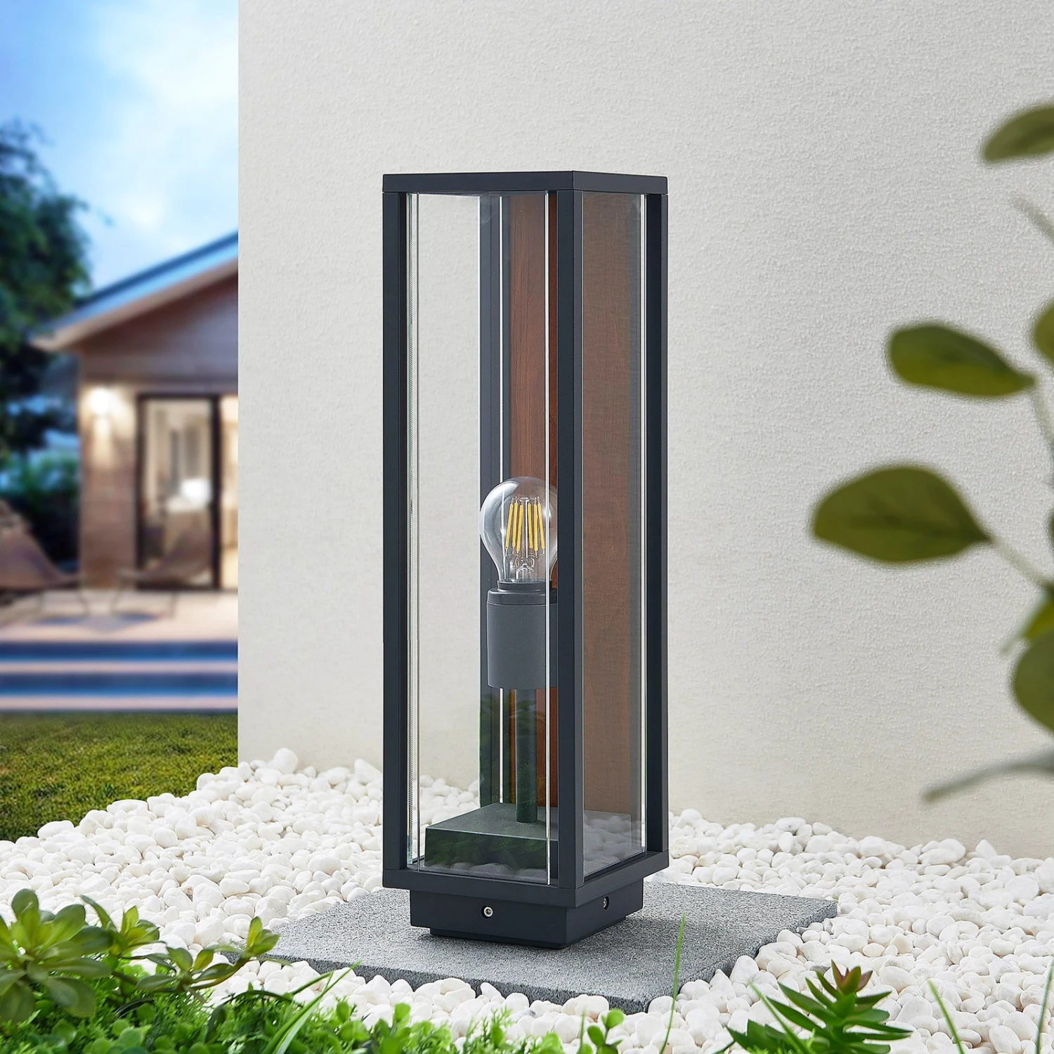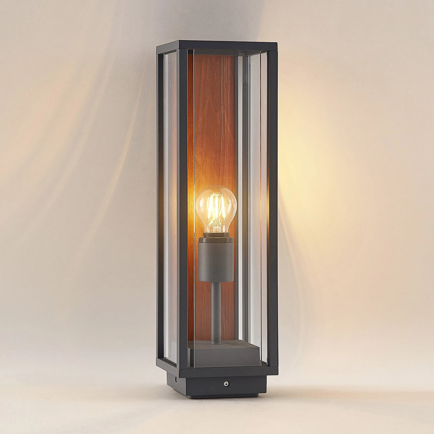 Elwin ist eine Sockellampe, die sich einerseits durch ein sehr modernes Design auszeichnet, andererseits aber auch ein warmtönige Note, weil die Rückwand holzfarben gefärbt ist und diese Optik sehr authentisch aussieht. In die drei anderen Seiten ist klares Glas eingelassen, so dass der Blick auf das Leuchtmittel jederzeit frei ist und dessen Licht ungehindert nach außen austreten kann. Es ist damit auch präsenter Teil der Gesamtoptik und sollte so ausgewählt werden, dass es passend und dekorativ aussieht, wie es für Filament- oder Rustikalampen gilt, die zumeist auf energiesparender LED-Technik basieren. Ein schönes Highlight für den Außenbereich, wo Hof und Garten mit dieser Sockelleuchte schön in Szene gesetzt werden können.