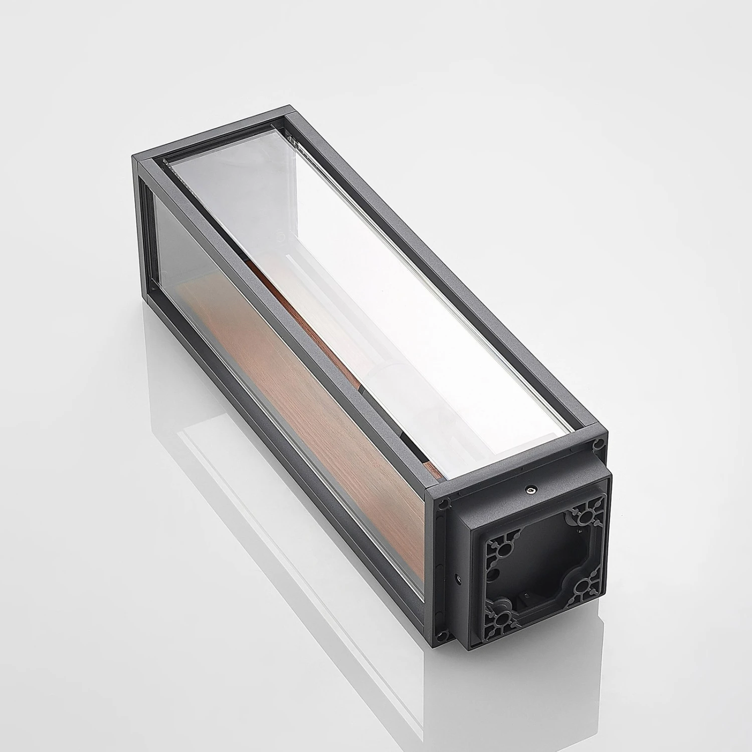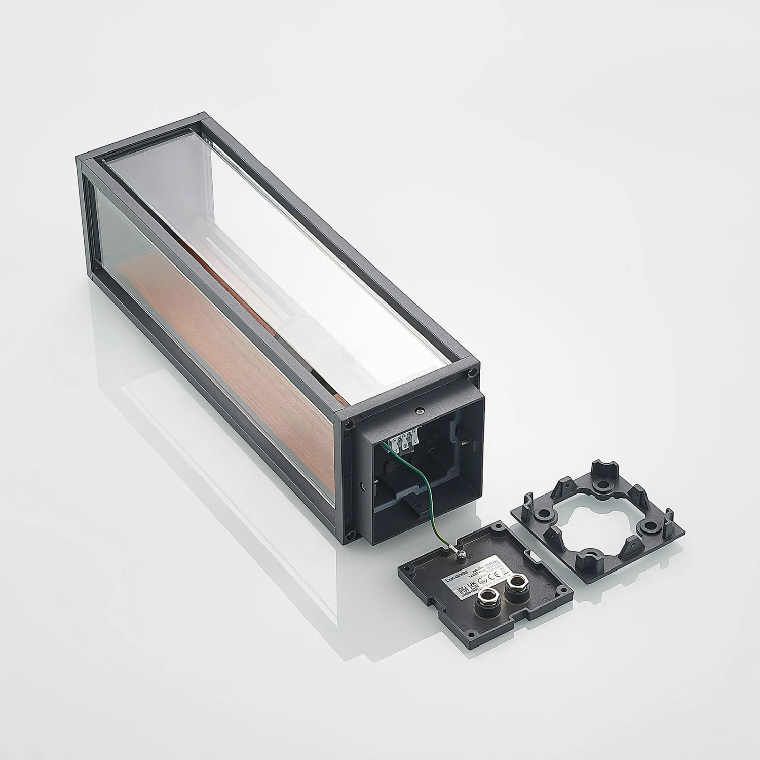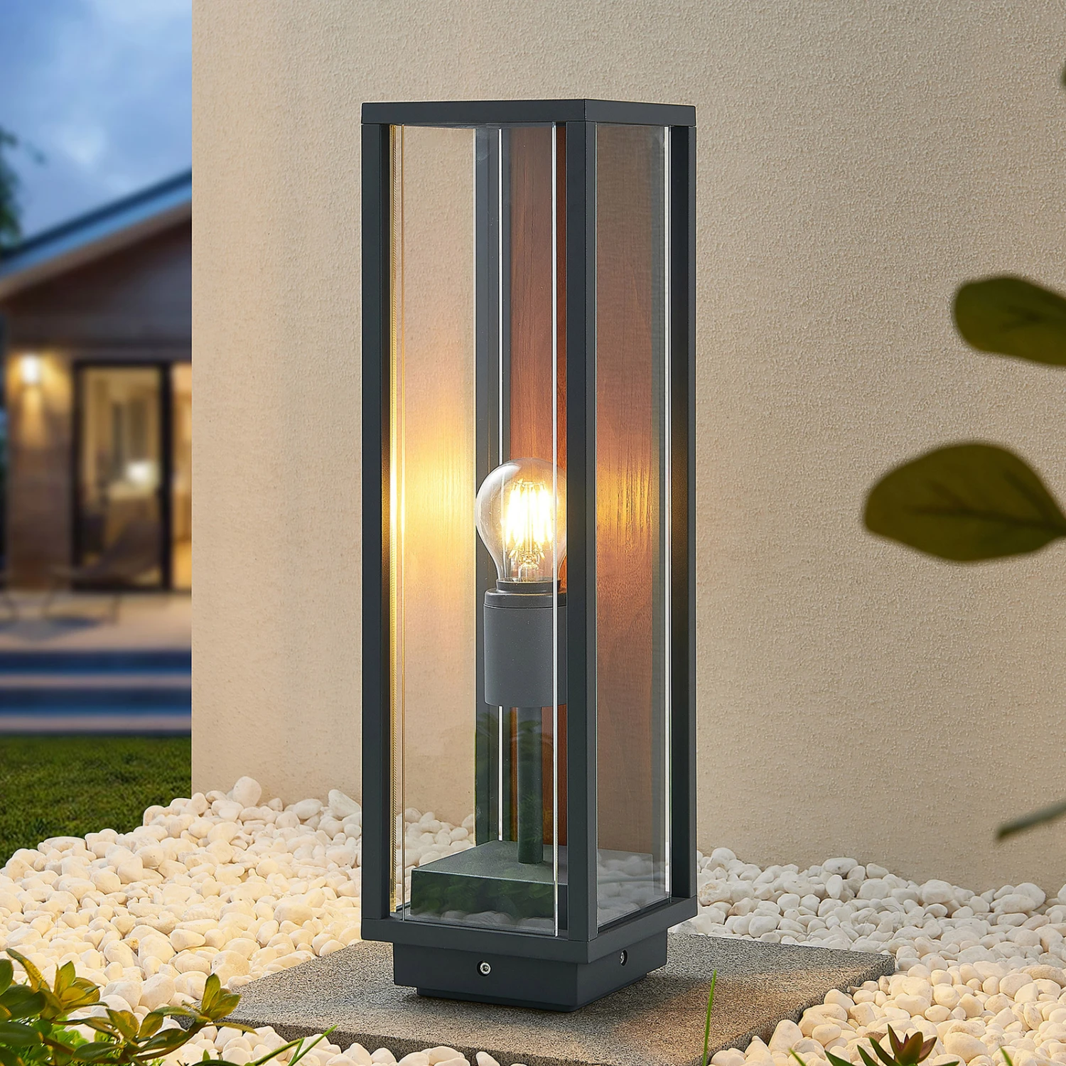 Elwin ist eine Sockellampe, die sich einerseits durch ein sehr modernes Design auszeichnet, andererseits aber auch ein warmtönige Note, weil die Rückwand holzfarben gefärbt ist und diese Optik sehr authentisch aussieht. In die drei anderen Seiten ist klares Glas eingelassen, so dass der Blick auf das Leuchtmittel jederzeit frei ist und dessen Licht ungehindert nach außen austreten kann. Es ist damit auch präsenter Teil der Gesamtoptik und sollte so ausgewählt werden, dass es passend und dekorativ aussieht, wie es für Filament- oder Rustikalampen gilt, die zumeist auf energiesparender LED-Technik basieren. Ein schönes Highlight für den Außenbereich, wo Hof und Garten mit dieser Sockelleuchte schön in Szene gesetzt werden können.