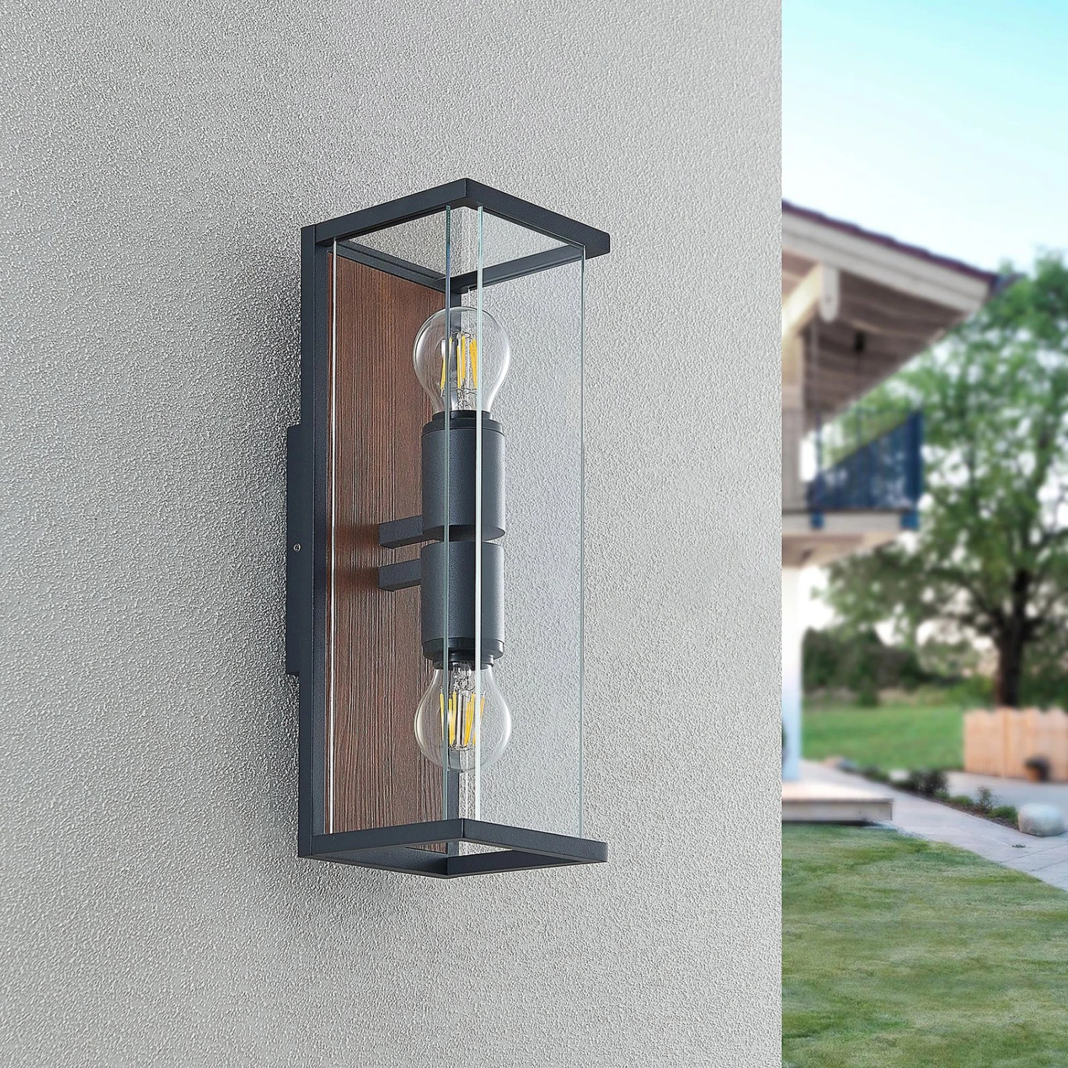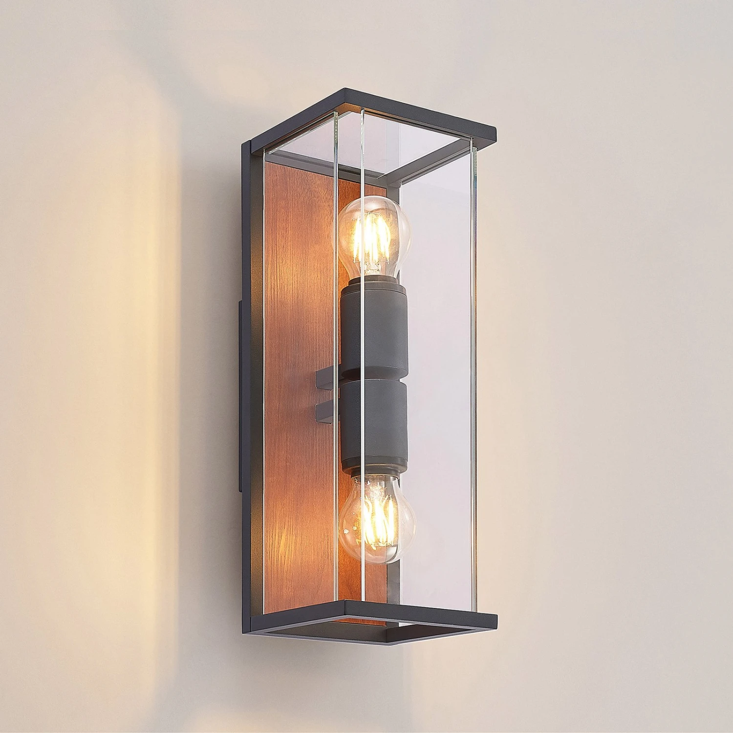 Zweiflammige Außenwandleuchte Elwin mit Klarglaseinsätzen und einem Element in sehenswerter Holzoptik