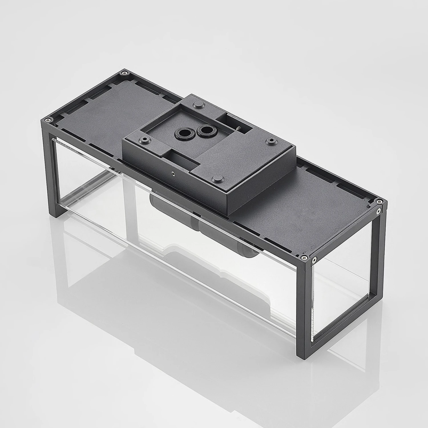 Elwin erscheint besonders geradlinig und eignet sich deshalb gut für moderne Wohnstile und entsprechende Außenumgebungen. Der Korpus besteht aus einem dunkelgrauen Aluminiumdruckgussrahmen und mehreren Einsätzen aus Klarglas. Im hinteren Teil sitzt darüber hinaus ein Element aus einer Art Vinyl, das in dekorativer und sehr authentisch aussehender Holzoptik gehalten ist und das Gesamtdesign so nicht nur verfeinert, sondern ihm auch eine natürliche Note verleiht. Die beiden einzusetzenden Lampen sind gut sichtbar und sollten daher auch auf die Gesamtoptik abgestimmt werden. Sehr empfehlenswert sind deshalb die schönen Filament- oder Rustikalampen, die klassischen Glühlampen nachempfunden worden sind, aber auf effizienter LED-Technik basieren.
