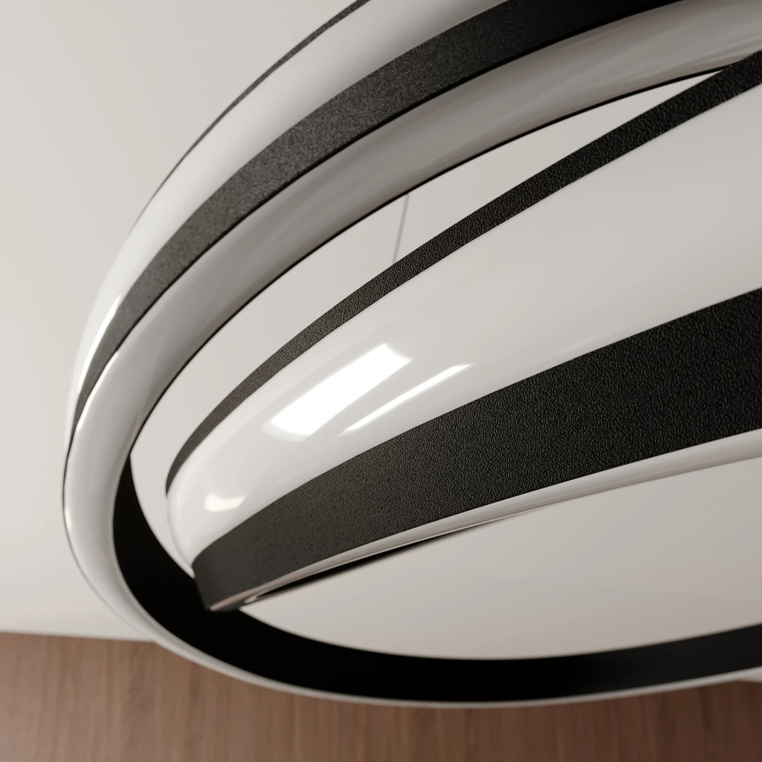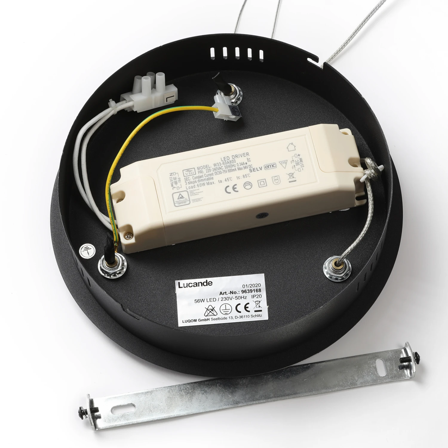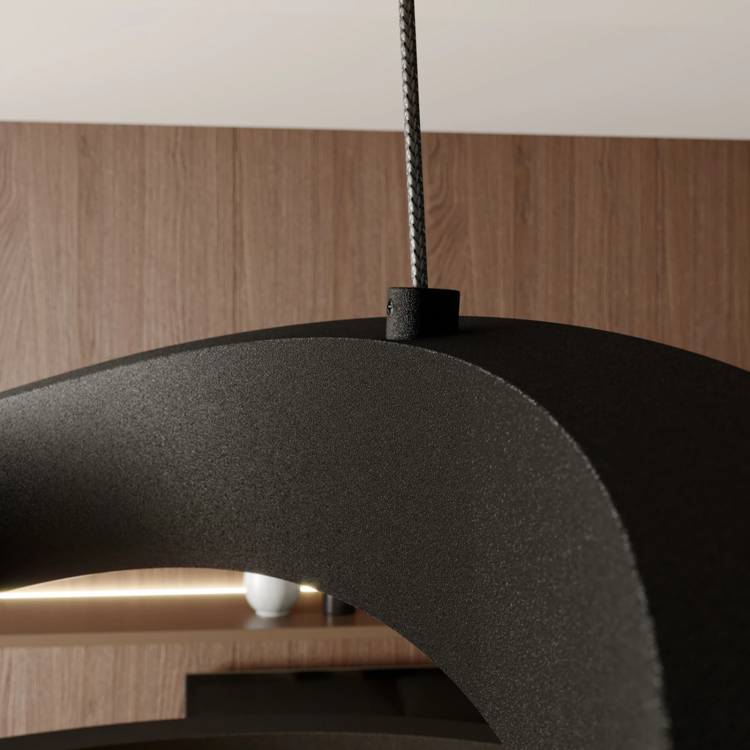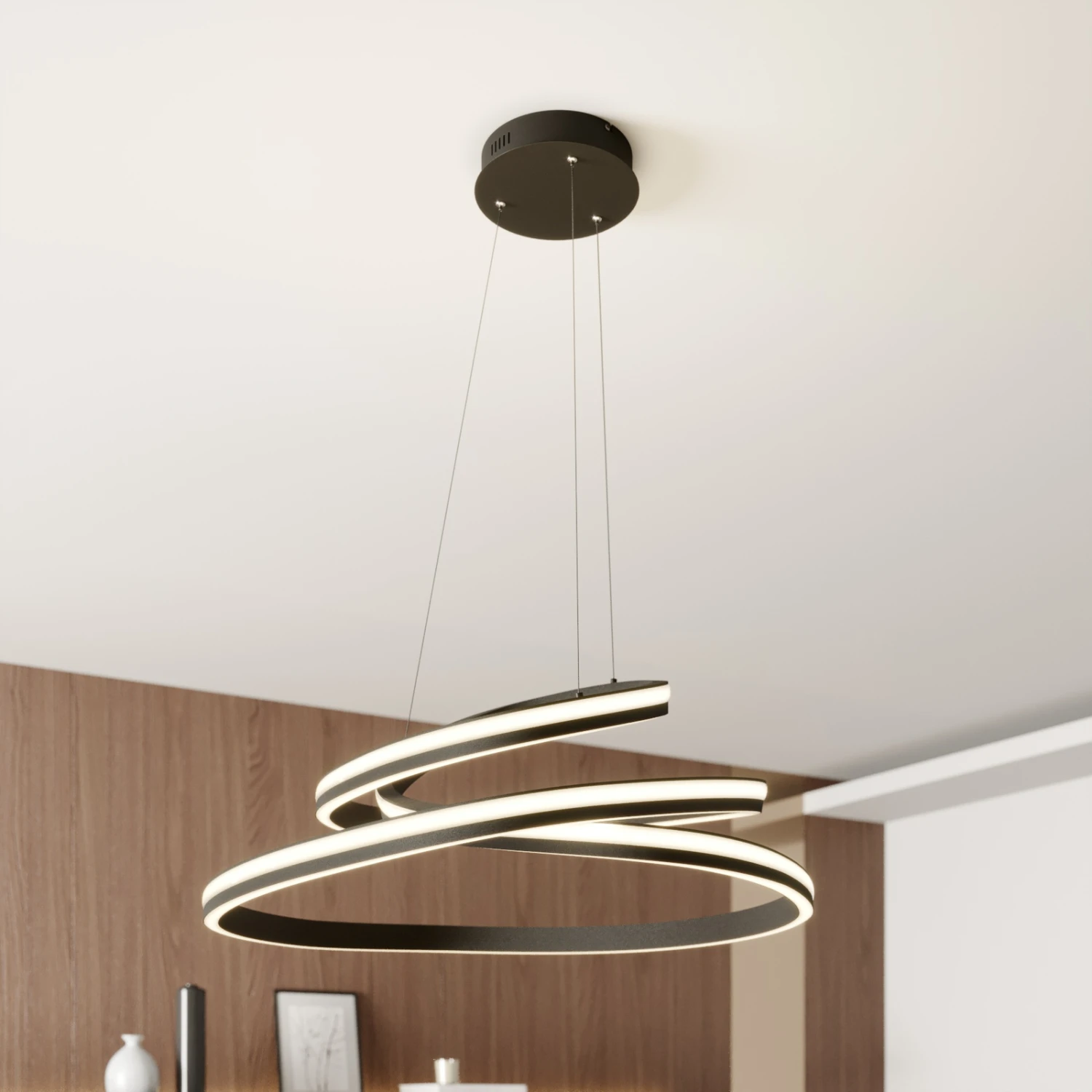Der Schirm der LED-Pendelleuchte Emlyn scheint im Raum zu schweben, da die Seile, an denen der Schirm befestigt ist, sehr dünn und kaum zu sehen sind. Der Schirm selbst ist so kunstvoll verdreht, dass unwillkürlich an eine Spirale gedacht wird. Die weiße Abdeckung der LEDs aus Silikon wird hervorragend durch das schwarz satinierte Metall ergänzt. Diese Leuchte empfiehlt sich für einen modernen Wohnstil. Mit dem üblichen Wandschalter lässt sich die Leuchte in den folgenden Stufen dimmen: 100%, 50% und 10%.
