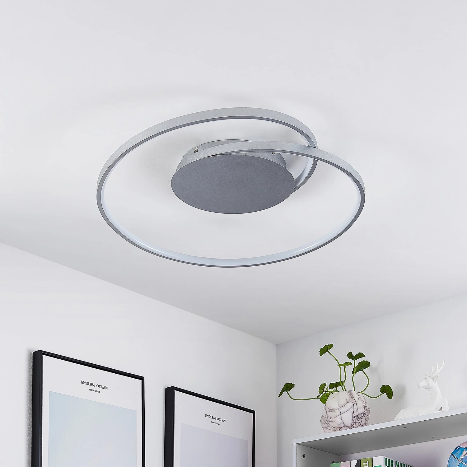 Die LED-Deckenleuchte Enesa kommt in einem runden, modischen Design und ist aus Aluminium und Eisen gefertigt. Ihr Äußeres besteht aus einer schlanken Strebe, welche sich um sich selbst bewegt und festverbaute LEDs trägt. Diese LEDs lassen sich mühelos mit einer Fernbedienung oder einem Wandschalter steuern. Diese sorgen immer für das passende Licht, da ihre Lichtfarbe verstellt werden kann (2.700 K, 4.000 K und 6.500 K) und darüber hinaus lässt sich ihre Helligkeit stufenlos dimmen (14% – 100%). Durch die praktische Memory-Funktion lassen sich vorher getätigte Einstellungen mühelos speichern und das macht die LED-Deckenleuchte Enesa zu einer noch praktischeren Begleiterin. Auch in dunkleren Stunden sorgt sie für das richtige Licht, da sie über einen Nachtmodus verfügt. Das stilvolle Design setzt dezente Akzente an Wohnungsdecken und integriert sich mühelos in moderne Einrichtungsstile.