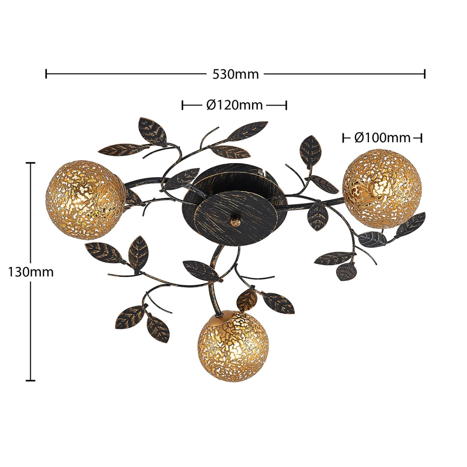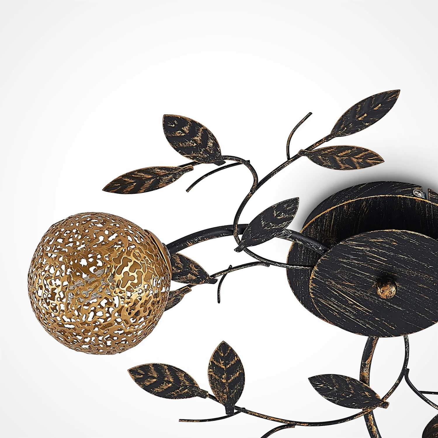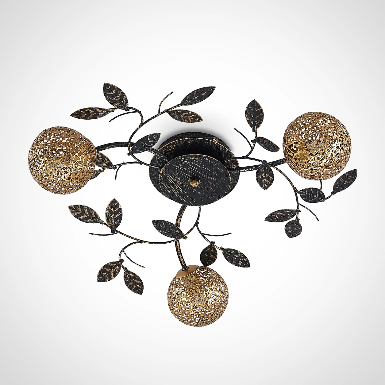 Die Deckenleuchte Evory besteht aus einer runden Deckenplatte, An dieser befinden sich drei Leuchtenarme, die über je einen runden Lampenschirm verfügen. Diese Leuchtenarme ragen verspielt in den Raum hinein. Zudem wurden sie mit feinen Blättern dekoriert, sodass sie an Blumenranken erinnert. Die Lampenschirme sind kugelförmig und mit einem filigranen Muster ausgestattet. Dieses Muster verleiht der Leuchte eine orientalische Note. In Kombination mit den Blättern wird Evory so zu einem ausgefallenen und verspielten Hingucker.