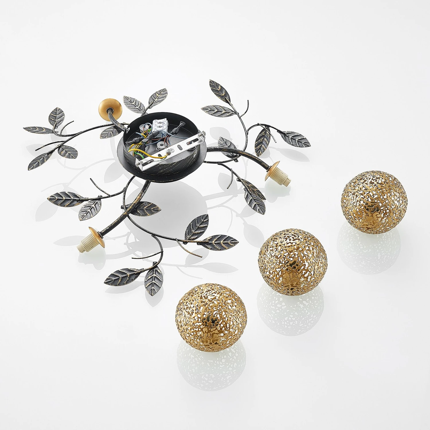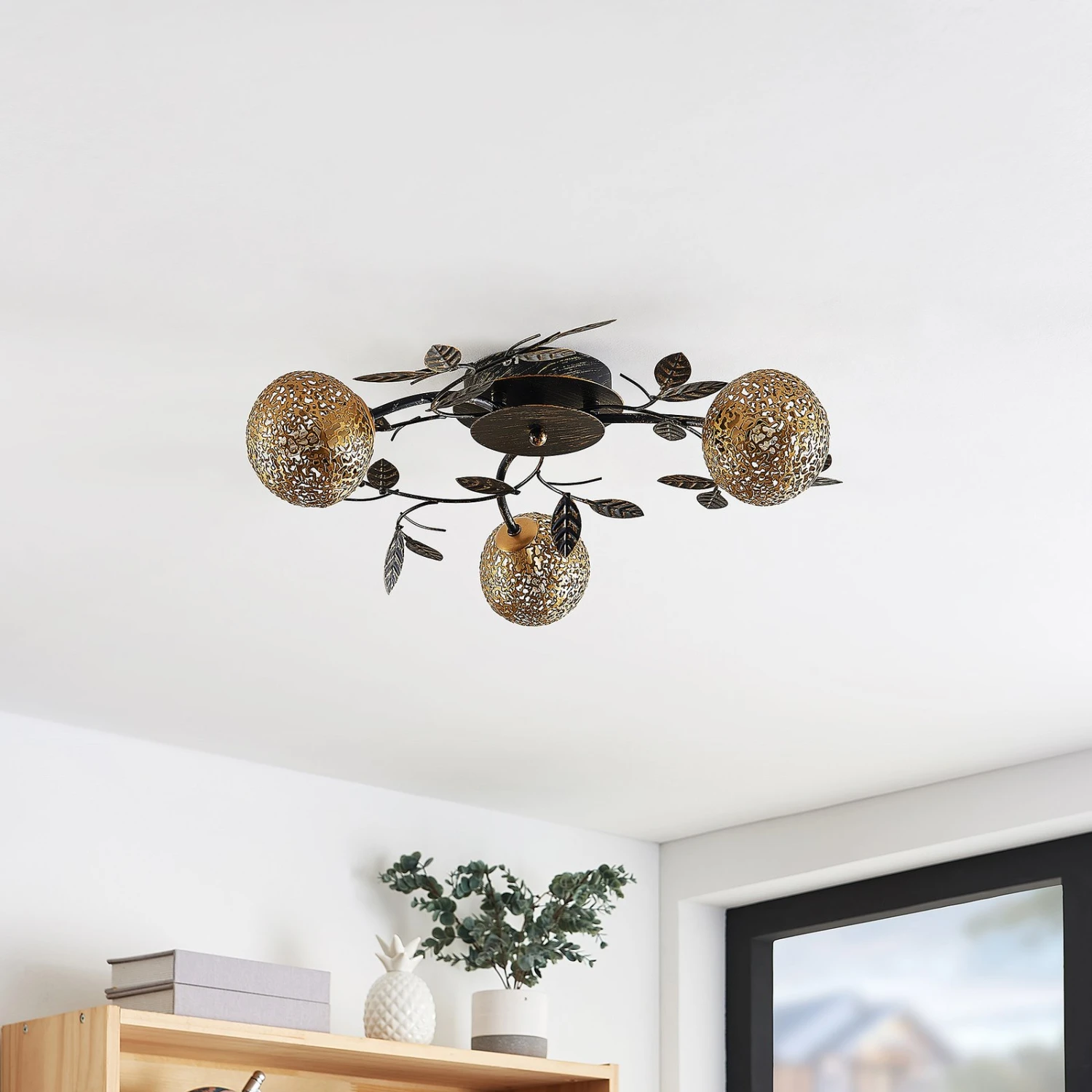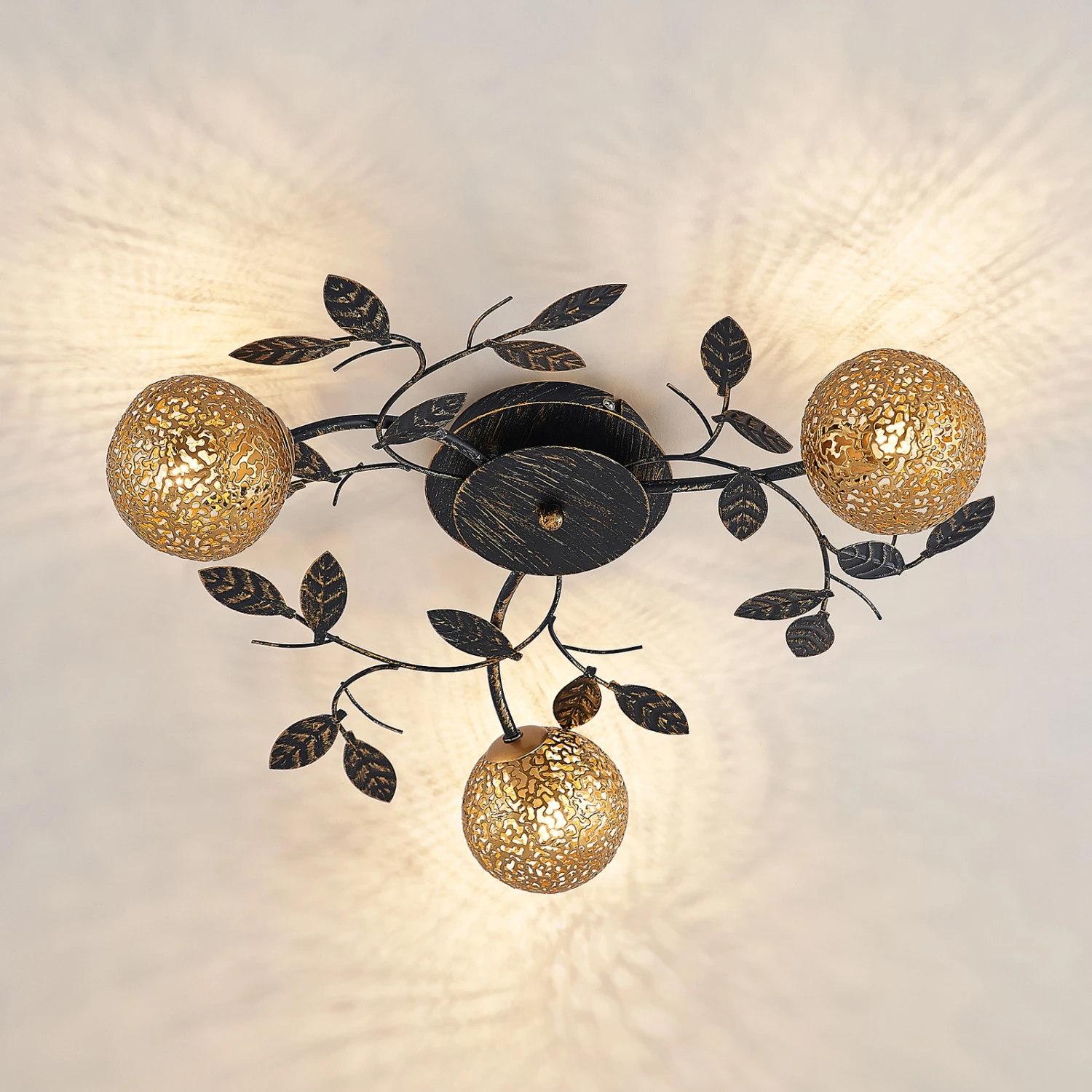 Die Deckenleuchte Evory besteht aus einer runden Deckenplatte, An dieser befinden sich drei Leuchtenarme, die über je einen runden Lampenschirm verfügen. Diese Leuchtenarme ragen verspielt in den Raum hinein. Zudem wurden sie mit feinen Blättern dekoriert, sodass sie an Blumenranken erinnert. Die Lampenschirme sind kugelförmig und mit einem filigranen Muster ausgestattet. Dieses Muster verleiht der Leuchte eine orientalische Note. In Kombination mit den Blättern wird Evory so zu einem ausgefallenen und verspielten Hingucker.
