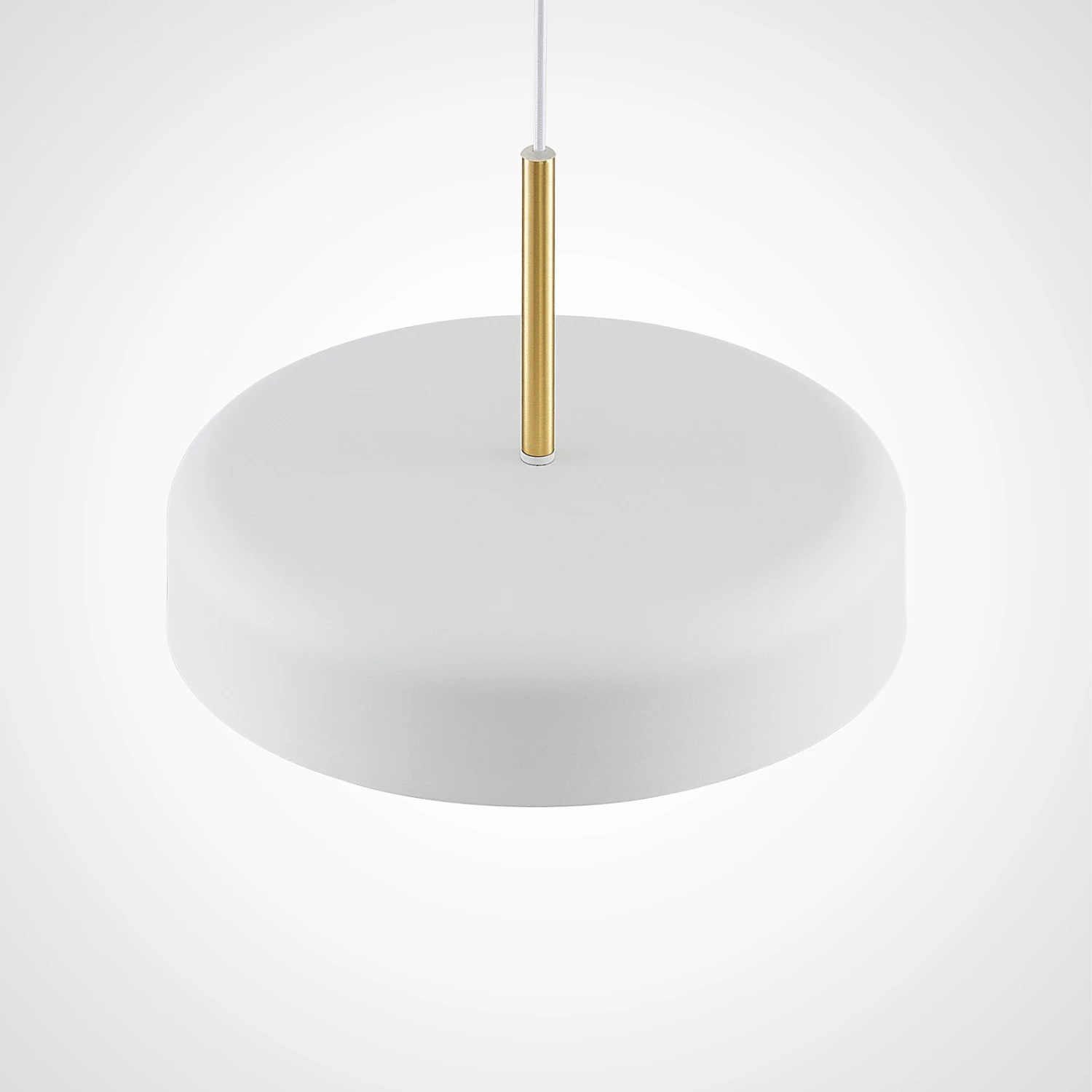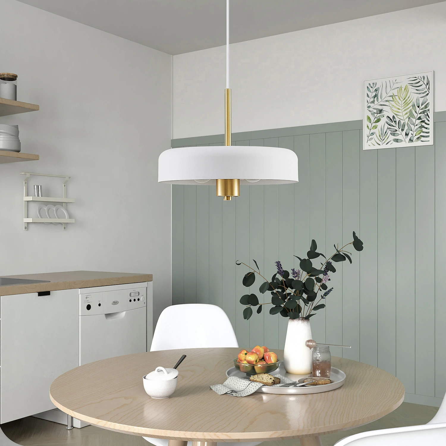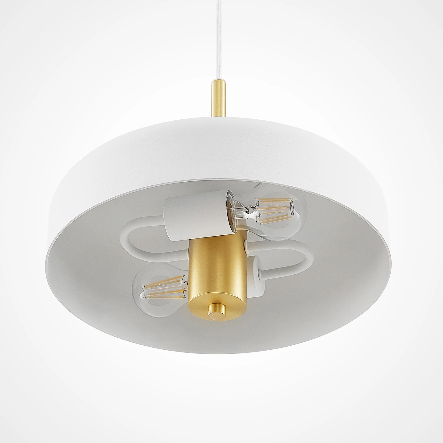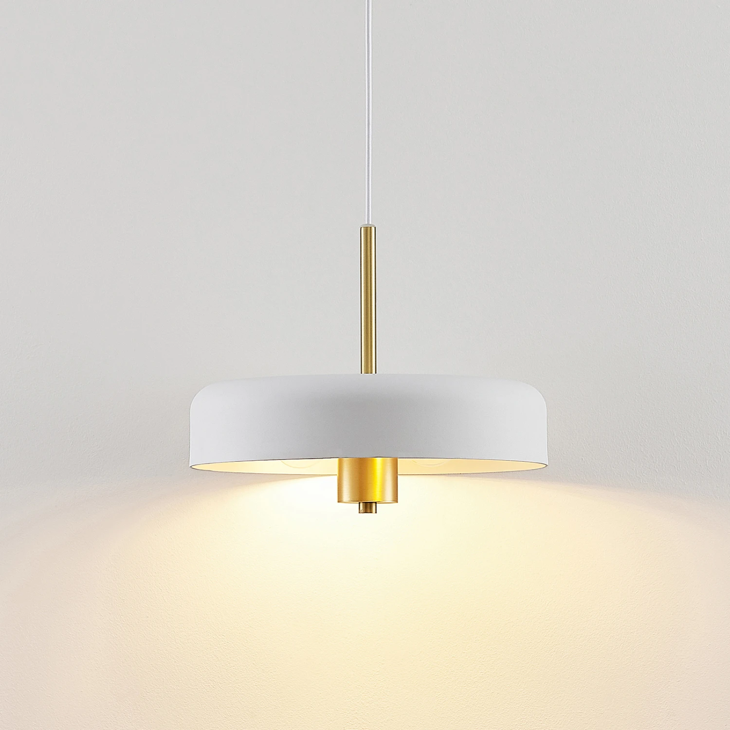 Weiße Design-Pendelleuchte Filoreta mit rundem Metallschirm und messingfarbenen Details – perfekt über dem Tisch in der Küche