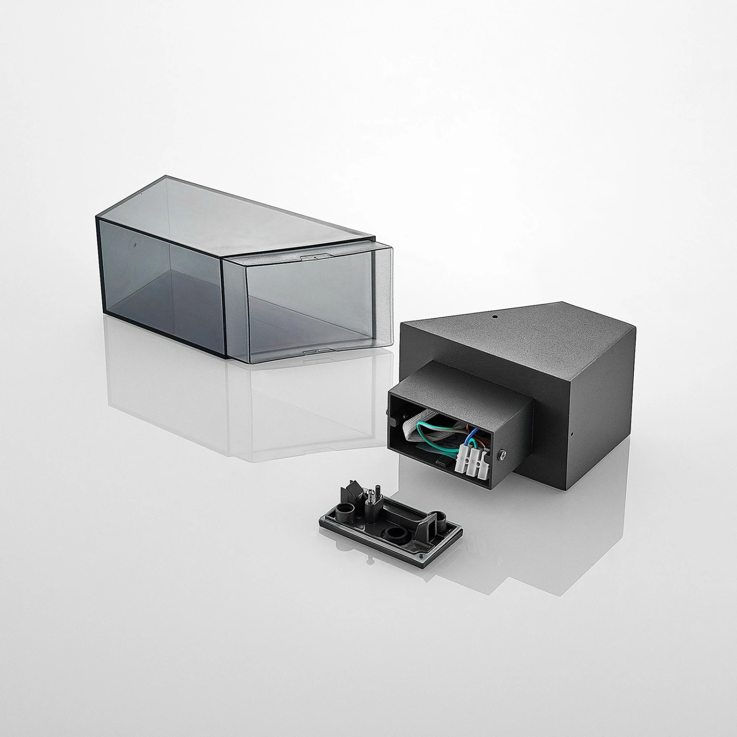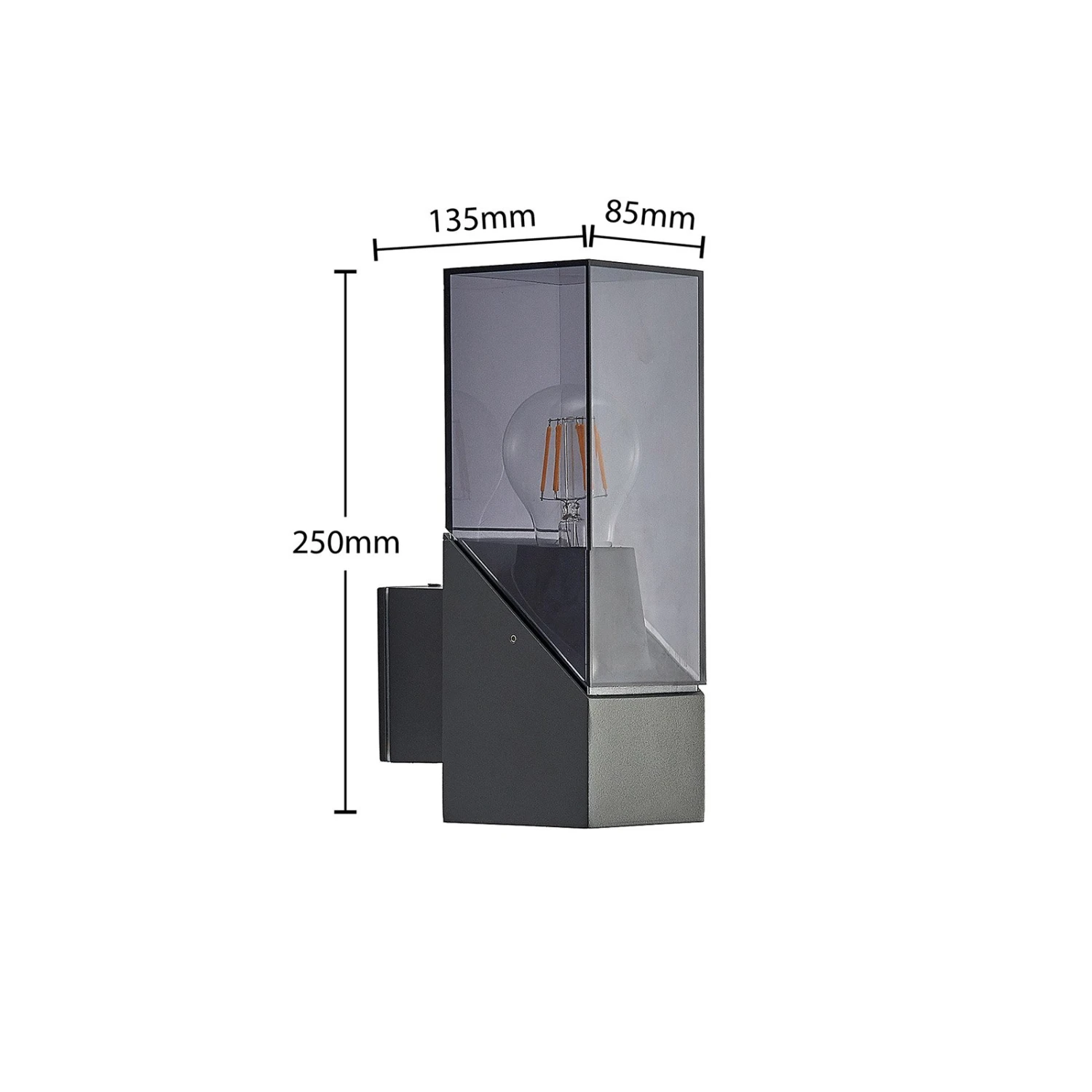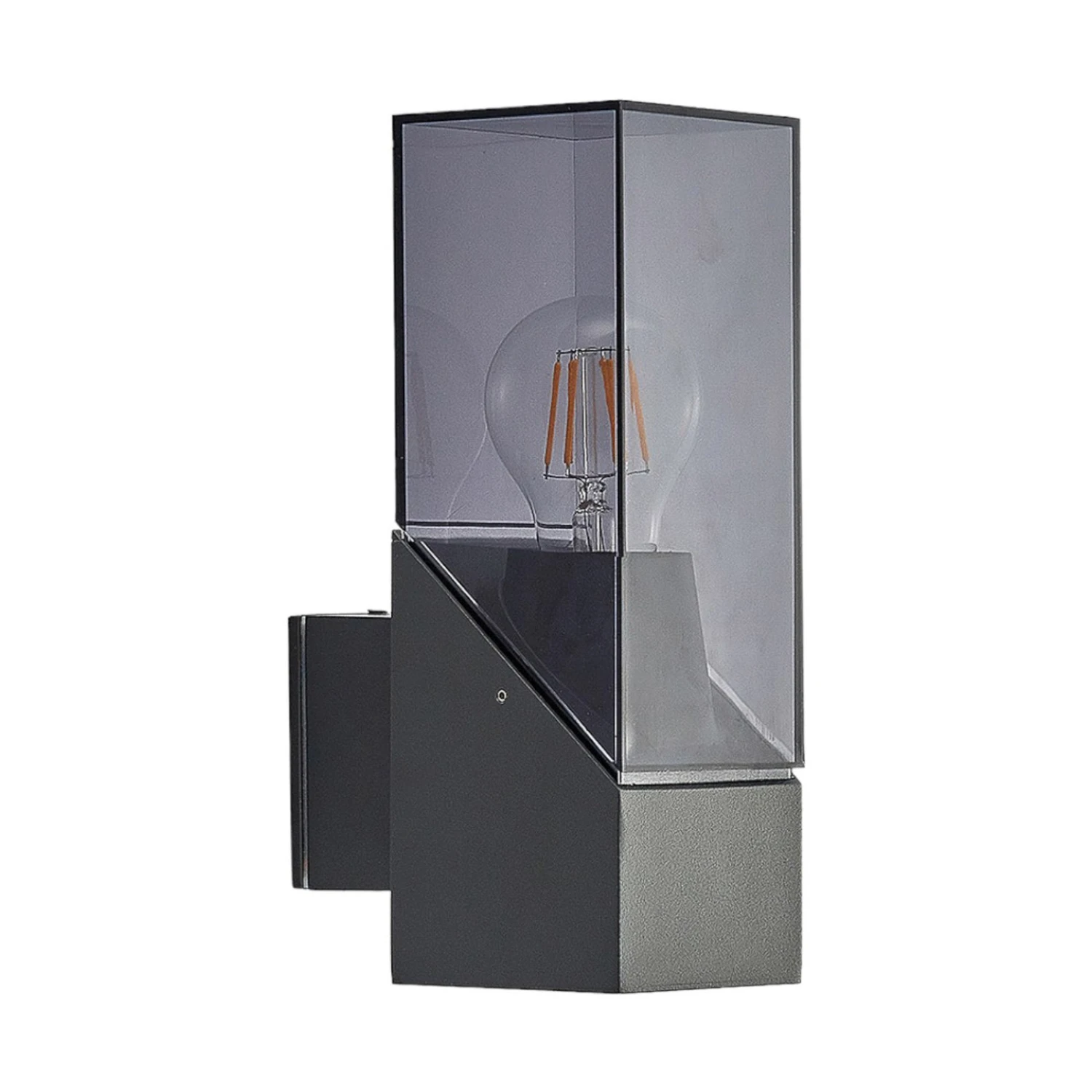 Gutes und ausreichend helles Licht für den Außenbereich bietet die moderne Wandleuchte Fiola. Sie kann zum Beispiel eingesetzt werden im Bereich der Eingangstür, der Kellertreppe oder auch am Balkon oder dem Gartenhäuschen, also überall dort, wo in den Abendstunden Licht für eine bessere Orientierung und zur Sicherheit benötigt wird. Der Korpus der Außenleuchte Fiola ist aus dunkelgrauem Aluminium gefertigt, der mit einem transprarenten, leicht rauchgrauem Schirm aus Kunststoff geschickt kombiniert wird. Das Leuchtmittel, welches hier offen gezeigt wird, ist idealerweise eine dekorative Filament- oder Retrofit-Lampe.