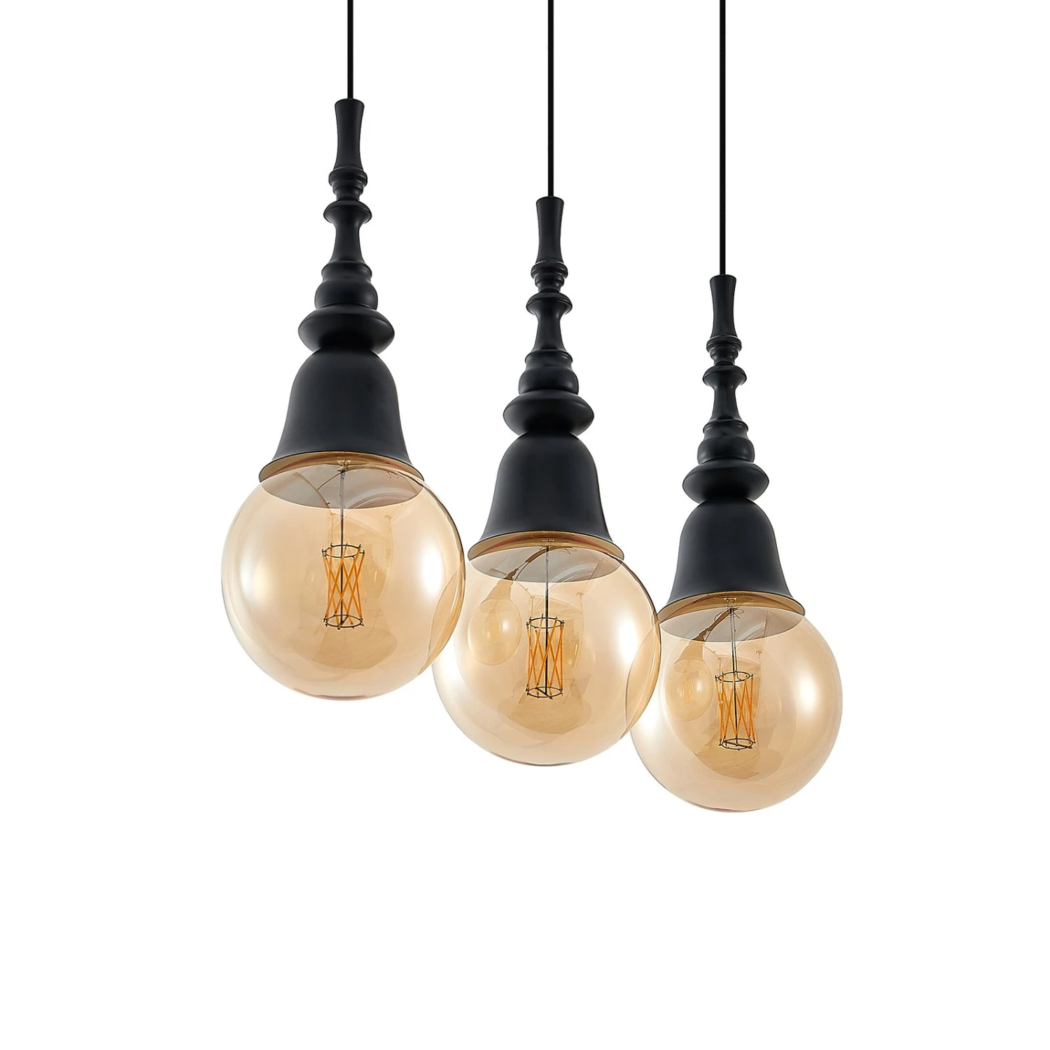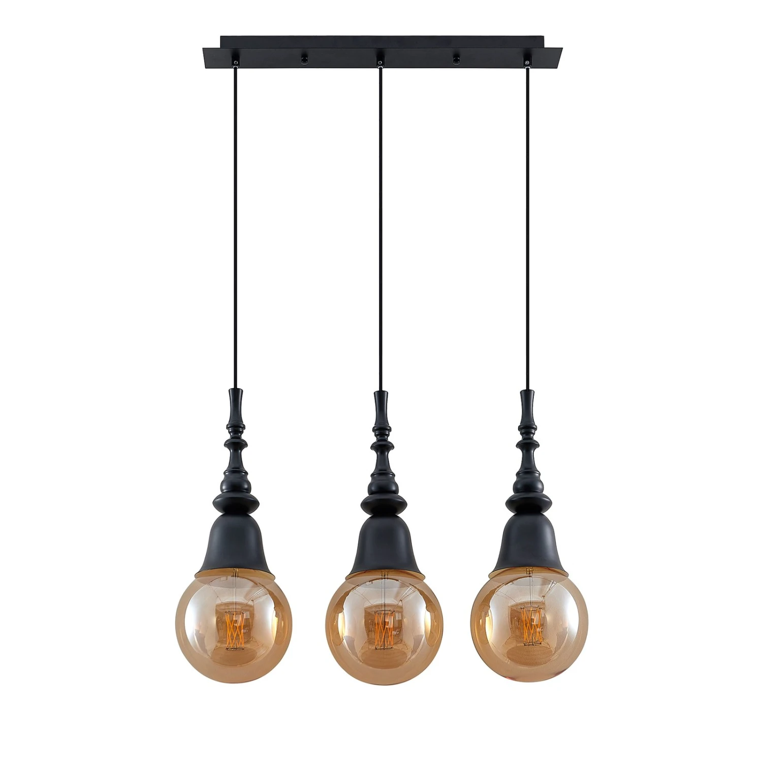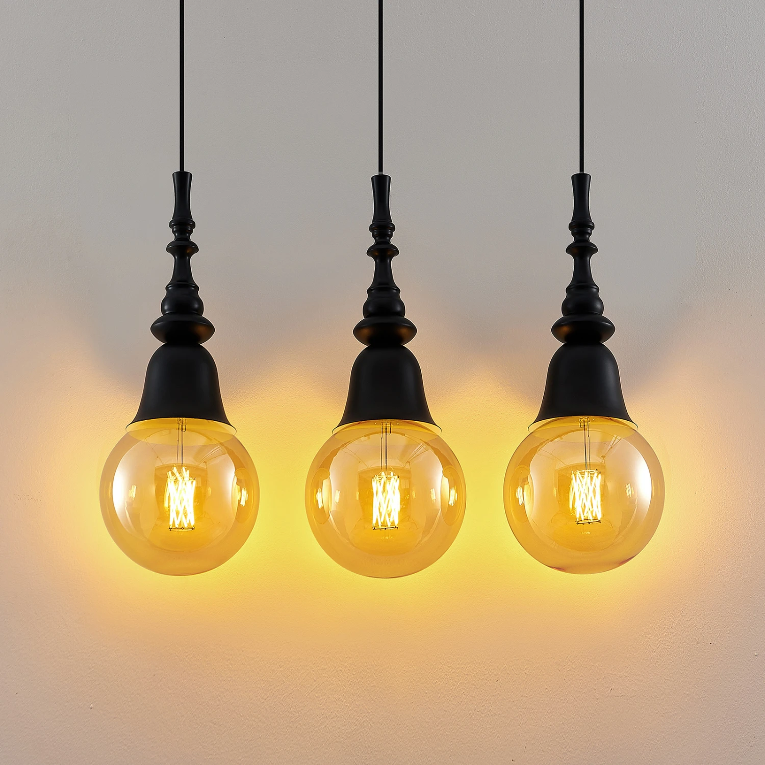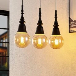 Gesja ist eine Hängelampe in dreiflammiger Ausführung und mit einer länglichen Balkenform, die sehr gut zur Tischbeleuchtung eingesetzt werden kann. Sie besitzt keine Schirme, sondern vergrößerte Fassungen, die Kelchen gleichen und deren Formen etwas Barockes besitzen. Das Leuchtmittel wird daher zum präsenten Bestandteil der Gesamtoptik und statt dem normalen Glühlampenformat sollten Lampen in Globeform (G125) eingesetzt werden, die größer sind und das Gesamtdesign sehr passend vervollständigen und etwas opulenter erscheinen lassen. Bei aller Nostalgie, die von Gesja ausgeht, besitzt die Pendellampe aber auch eine moderne Note, so dass die schwarze Leuchte durchaus für zeitgemäße Einrichtungen gut geeignet ist.
