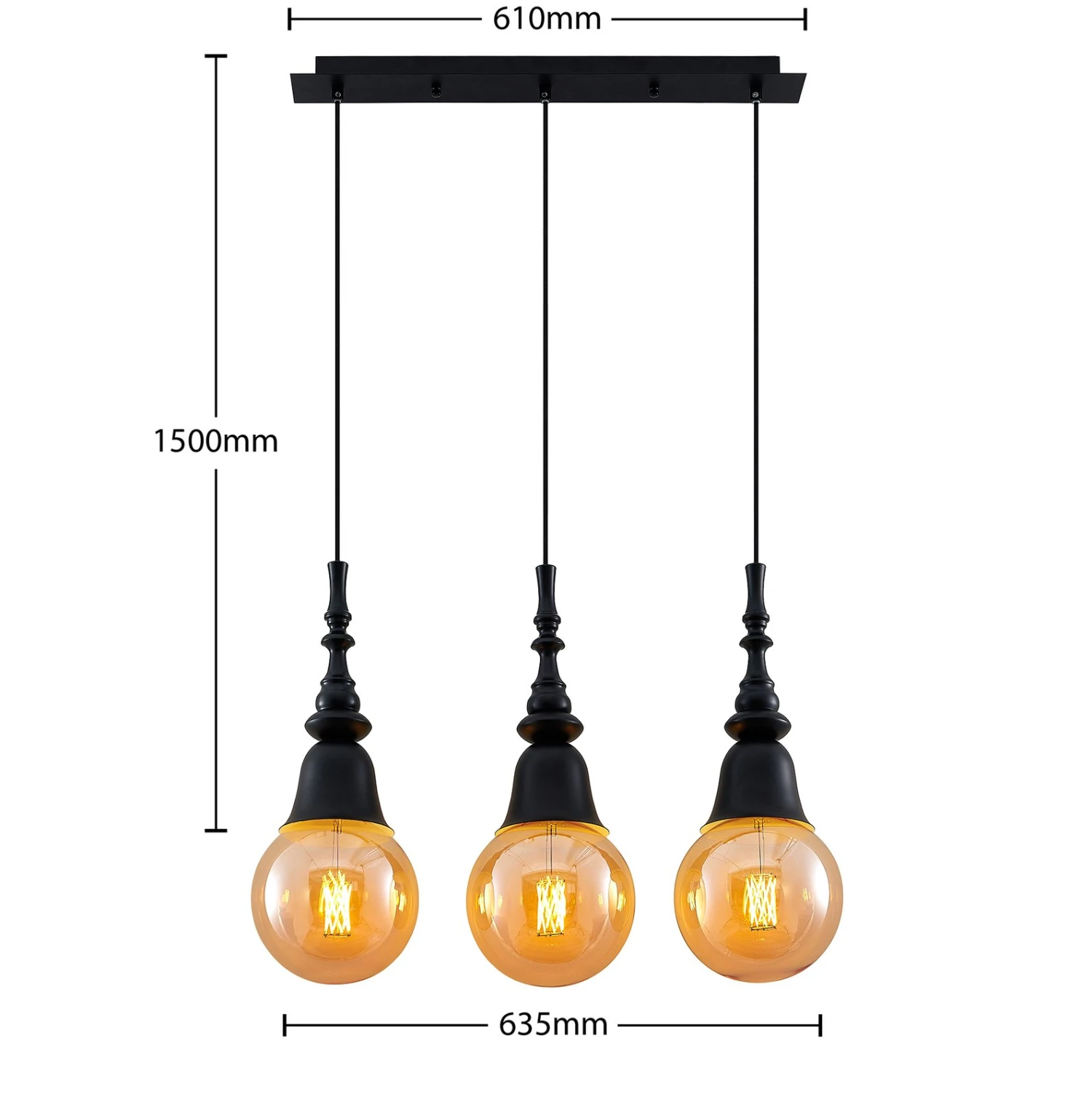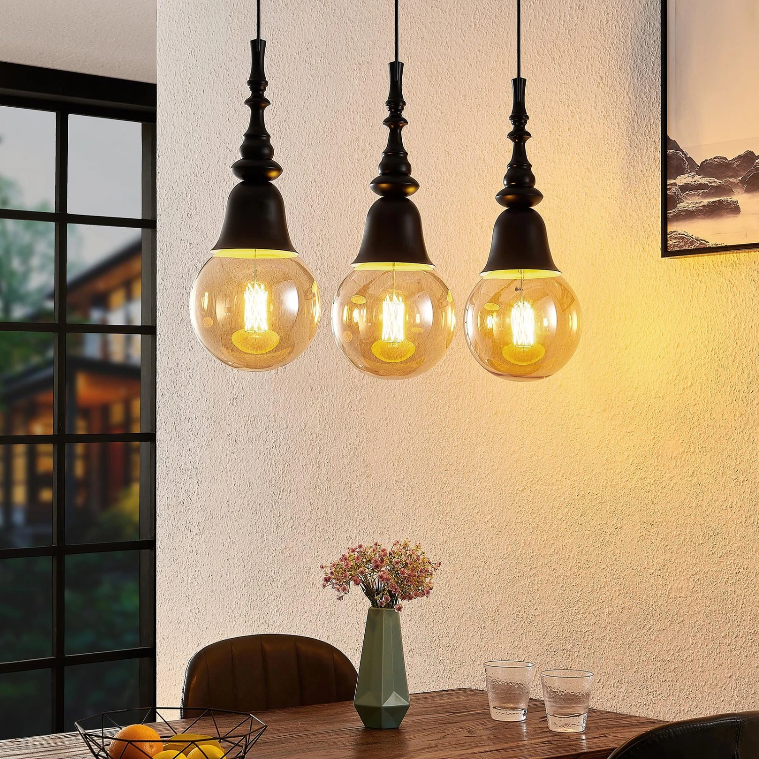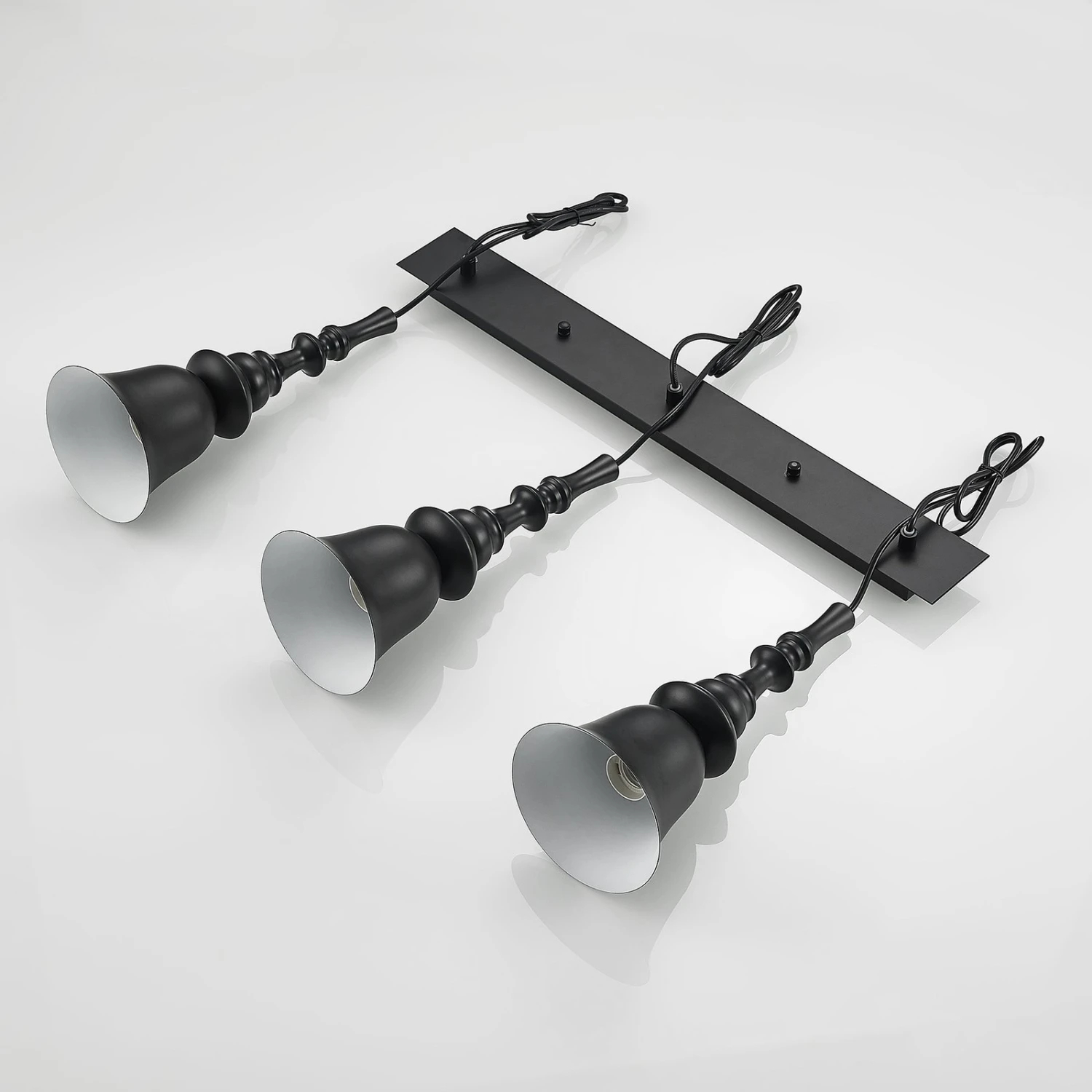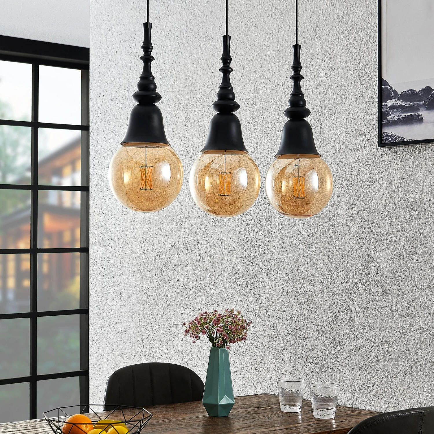Gesja ist eine Hängelampe in dreiflammiger Ausführung und mit einer länglichen Balkenform, die sehr gut zur Tischbeleuchtung eingesetzt werden kann. Sie besitzt keine Schirme, sondern vergrößerte Fassungen, die Kelchen gleichen und deren Formen etwas Barockes besitzen. Das Leuchtmittel wird daher zum präsenten Bestandteil der Gesamtoptik und statt dem normalen Glühlampenformat sollten Lampen in Globeform (G125) eingesetzt werden, die größer sind und das Gesamtdesign sehr passend vervollständigen und etwas opulenter erscheinen lassen. Bei aller Nostalgie, die von Gesja ausgeht, besitzt die Pendellampe aber auch eine moderne Note, so dass die schwarze Leuchte durchaus für zeitgemäße Einrichtungen gut geeignet ist.